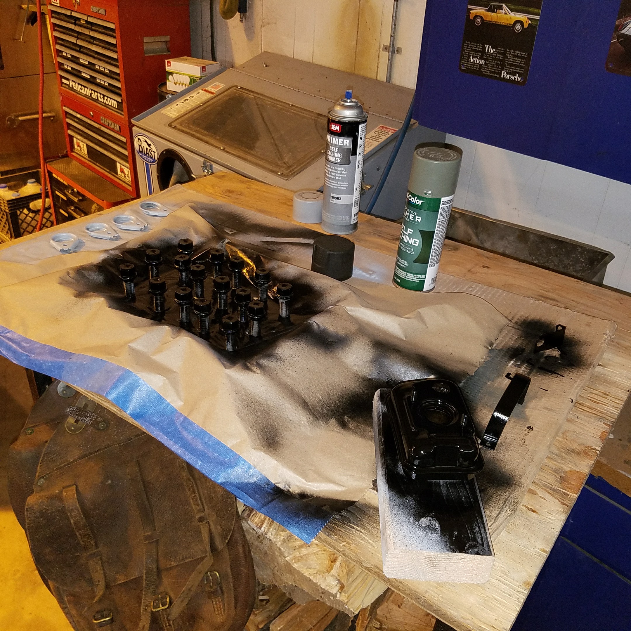 This is the first time I've had a problem. Took us 2 hours of twisting, turning and prying. It finally popped loose. Clutch frozen on to the splines. After that I got the new brakes installed. All done but the bleeding. Today was all about putting the fuel injection, ignition and wiring back on the short block. Along the way I'm making sure every component is correct and in spec. So far, so good. Rusty parts are bead blasted and clear coated. Black painted parts are cleaned and or blasted. Then painted with 2-3 coats of Rustoluem. ![]() There was a cap on the injector when in was in the blast cabinet ![]() Surgery table .............. ![]() Paint shop open for business .............. This is the way to adjust the valves. Next time I'm in the same spot I'll see if there's an interest in doing a Saturday afternoon party. ![]() Heading home ................ ![]() |