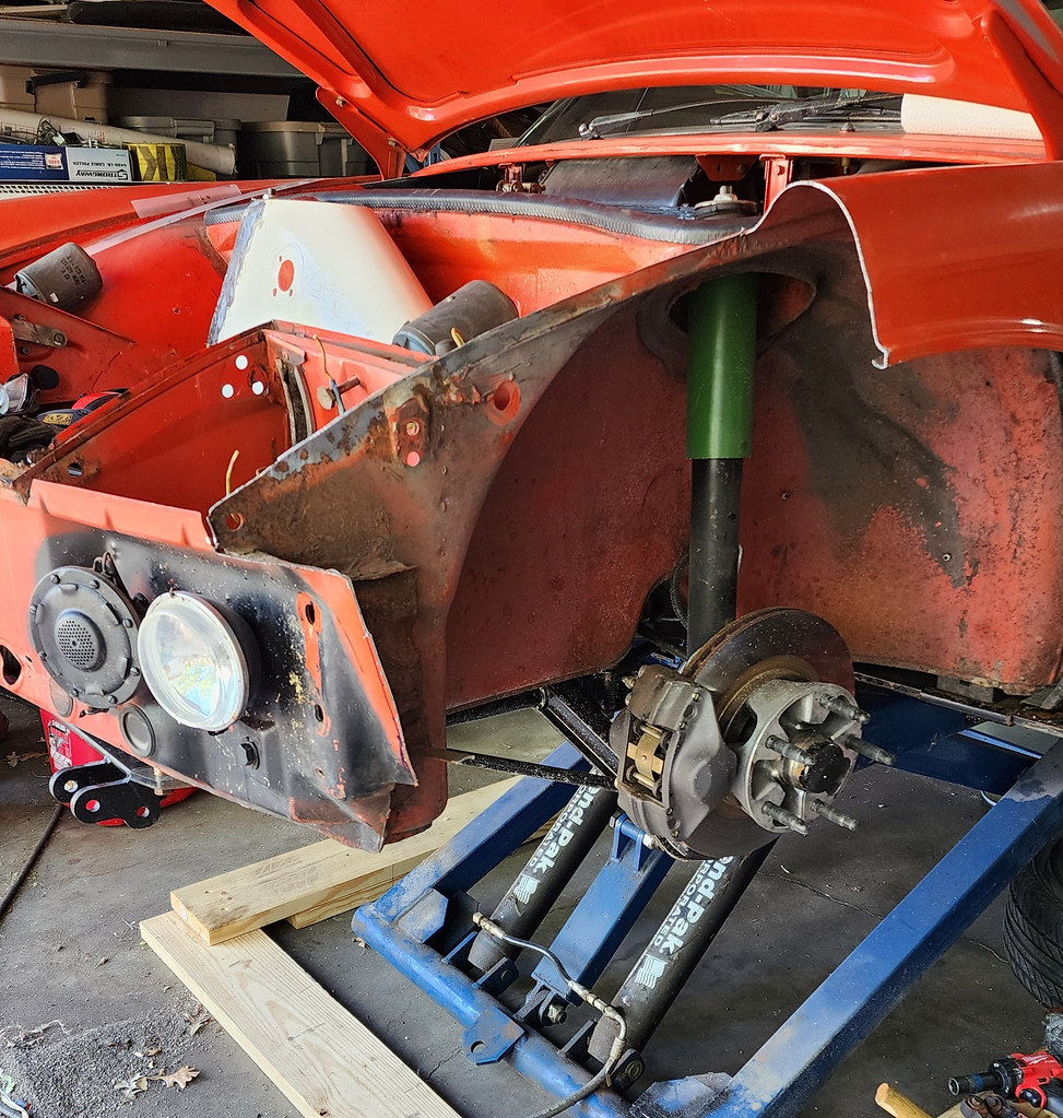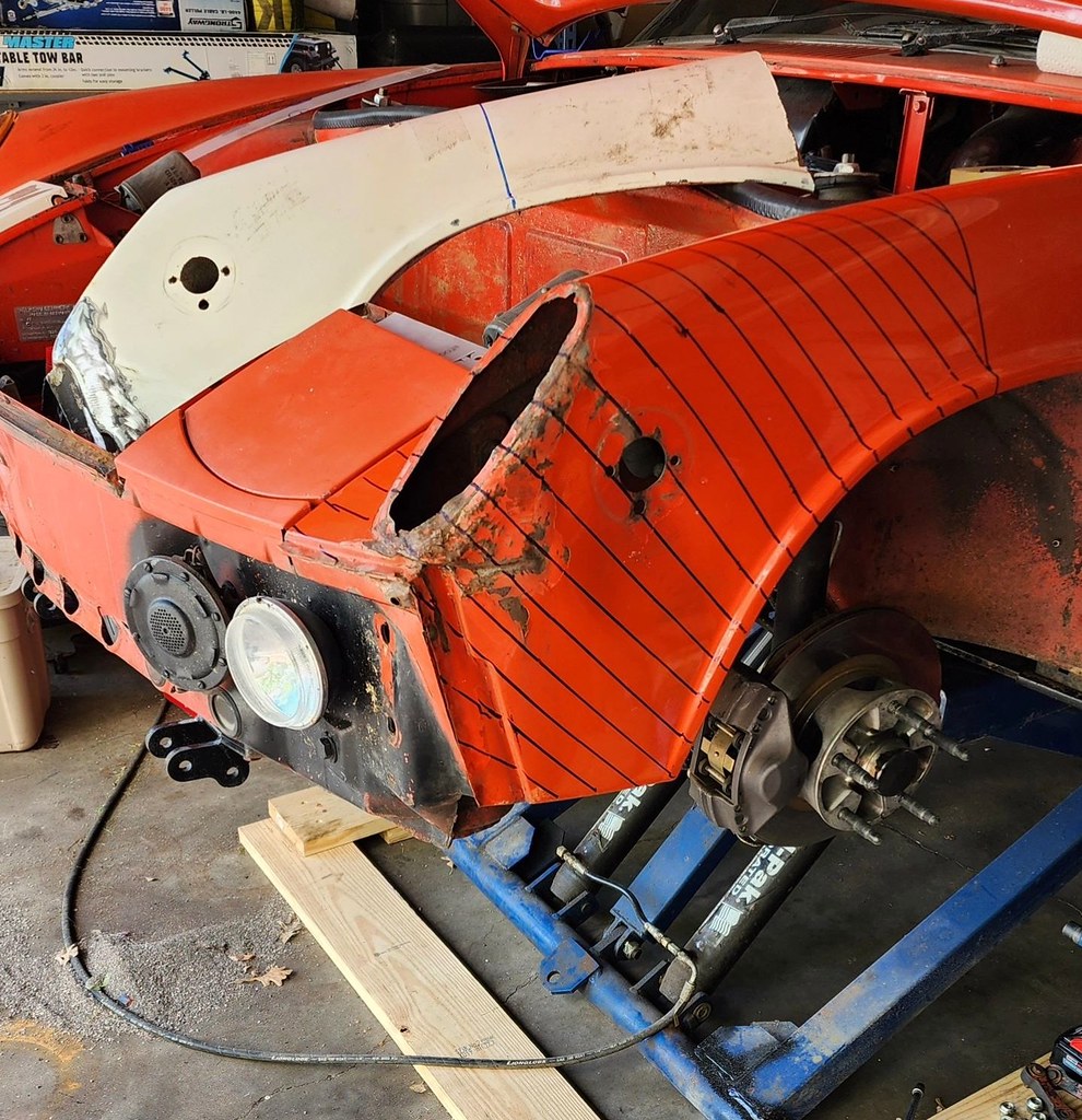 using SPI Epoxy primer and Turbo 2k, paint is single stage Omni (not great, I know, but I only found that out after I bought a gallon custom mixed) They couldn't find mix details for L21E Tangerine/Blood Orange so they scanned a section of my old door, turns out that GM Red Orange from 1980 was a 98% match. For this car, that's close enough, since it'll be an all-over paint job. (IMG:http://www.914world.com/bbs2/uploads_offsite/live.staticflickr.com-19709-1753767671.1.jpg) Here's the front fender where I made the splice. Can't really see much with just primer on. It's not perfect, but it also wont be sticking out like a sore thumb. (IMG:http://www.914world.com/bbs2/uploads_offsite/live.staticflickr.com-19709-1753767913.1.jpg) Making lemonade... While stripping the car down, I found more underbody damage, dents, and bends all over. Paired with the need for floors, I chose to band-aid it for now and start looking for a different shell next year. Maybe in the future I'll feel ambitious and want to tackle the metal work myself, if I can't find a straight shell to swap my parts onto. Until then, it'll be a fun driver and I'm not going to worry about it. |