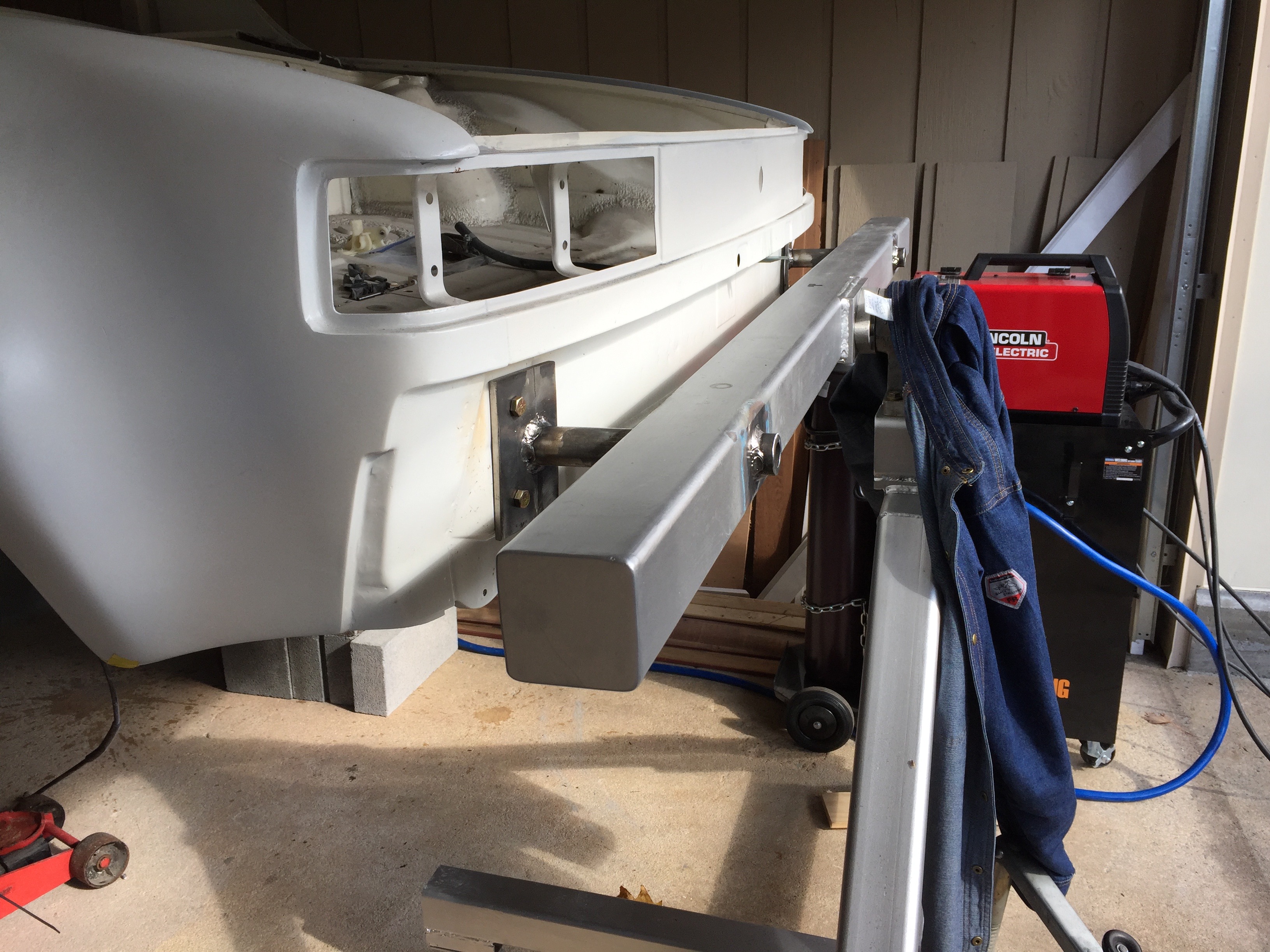 Careful, the stripped shell is top heavy when mounted on bumper mounts. I like how you passed the supports through the main bar, and cleaned up the ends by capping them.