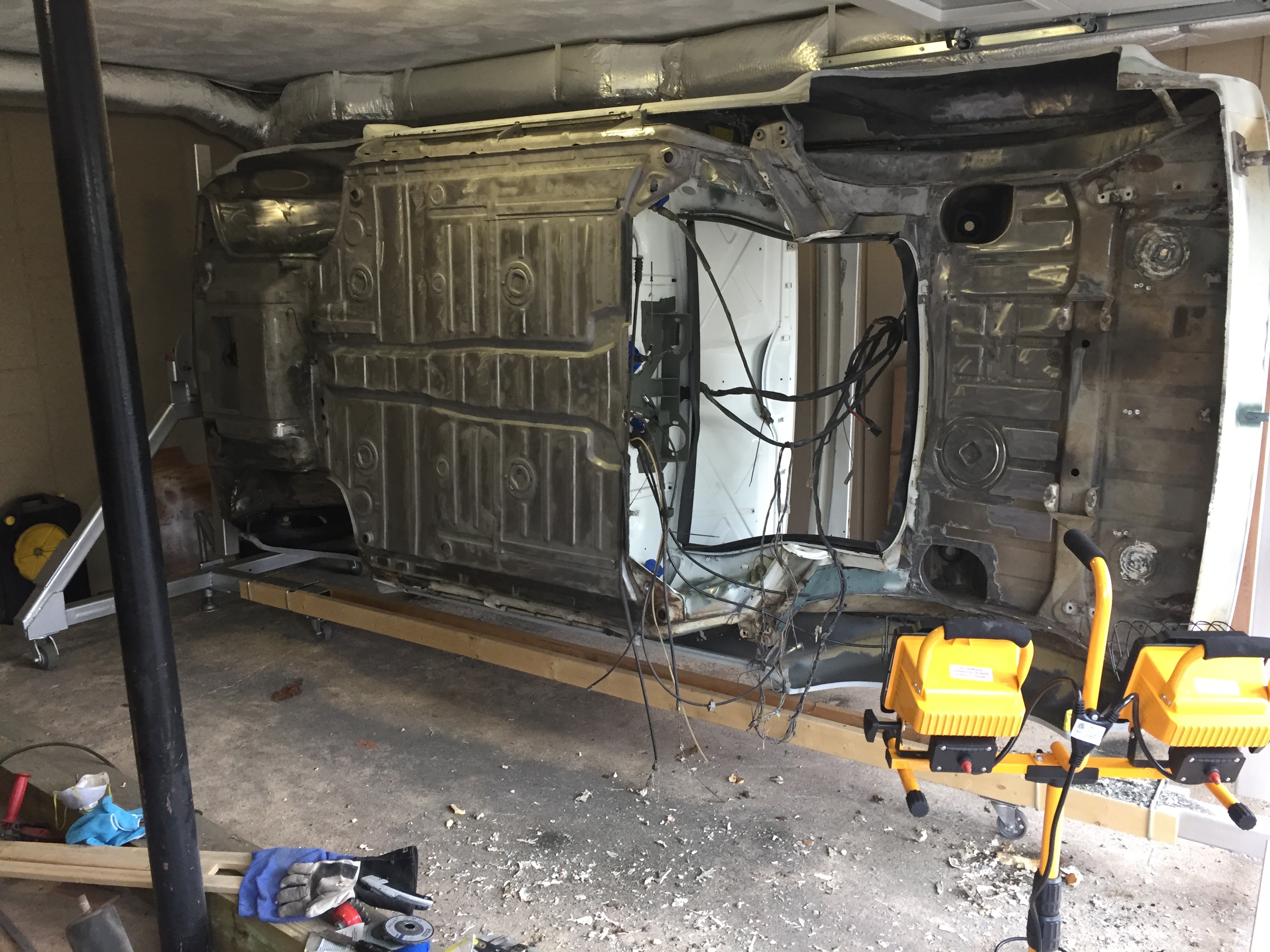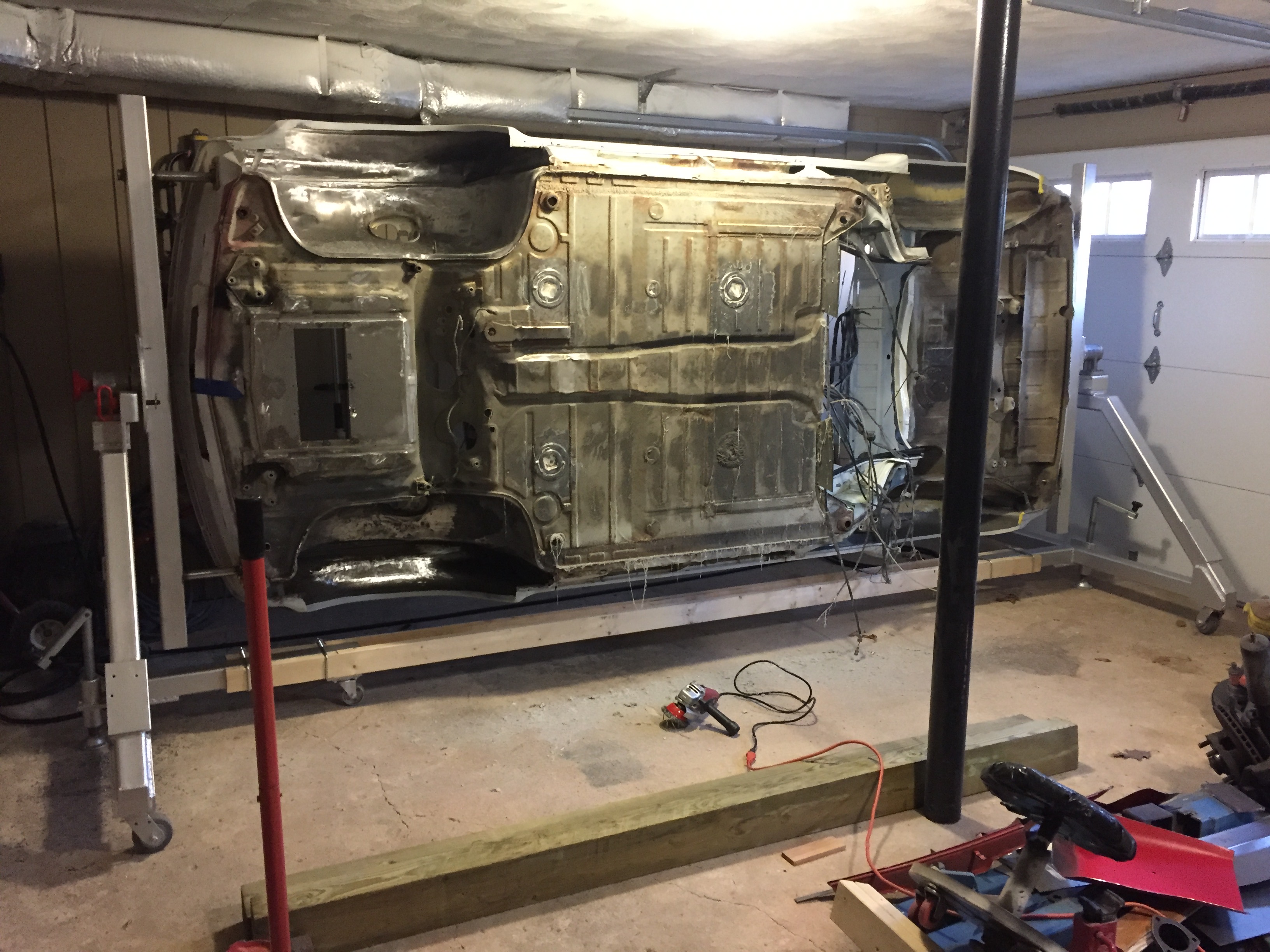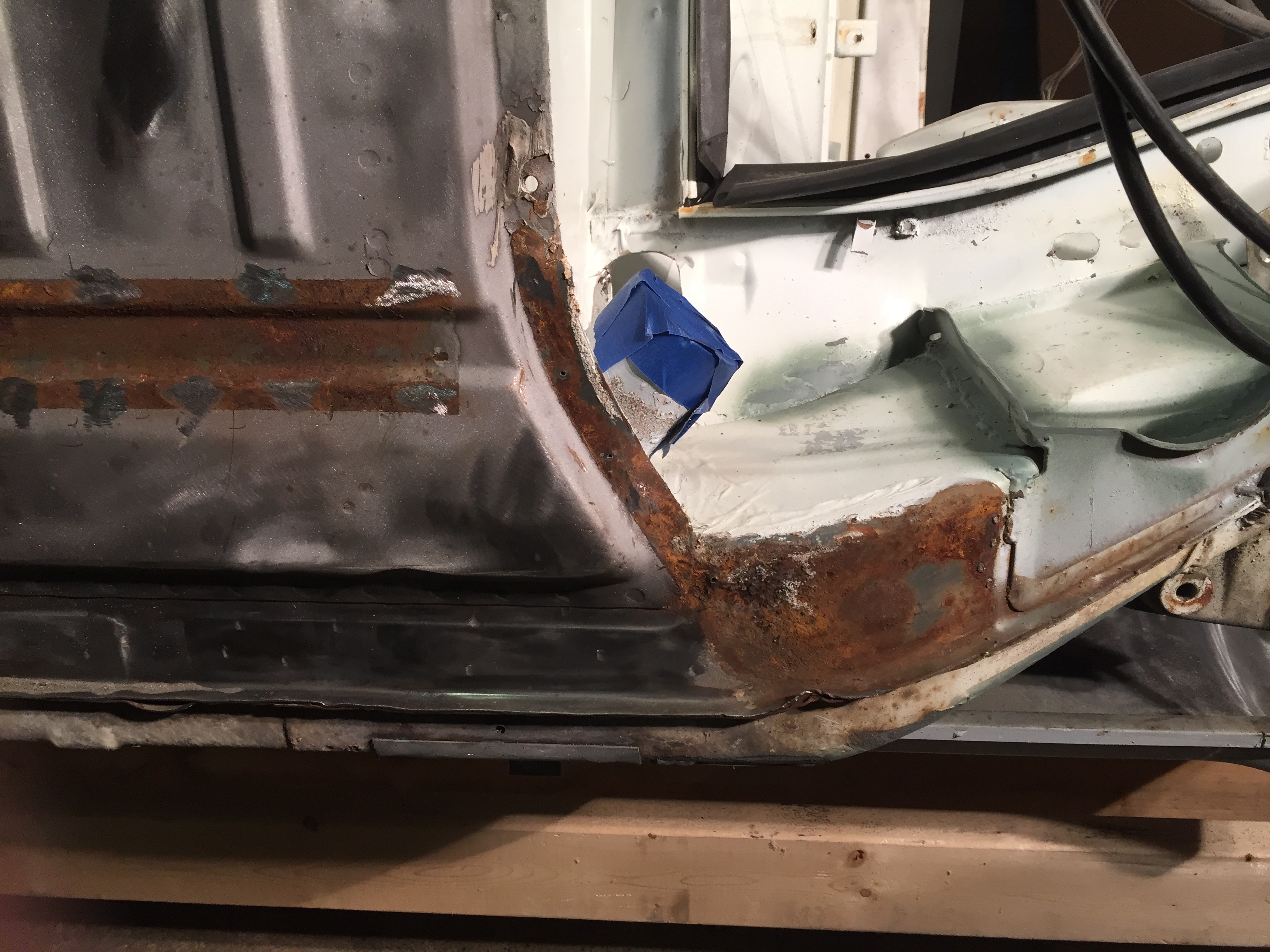 I must be developing OCD. While stripping the bottom, I kept thinking of the potential rust hiding under the seat reinforcements and jack pads. Finally, I placed an order for replacement parts, and then cut the old parts off the car today.