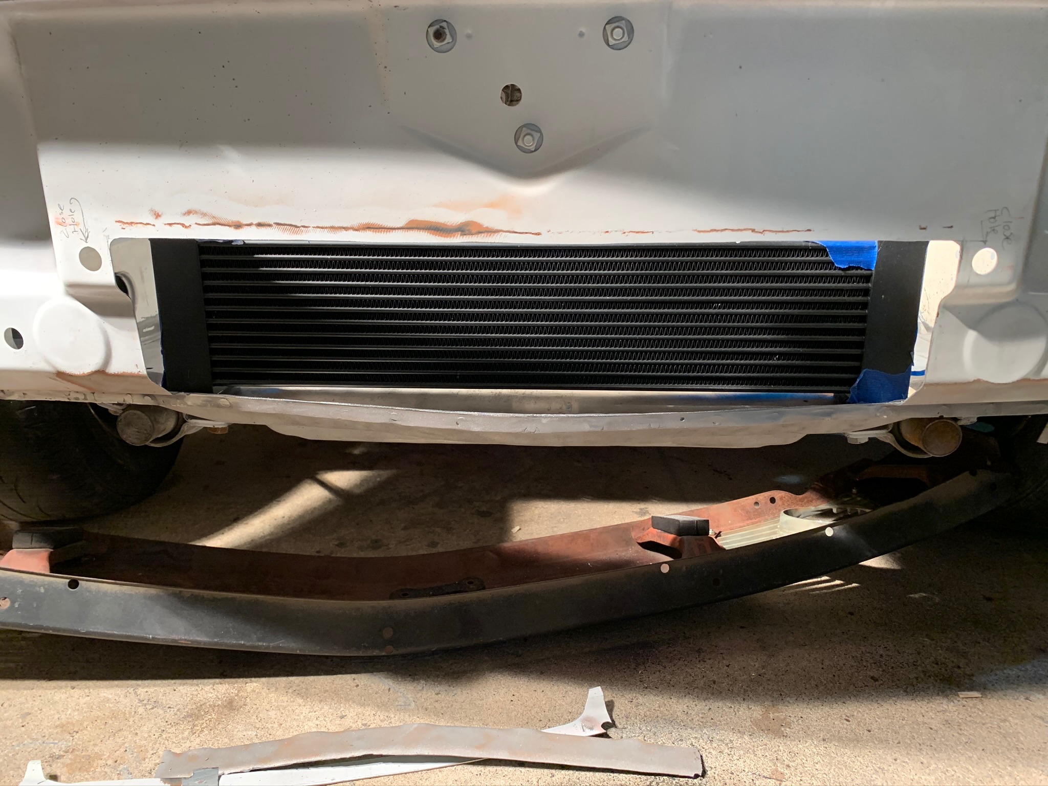 Just finished the oil cooler base, mount, and front cut out. Later I’ll make a bracket to hold the cooler more firmly. I’m still not happy with the fiberglass shroud; it has huge gaps where it should fit to the car. Maybe I’ll make one, or have a moment of weakness and buy one from Mittelmotor. |