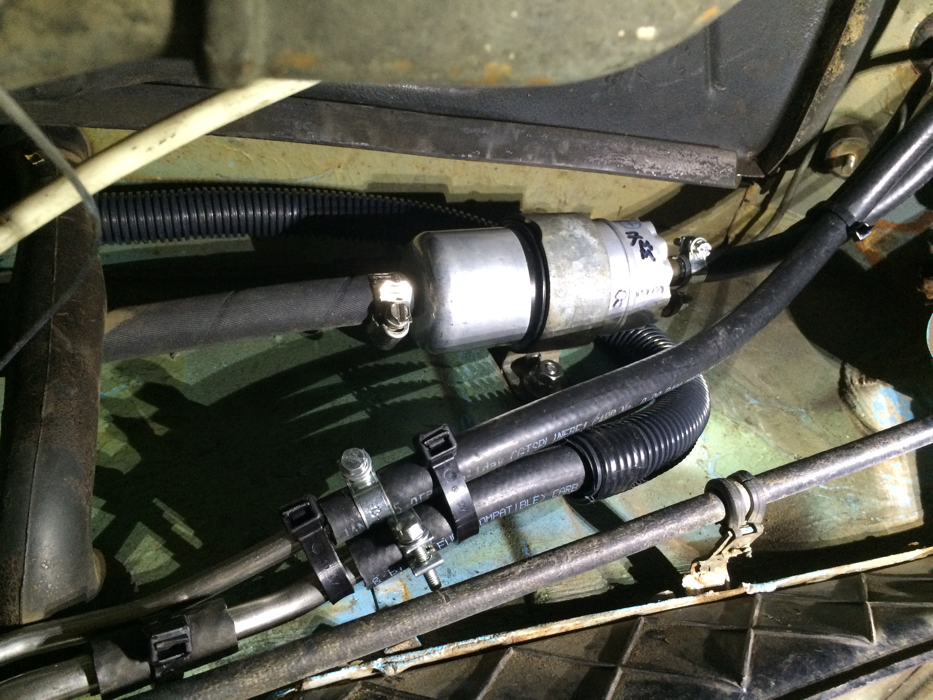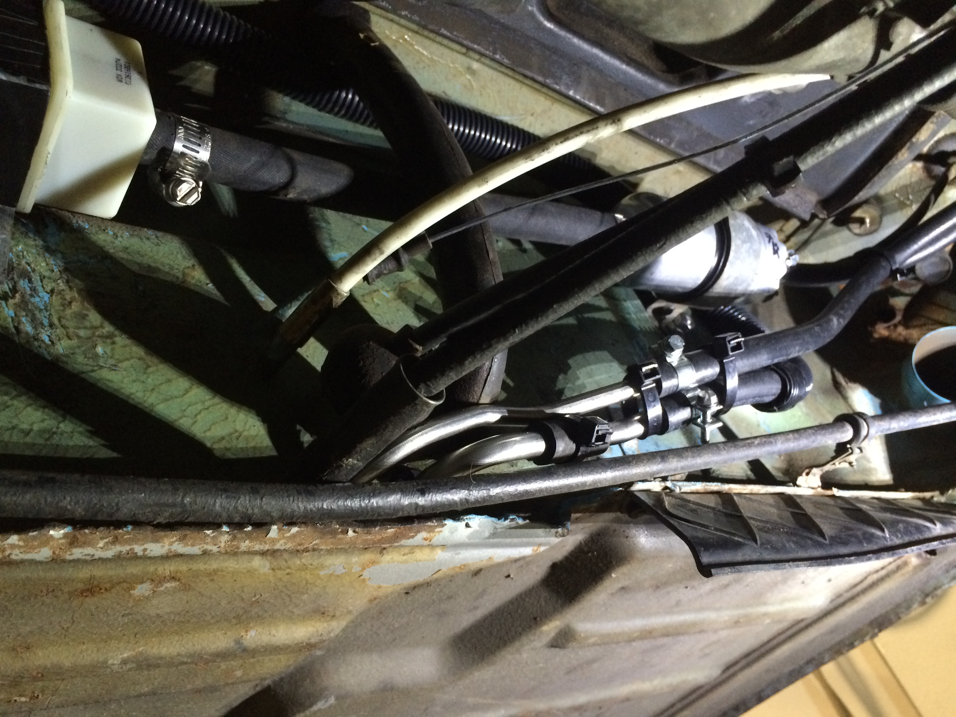 Hey Jason, For your 72 you'll want to use the position recco'd by the Porsche Service Bulletin from the 1970's (74 or 75-ish IIRC), which is up behind the front steering rack cover & rack underneath the car's front floor/fuel bay pan just to the right of the tunnel opening for the factory fuel lines. Then the pump/lines/filter can be serviced by simply removing the steering rack cover plate. They were to be mounted to the body belly pan up under there where it turns vertical, with 2 of the same rubber vibration isolation mount & clamp strap as used in the 70-74 factory engine bay position. AutoAtlanta sells a kit with all of the parts for this relocation, & IIRC it has instructions with it, or you can collect all the parts yourself.. I can't tell where this pix above are within or under the red & yellow/green? 914s, but the red looks to be inside the engine bay - perhaps the OE factory position - which will leave the pump & lines still vulnerable to vapor lock, which is what the pump relocation factory SB relocation advisory was meant to resolve. Also, I would recommend against using those types of screw hose clamps, since they put a pressure point under the screw mechanism where the rubber hose can fail, & our EFI fuel systems are running at something like 40 psi IIRC. You're far better off getting the factory style full circle clips & the special clamping pliers used to close them. This is a cruddy/dirty pic of the relocated FP done on my 73 2L back in 1978 by my Porsche 914 factory trained mechanic (by then & still an "Indie"). This is a view from the passenger side, with the silver pump to the left of the steering rack acccordian boot, with the rubber fuel lines on this end going to the tank, from the early 70-74 3-port type fuel pump, so the square "box" fuel filter is on the opposite end where the lines go thru the center tunnel access portal & back to the engine. ----V Good Luck! (IMG:style_emoticons/default/beerchug.gif) Tom /////// Mine was the original green before it was painted....Thanks! |