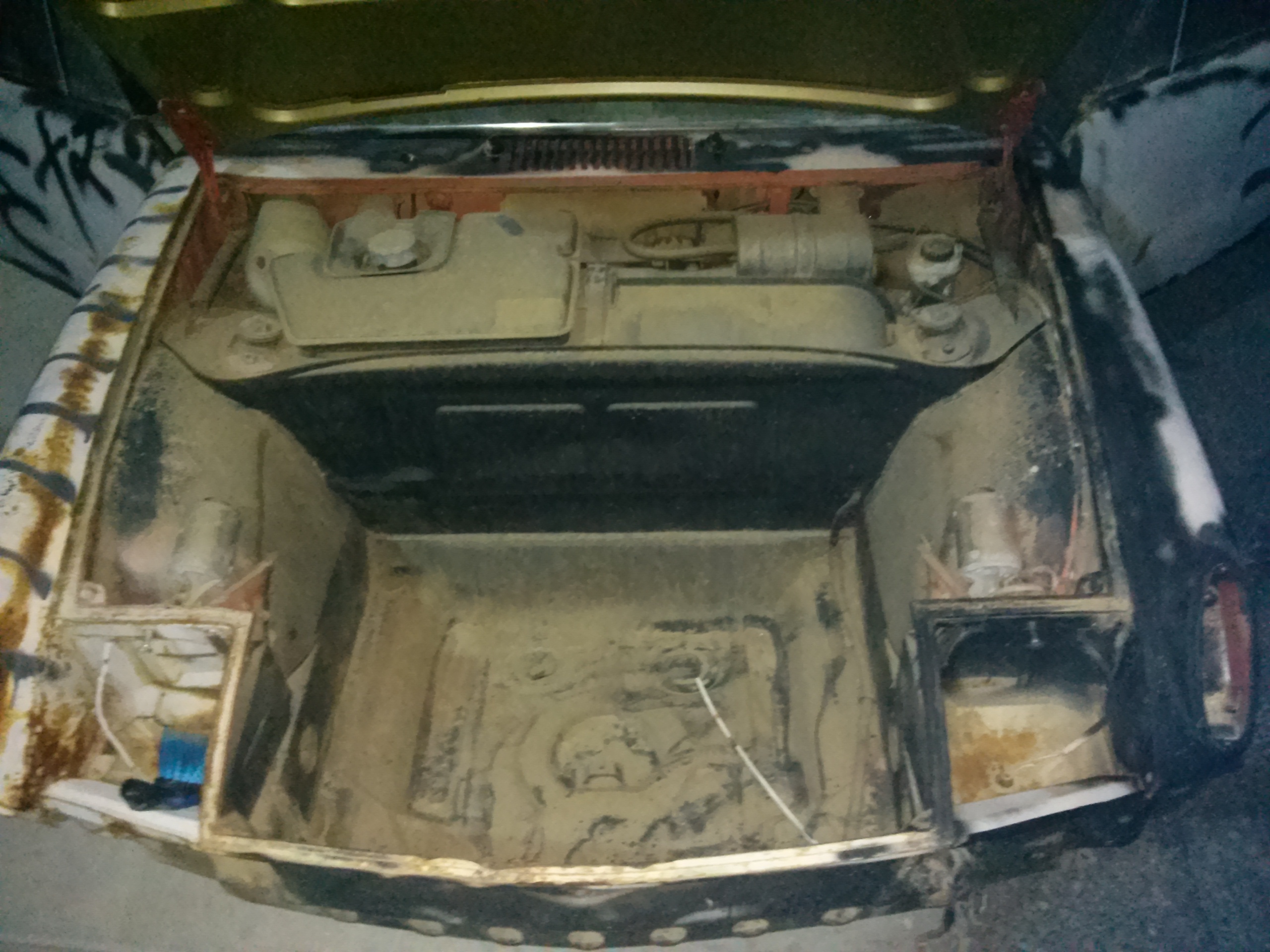 I started disassembling it right before I went off to college. I never drove it again and sold it as a basket case three years later. My second 914 was a project when I bought it. No transmission or engine because the PO had pulled the Buick grand National engine out of it a couple years before I bought it. It had a Chalon kit and the targa bar had been cut off. At some point the PO had added and then removed Testarossa style side bars on it and had not cleaned up the mess. It appeared to be in good shape but as I started to work on it I found the PO was really good at covering rust with fiberglass. I dumped it for a loss soon after. Here is my third attempt at 914 ownership. The transmission for my 1990 922 S2 Cab is in the process of being rebuilt and I was checking Craigslist for a cheap transmission to throw in while I wait for my good trans to be finished. I didn't find any cheap 944 transmissions but I did find a VERY cheap 914. It looked/looks ugly but it has almost no structural rust. The battery tray is gone but the hell hole has just one smallish hole. I will have a patch panel made to replace any weak metal in the area. On the outside of the car, the PO went nuts with black spray paint over grey primer. I've cleaned up most of the black spray paint and some of the primer. The wheels are off and will be media blasted and repainted and I'll throw some basic tires on them for moving the car around during the rebuild. The car is going to be stripped of paint, bondo, and rust by a dustless media blasting company before I decide what direction to go with the bodywork. The options are stock, steel flares, Sheridan kit, or slight flaring of the stock fenders. There are some issues with the existing stock fenders so making major changes won't be messing up a pristine original example. Here are the pics of how it looked the night it came off the truck from the PO. Years of grime and neglect hid a decent set of bones. Attached thumbnail(s) |