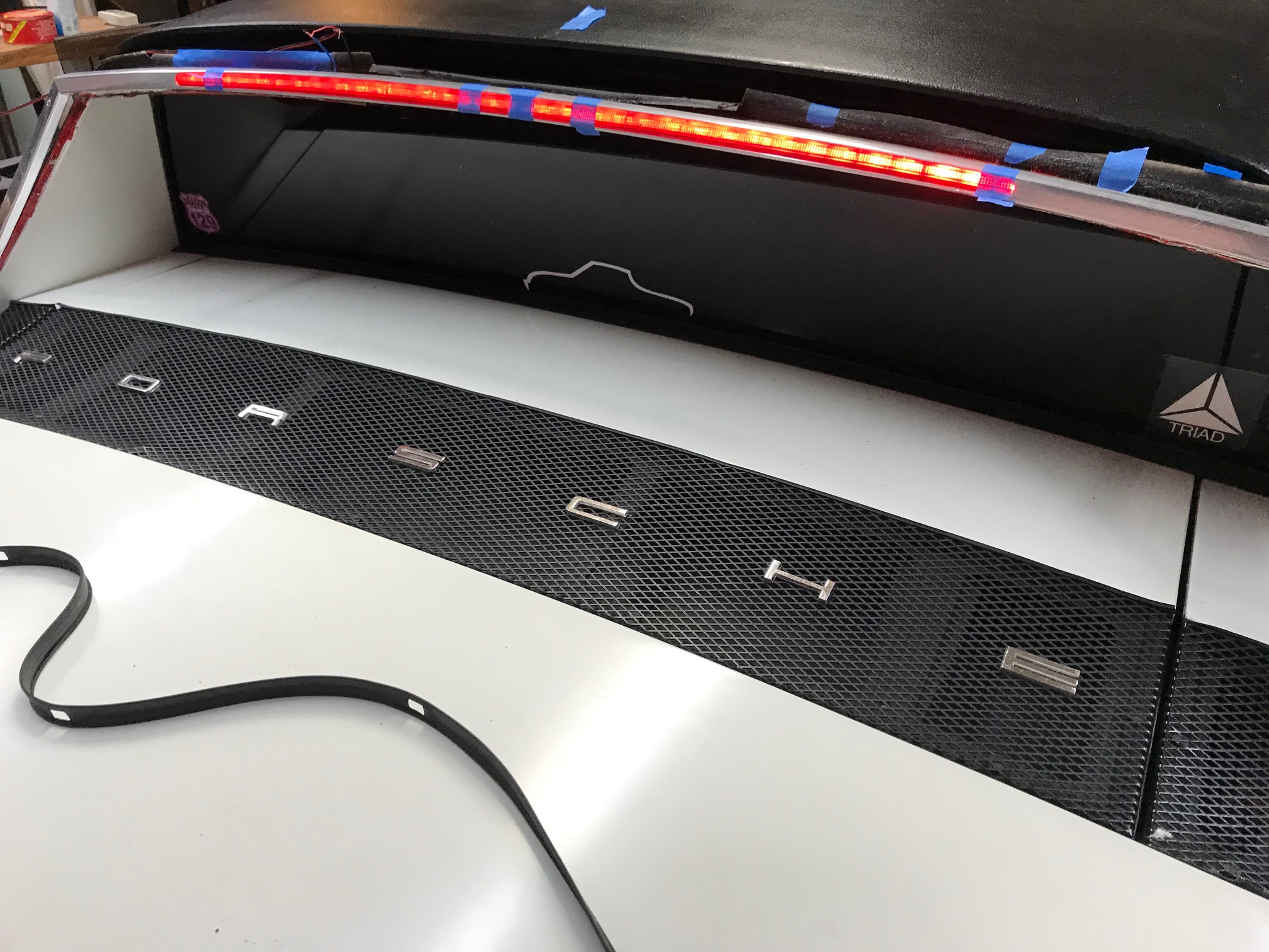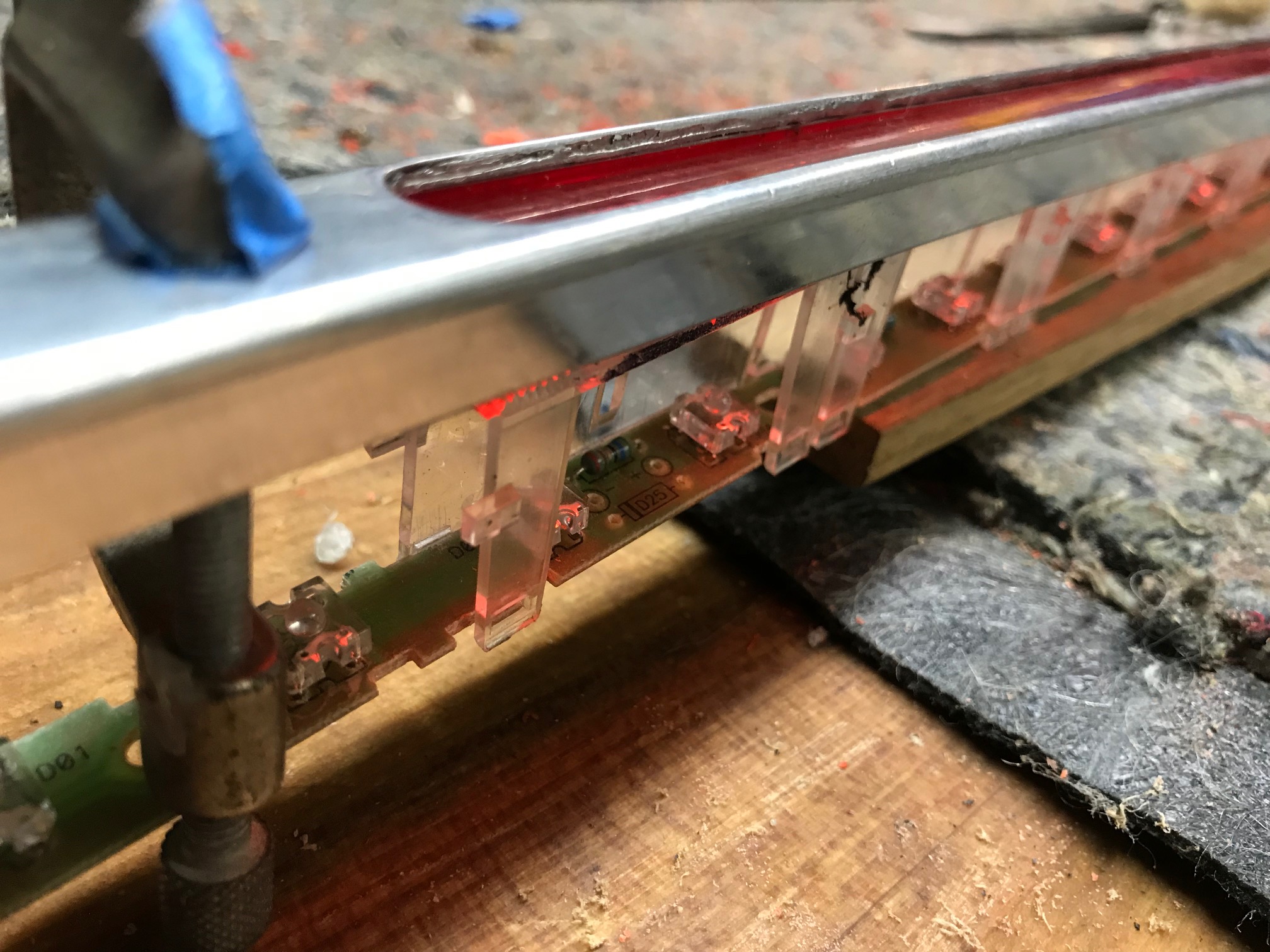 I’ve been wanting to extend the third brake lamp for more width. So this time I’m using the lamp from a Cadillac tailgate . I had to extensively modify the lens size, by filing and sanding it to fit inside the 914 trim. I wanted to reinforce the rollbar and give a backstop to the lamp, so I utilized some underlying material used for floating floors inside the roll bar. It also took quite a bit of time to shave/mill the hole in the roll bar trim.