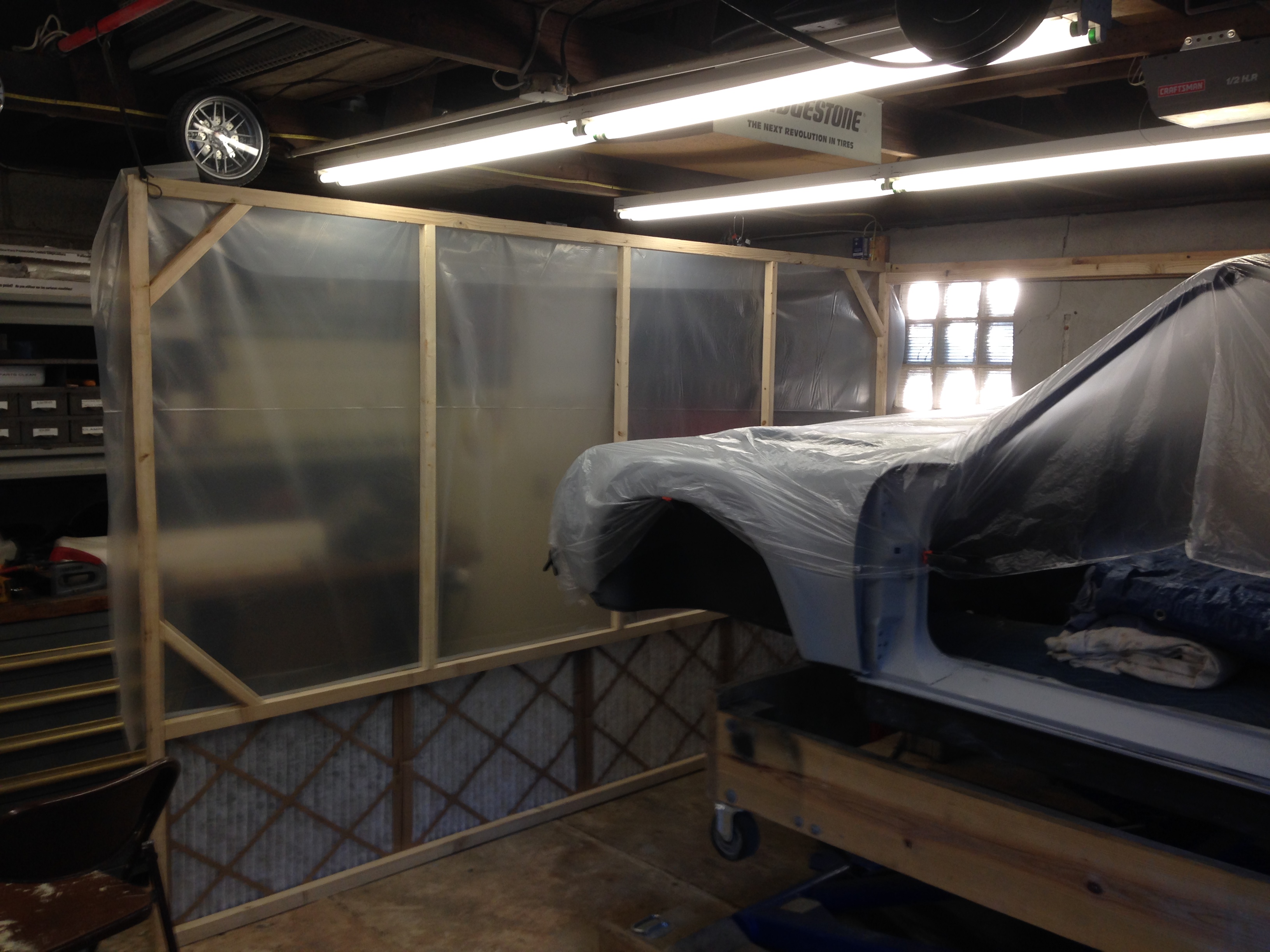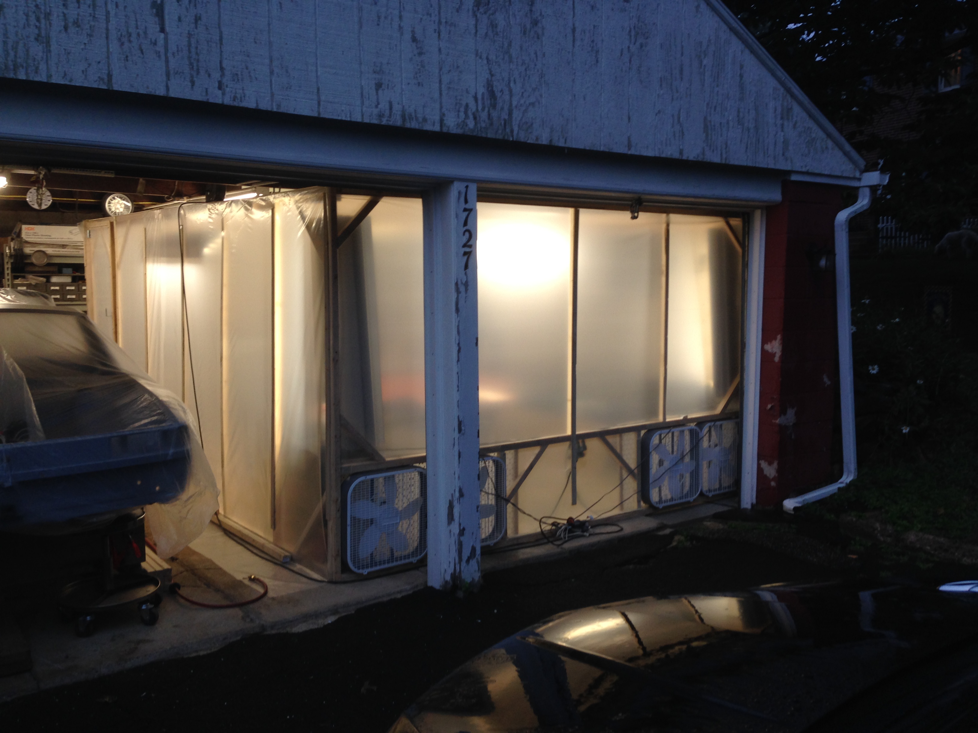 Explain your fan setup in your paint booth. Are two going in and two going out? Creating a swirl? Are all of them going in? or are all of them sucking air out? Your air in should be filtered. Standard house filters work great once. The issue is you want to eliminate dust and bugs. Run the fans the night before to draw out all the bugs/dust. Also setup the inside 100% for your paint and gun and cleaner. Give yourself at least 3 feet to walk around. All four are fans are blowing out. They have heater filters on the interior side so they are not pulling overspray thru them. The opposite wall has filters allowing the air in. Both high and low. I partially block the lower row to get flow both high and low in the booth. These are pictures of the front wall before a I put the side wall up As far as space around the parts, it's limited. I'm doing multiple sprays on the body for a couple of reasons. 1) I'm a newb and breaking it into smaller sprays keeps it so I can mix and shoot by myself. 2) There's no way I can paint around the whole car with that short a booth. 3) I have to mix outside the booth. There are a lot of compromises but it's better than nothing. I'm planning on blocking and buffing the exterior to cover the dirt issues. Thanks for the advise. I miss the booth from tech school where I took classes. |