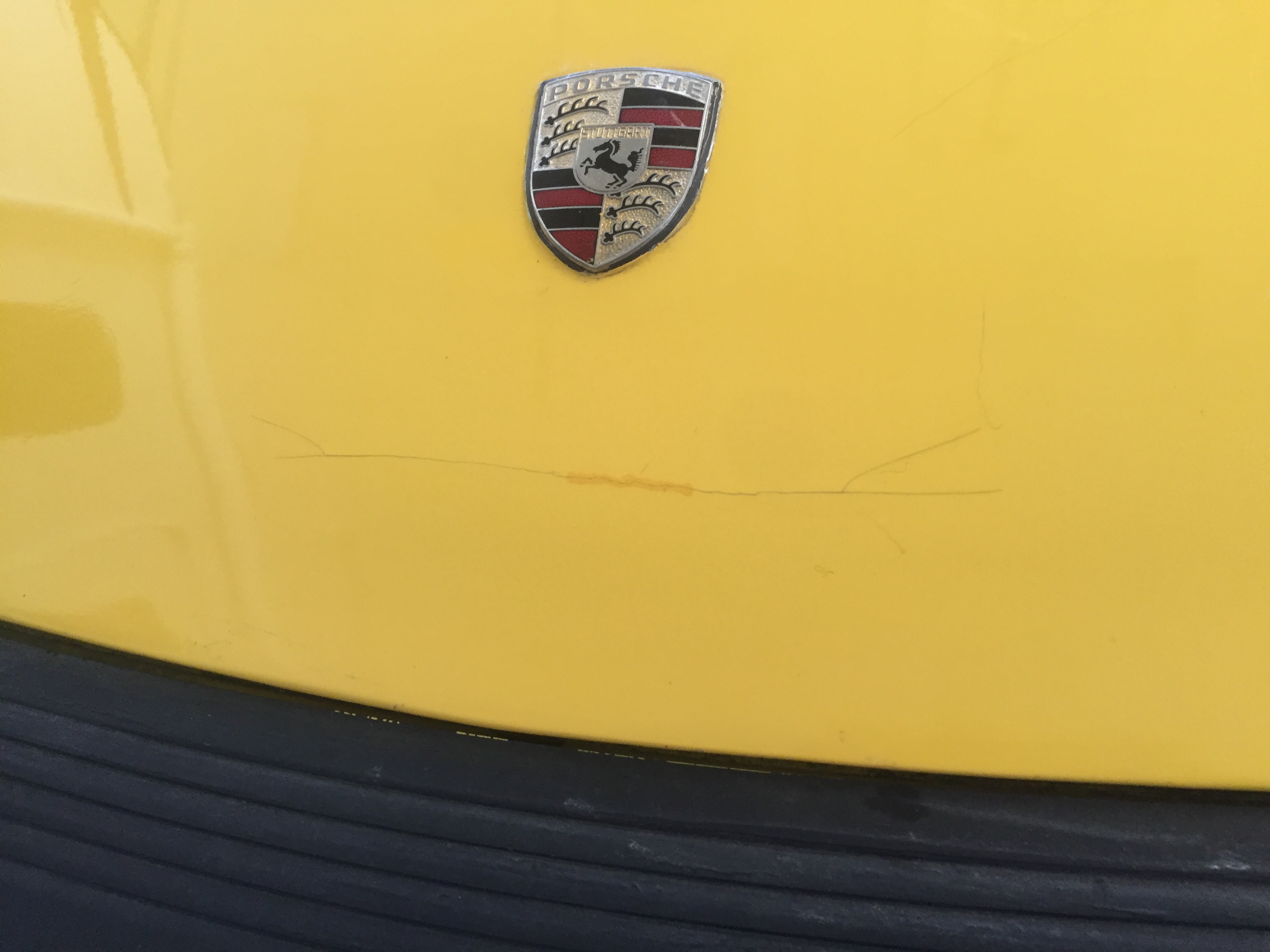 The front area of the hood on my "76 914 was professionally spot resprayed five or six years ago due to cracks in the paint. That painter retired and is no longer in business to return to. Cracks in the paint have again slowly and continually opened up, and the cracks seem to be in a line parallel to the front edge of the hood. Could the hood be flexing while driving and causing this? The underside of the hood nor the front of the car show any sign of previous accident damage. I am going to sand this area down soon and have it resprayed by another paint shop. Should I make sure that the next shop does something different during the paint process that might prevent this from happening again? Has anyone else had cracking like this in their hood? Any advice appreciated. Its most likely cracked body filler. Sand it down to metal and respray it. Take a weak magnet and see if it sticks. They probably put body filler on it when they shouldnt have. I can take a look at it if you want sometime. As usual, you nailed it Andy (and Tom and ToolGuy, thanks). A weak magnet sticks everywhere but where the cracked area is, must be bondo'd. I now noticed that the hood badge was originally in a lower location, (see pic below) and was moved to its current spot and the old holes were filled with bondo by the PO. That's the source of the repair, not an accident. I read somewhere that holes that are bondo'd like that will eventually crack through the paint, so maybe I should have them welded closed on the next repair? Andy, I would be honored to bring the car to you when you have a little time just to give it a brief once over with your expert eye and experience. I am retired and pretty flexible time wise, so it's up to you what might work best with your schedule. You have my email if you would like to reach me, bjic, oakdalecurtis@aol.com, Thanks again, cwl |