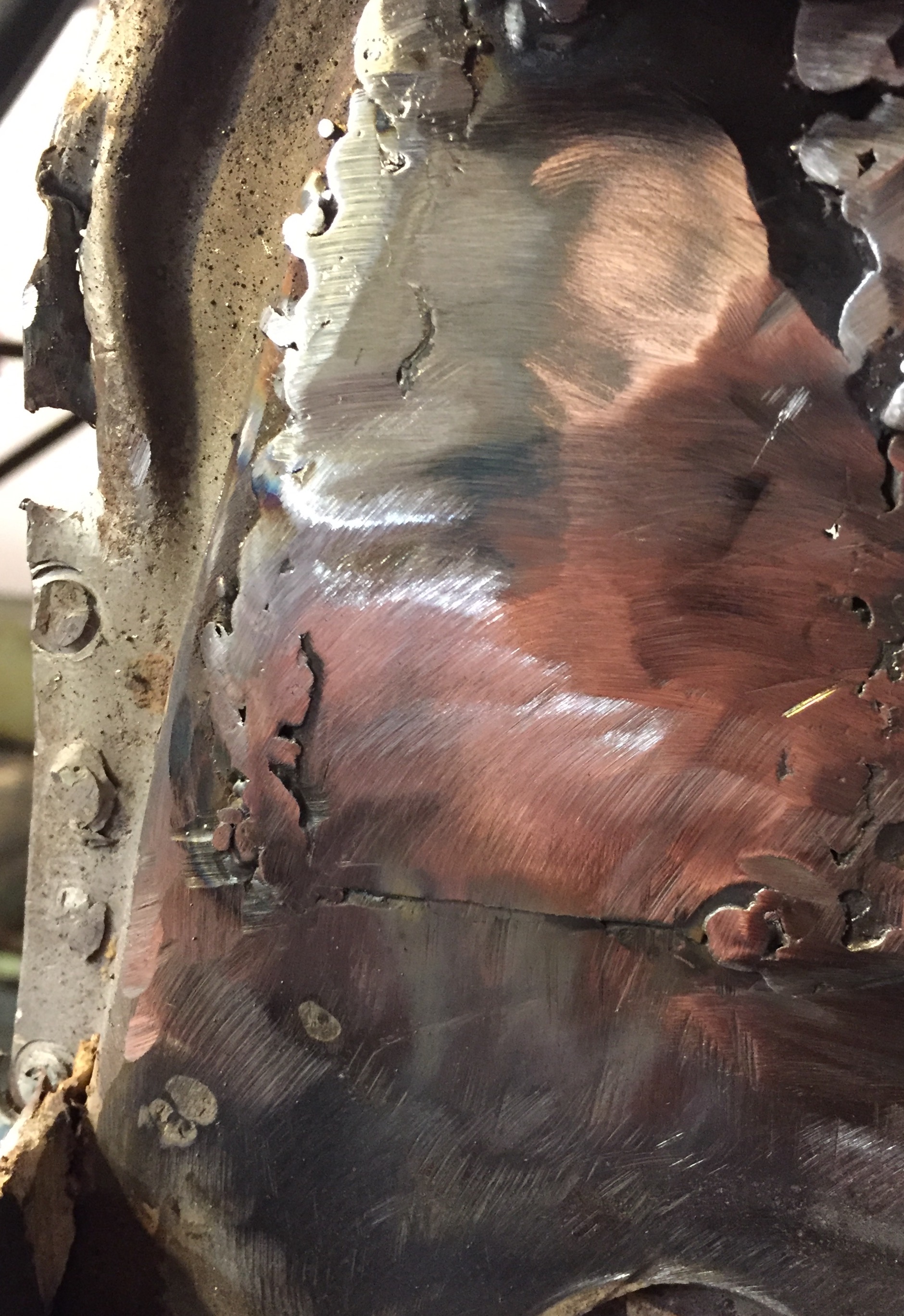 Ok per Bens advice. Obtained some flap discs. Trying to correct my sins. Welded some pin holes and reground, then flapdisc the area again. No one will see the amateur job but it's giving me practice. This patch will get cut open again for the snorkel tube.