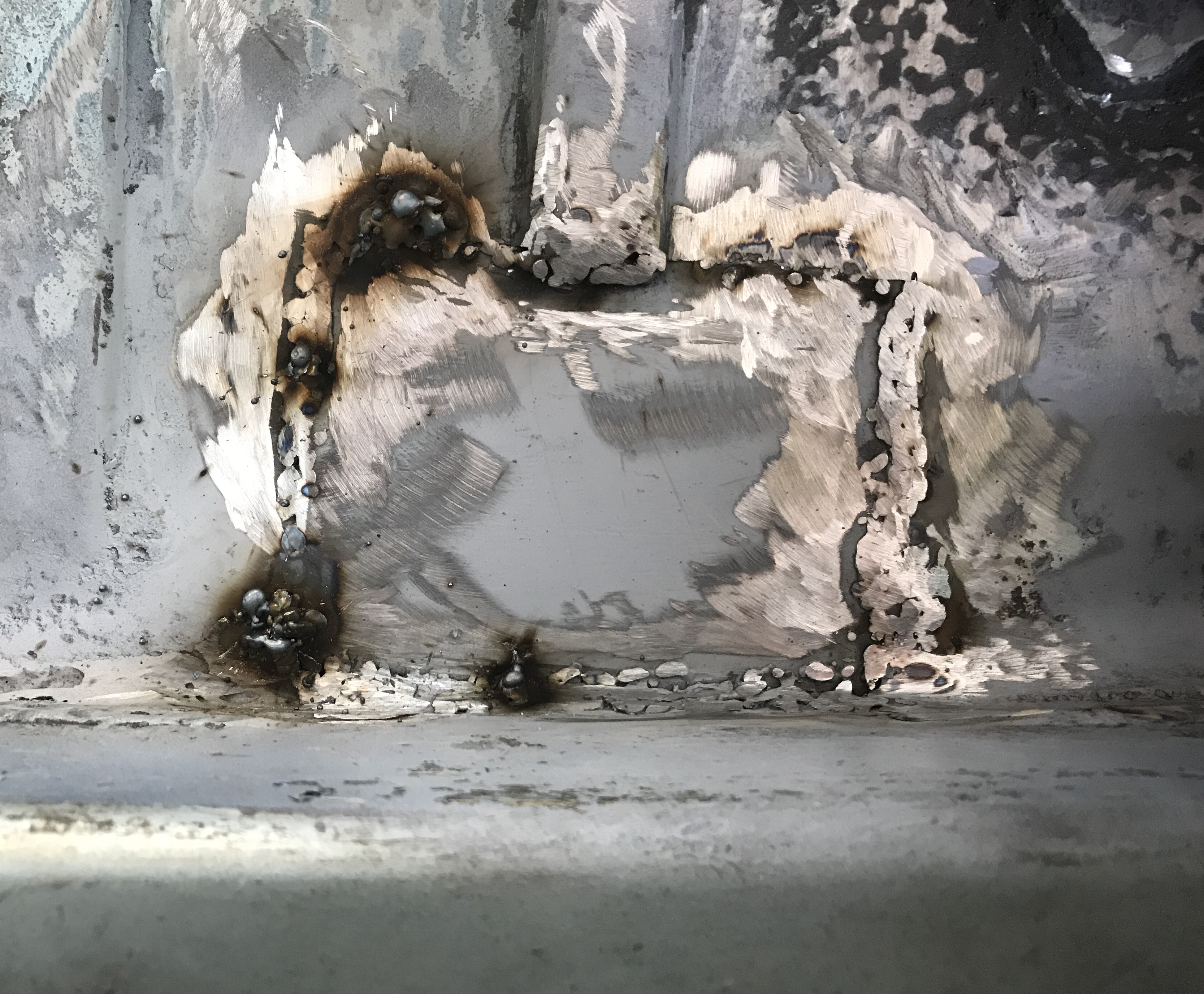 Dion - It's hard to tell from the pics but it looks like you may have the repair piece not quite aligned / in level. It looks like you're ending up with a step where your weld is. I know I've got it "right" when I can use a 1/4" grinding wheel to knock down the majority of the weld bead and not get into the parent material of either side. I use the grinder to get close then hit it with a 2" or 3" abrasive wheel on an air angle grinder (depending on the available clearance) to take it almost to the parent material level. If I have the room, I then do 80 grit on a d/a sander. If no room, 100 grit on the 2"/3". On the water tight: get a powerful light and shine it on one side of the weld while viewing from the other side. You'll see pinholes where there are, well... pinholes! buzz them closed and check again til they're all gone. And remember: It's only metal! Keep up the great work. (IMG:style_emoticons/default/agree.gif) |