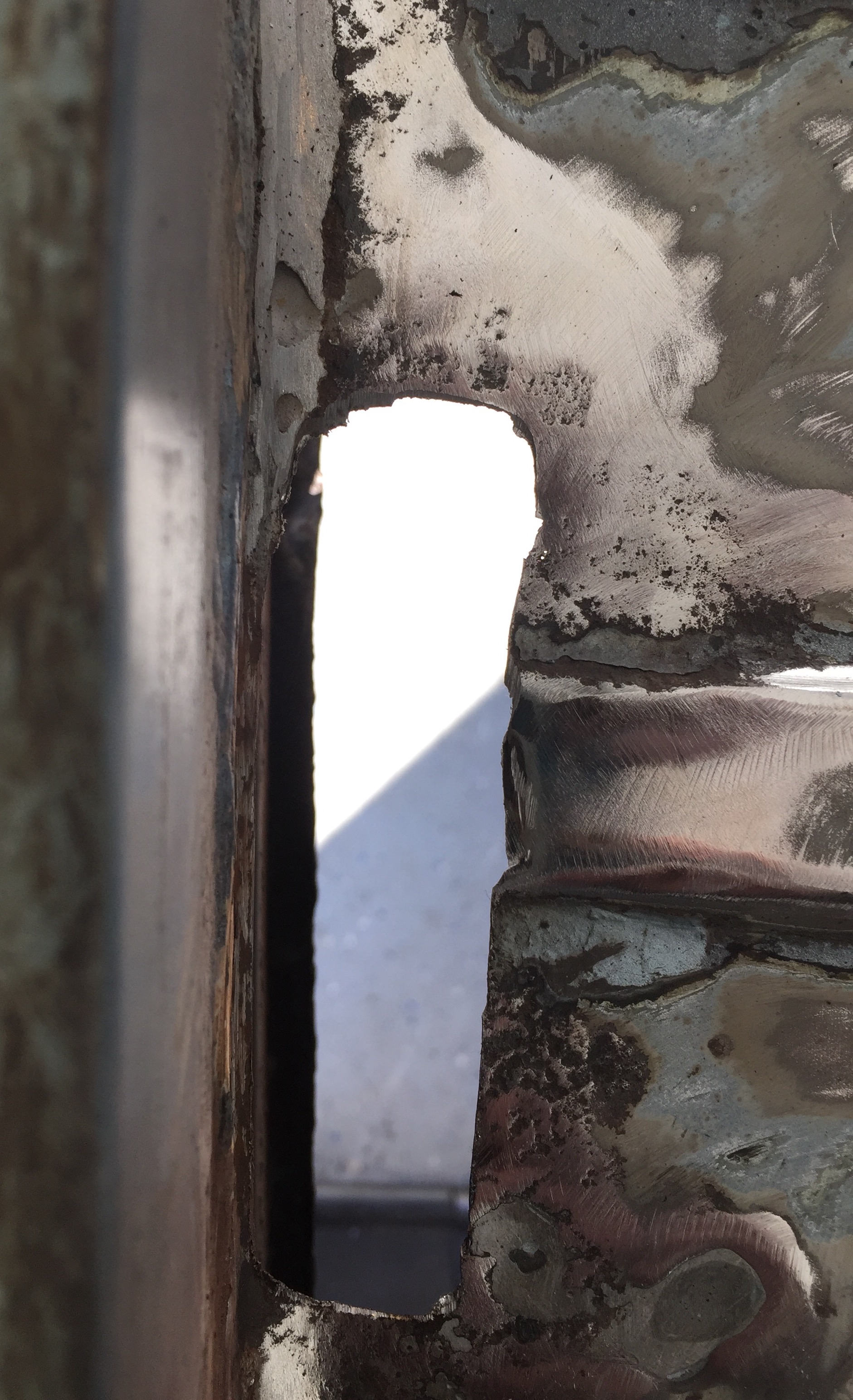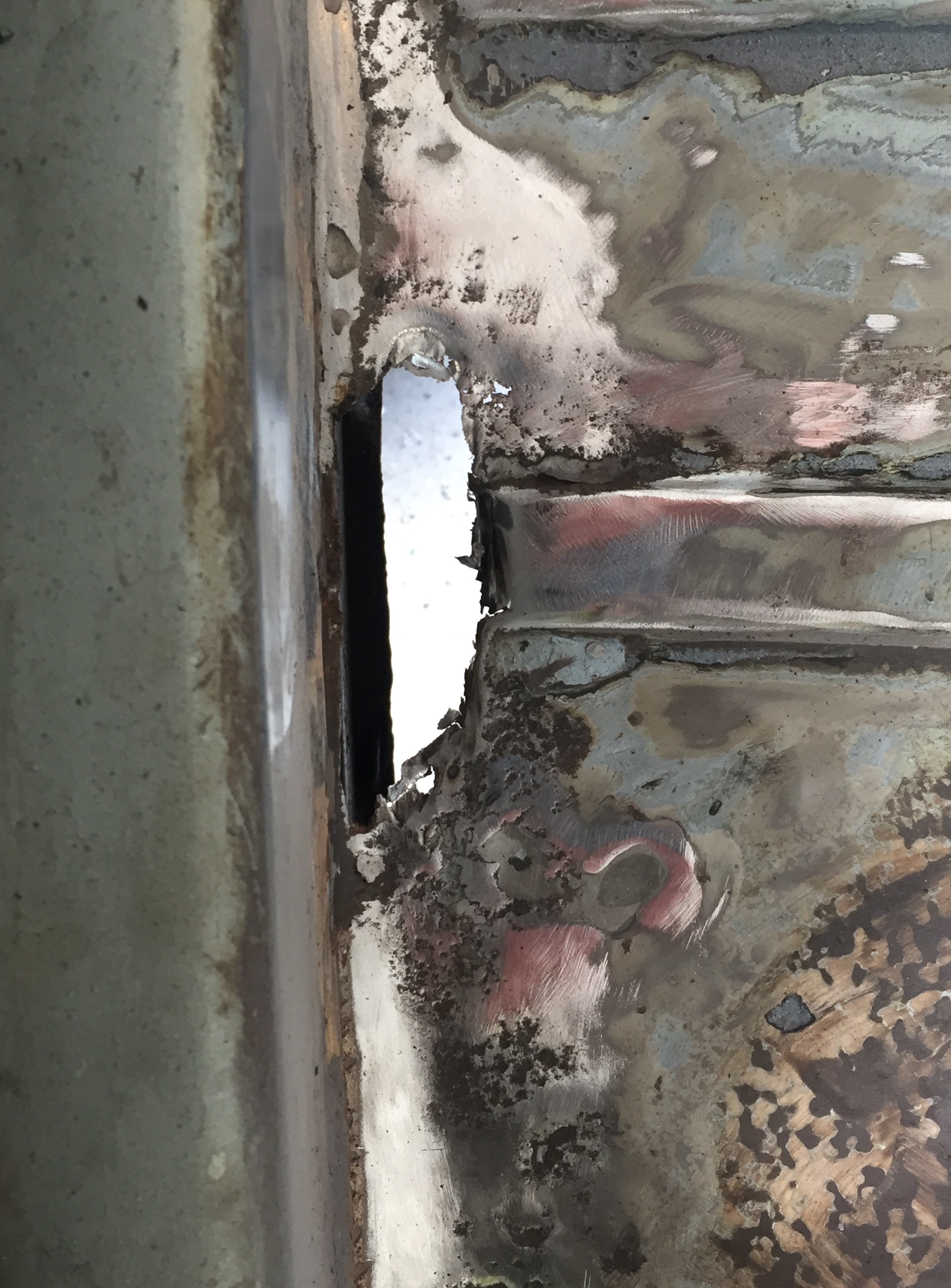 Started prepping trunk area. Removed a chunk of JB weld from trunk I patched years ago. Needless to say hole enlarged. Learned my lesson. So cut out around it. This will get a patch. Attached thumbnail(s) |