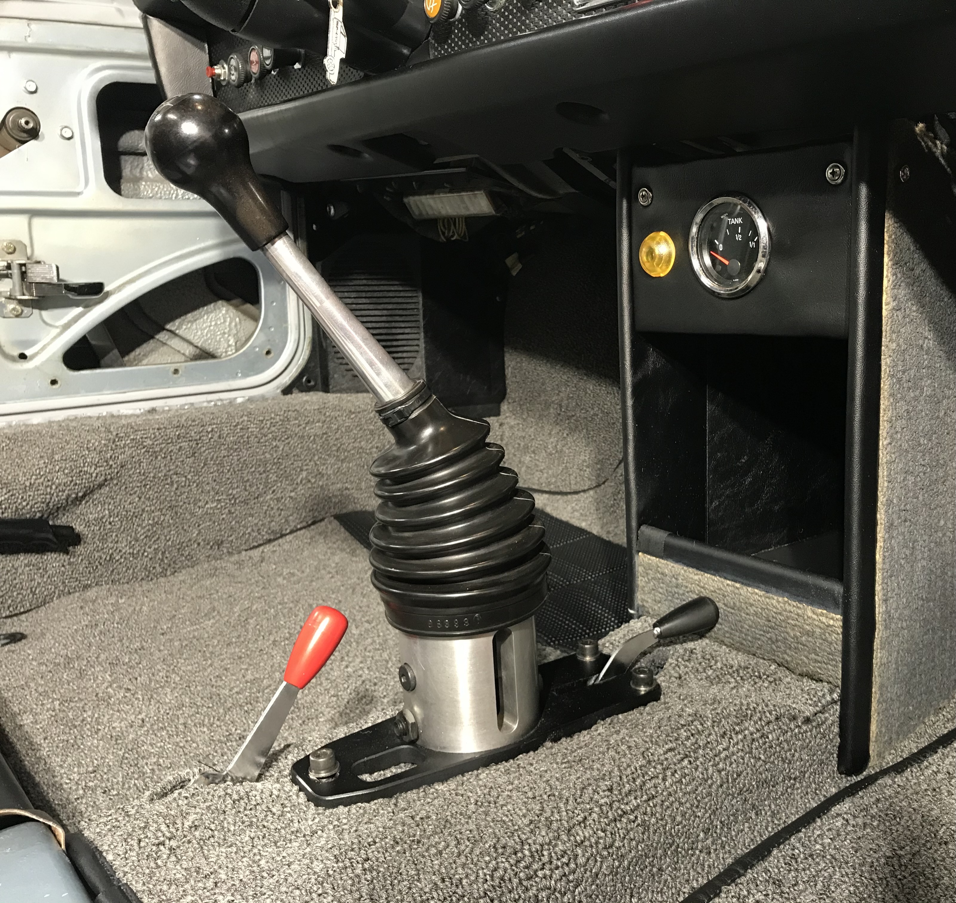Changed the interior a wee bit. Decided to mount the shifter above the carpet... more mechanical look to it. Added the center storage box with my fuel gauge and low fuel lamp.