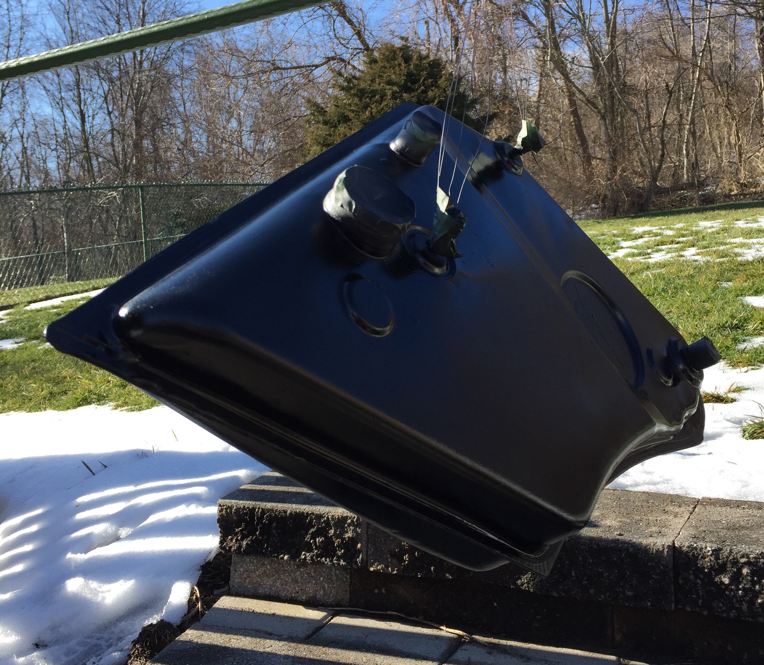 Late start, wasn't in the mood to weld. Took care of the oil tank today. Cleaned up, prepped, primered & painted. Prolly help Dave this week further his. Hershey closing in. (IMG:style_emoticons/default/beer3.gif) Attached thumbnail(s) |