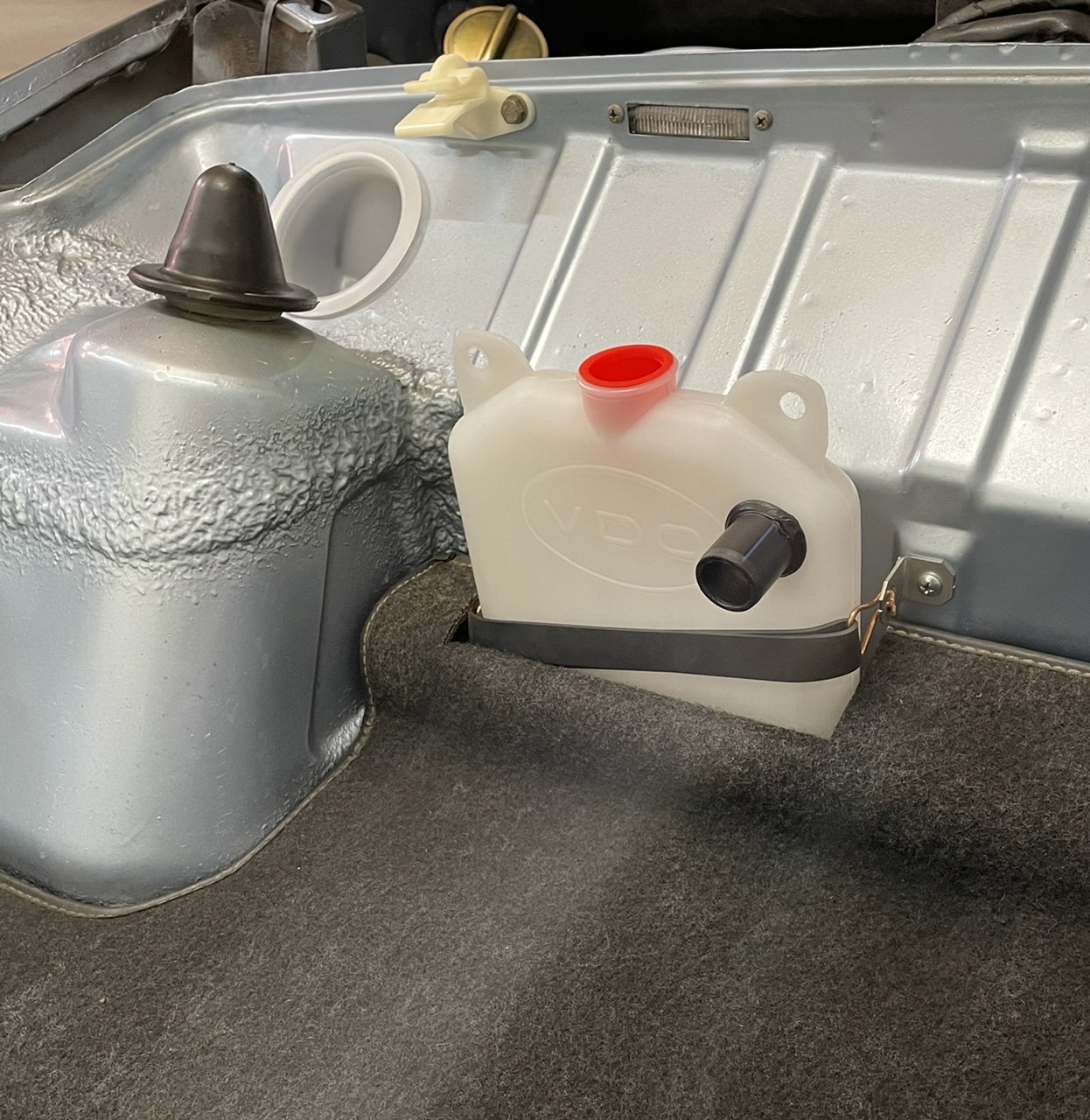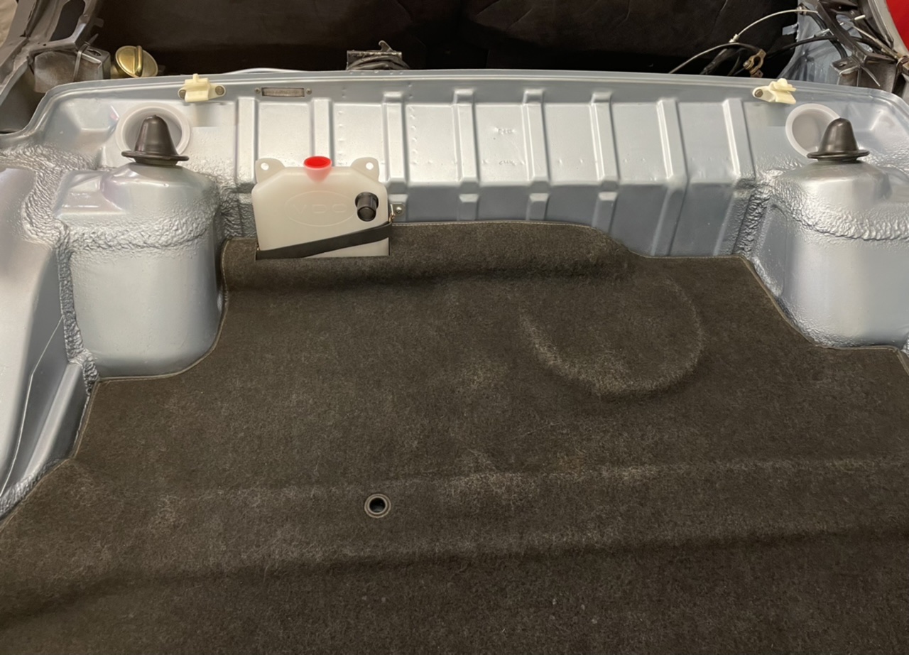 Placed the oil catch tank in the trunk. Need to order all the proper hoses now for the oil tank system. I copied the version that was used in the “Lufthansa” GT.