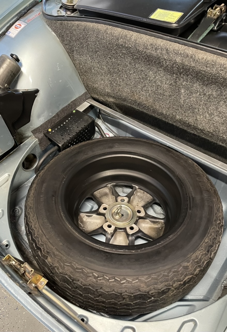 So picked up a spare rim at the Carlisle event. Placed that in. Needs a modern tyre. This one not keeping air because it’s from the Nixon administration era. (IMG:style_emoticons/default/biggrin.gif)