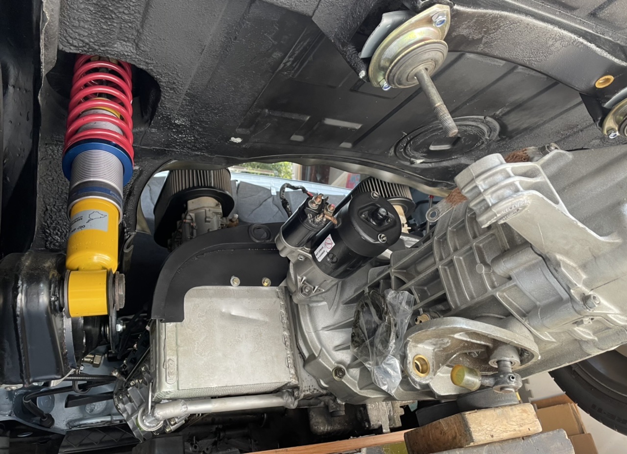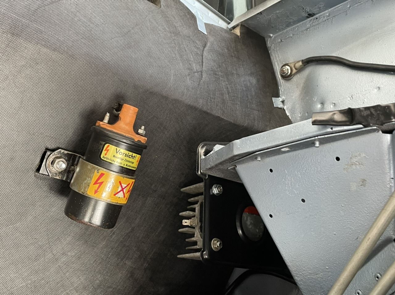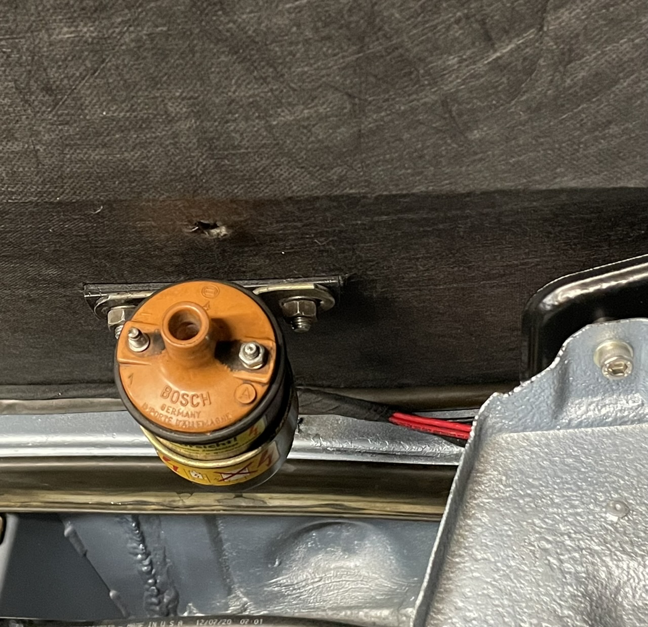 Needed a place for the coil. My early engine doesn’t have the provision to mount on fan housing. So using some square steel tubing, I made a mount for it and bolted that to the firewall in the same manner the GT cars had theirs.