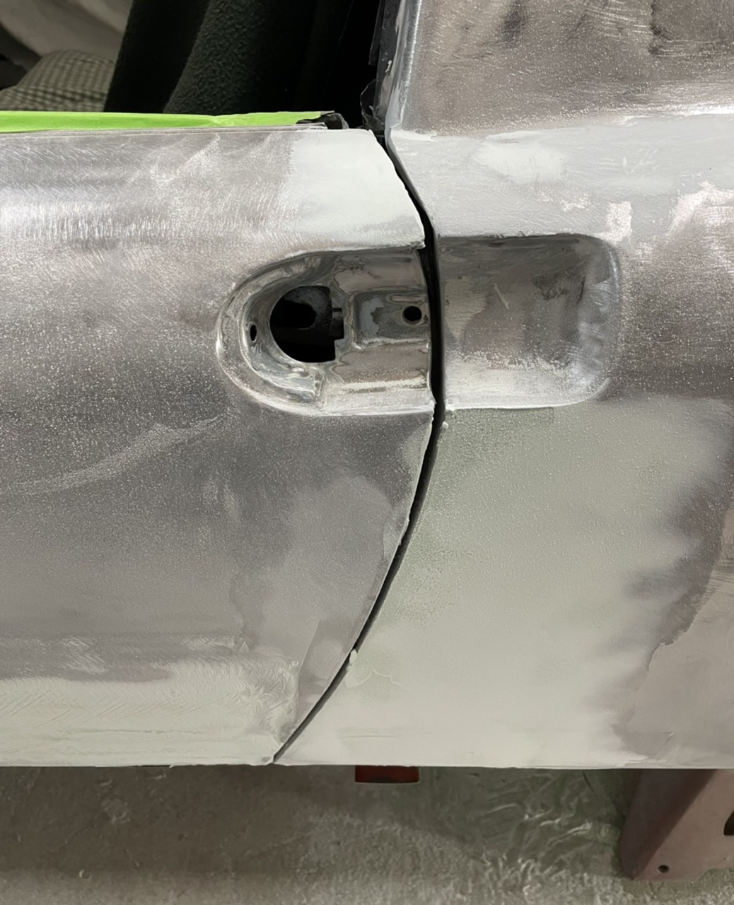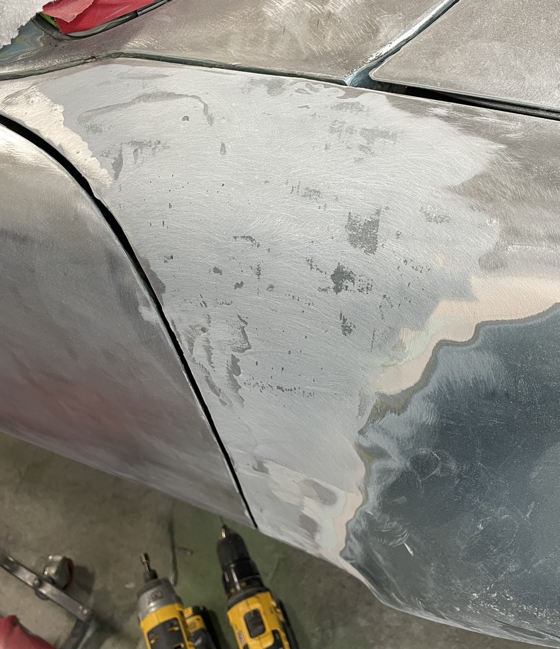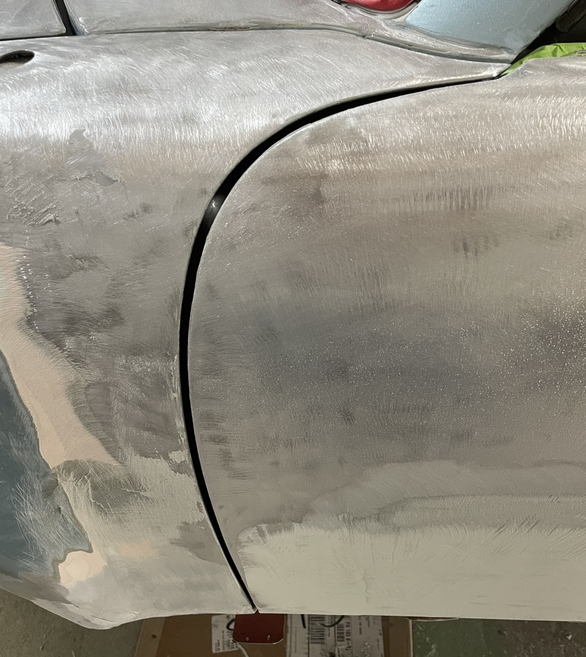 More finesse worked on this fender. He’s determined to get the crown of the fender top dead even with the contour of the door.