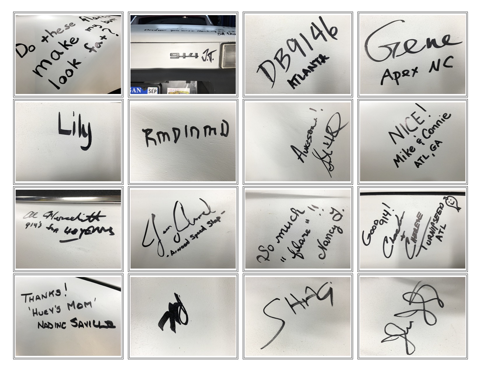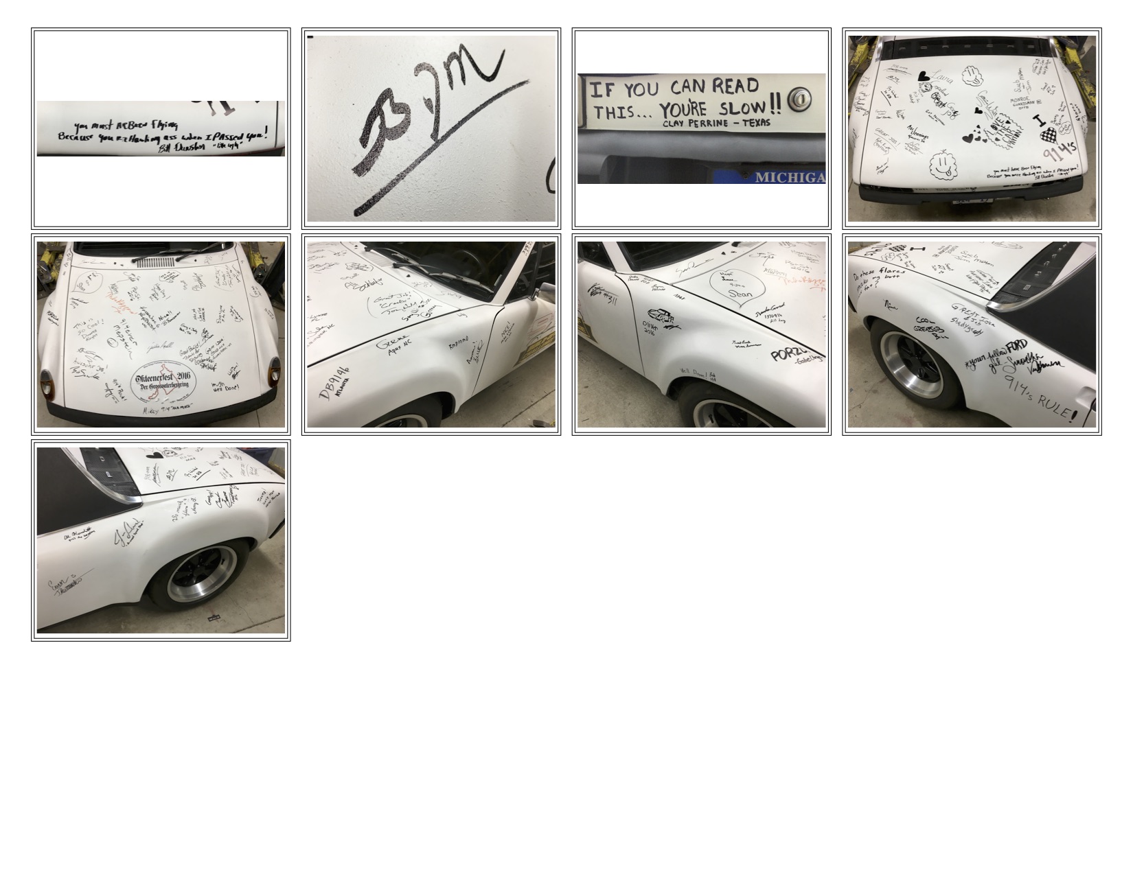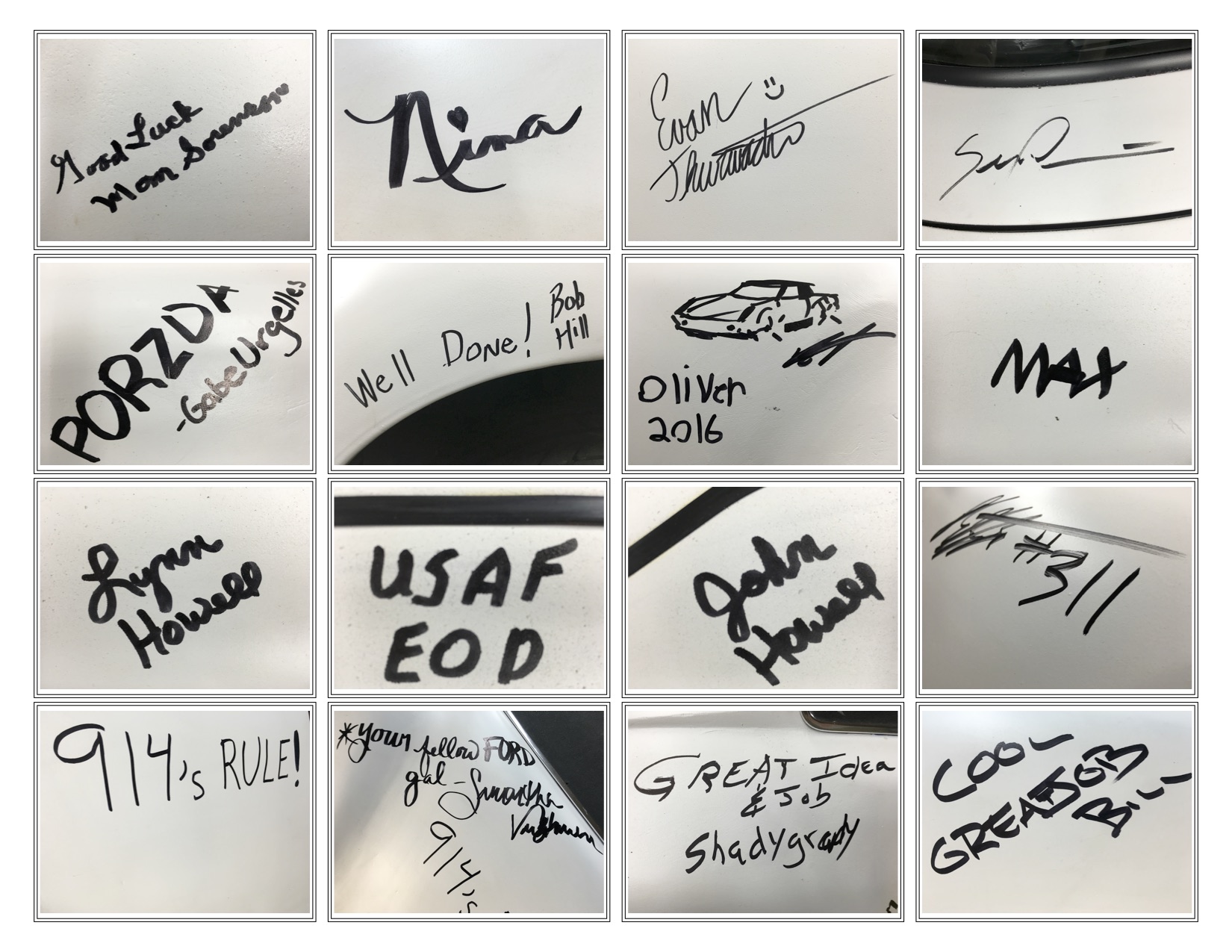 The paint is white Plasti-Dip flat white, sprayed over "not ready for show" body and paint work. Then ask all to sign the car with black markers. I had fun with this, and I had great response from everybody who wrote on the car, some had to be convinced to do that. (Plastic-Dip paint peels off) |