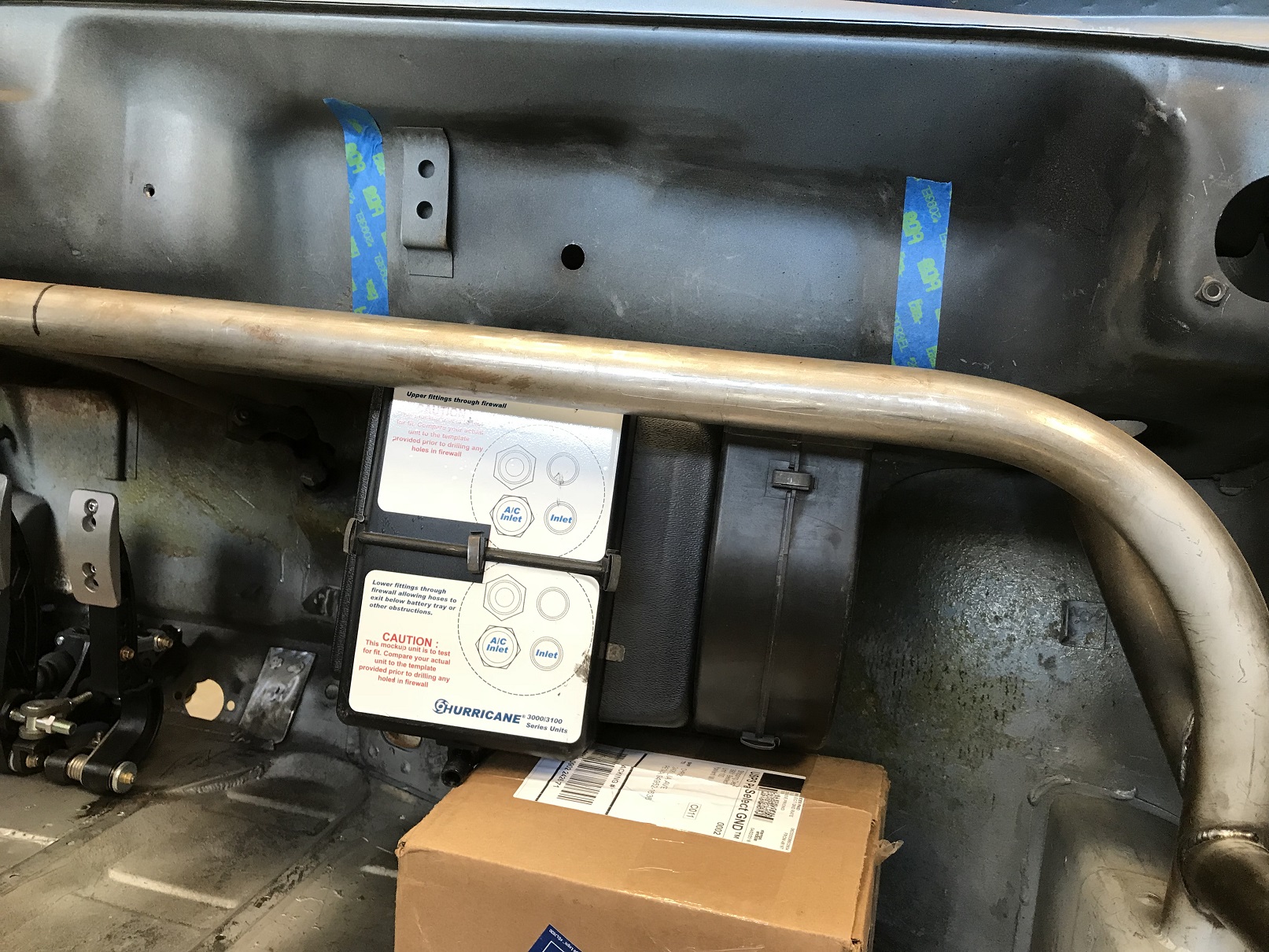 One of the upcoming sub-projects that I need to get figured out is where/how to fit the A/C unit. I don't like the traditional under dash units so I've rented a few different mock up units to see what might work. This one, from Old Air, seems to be the most suitable.