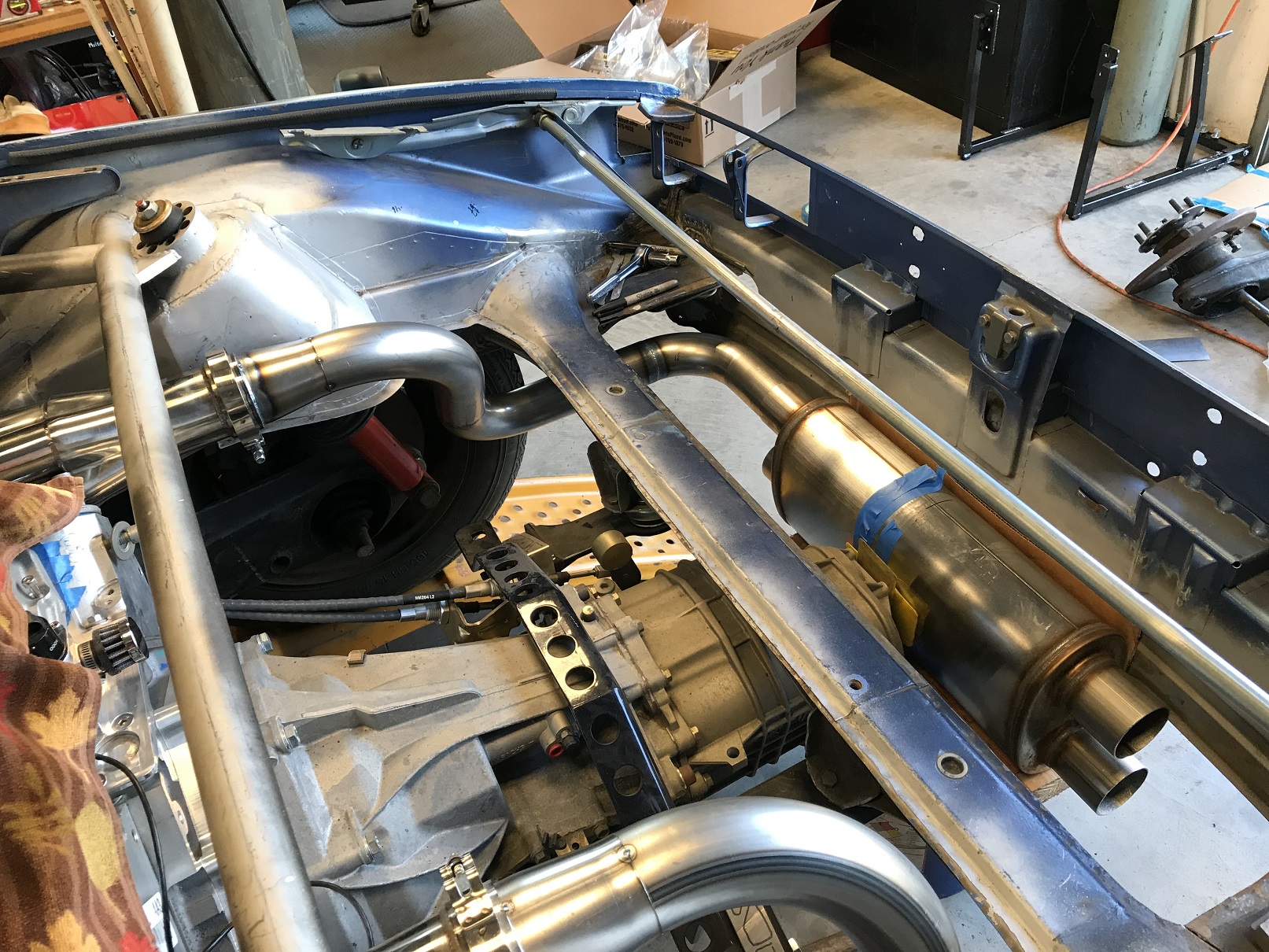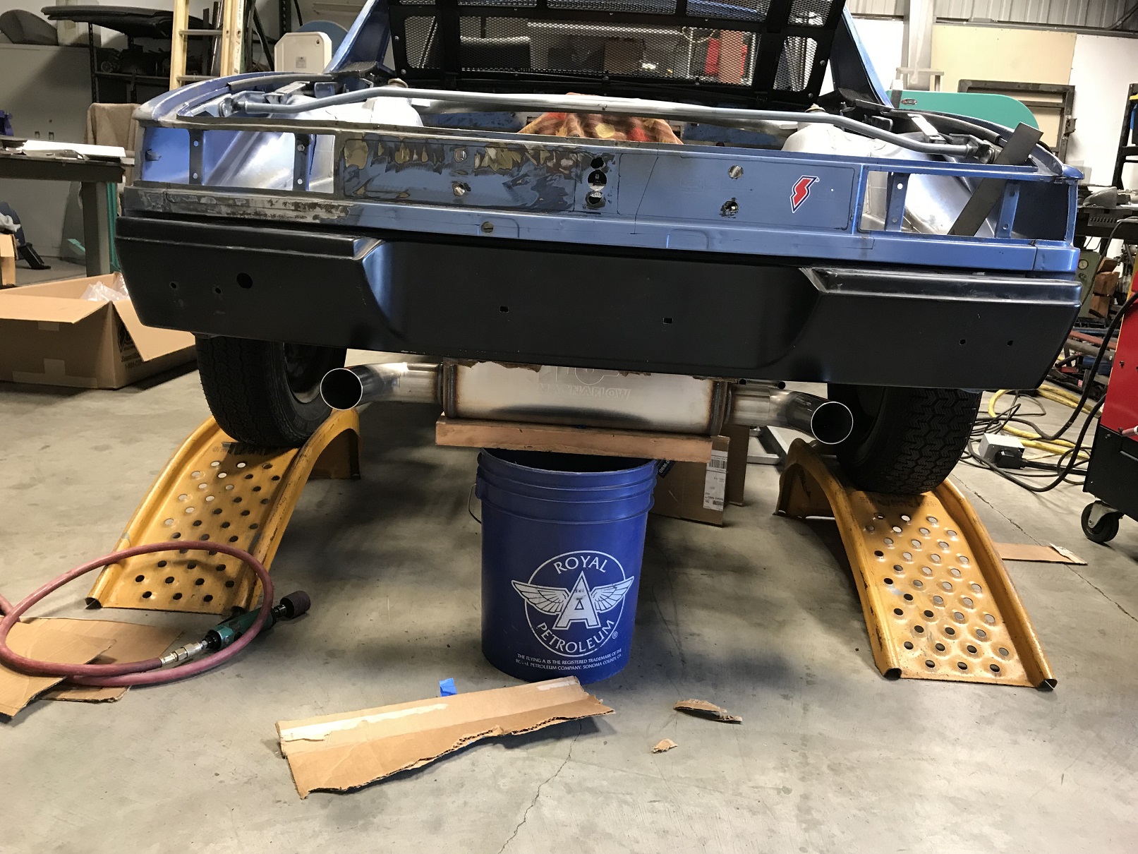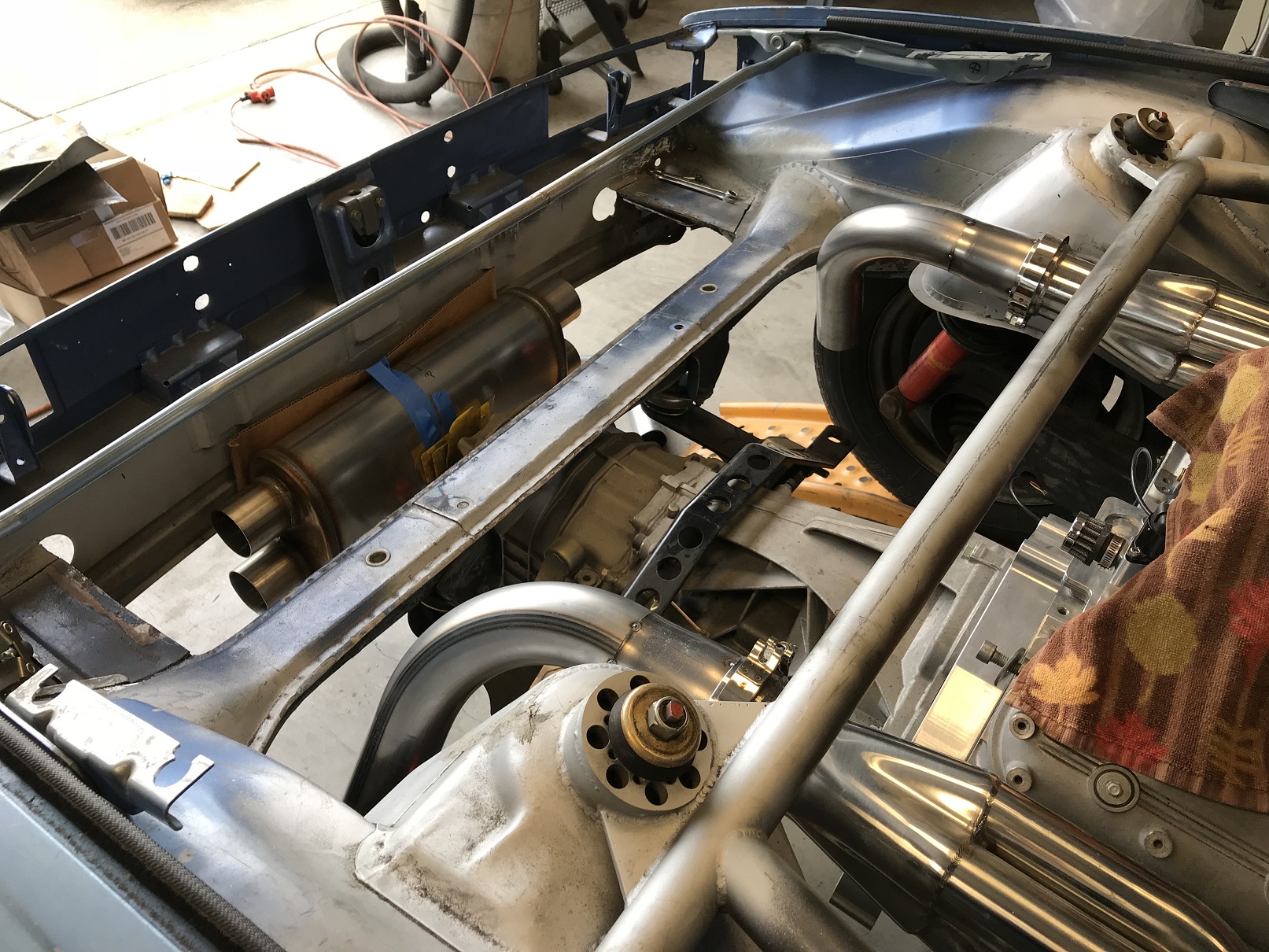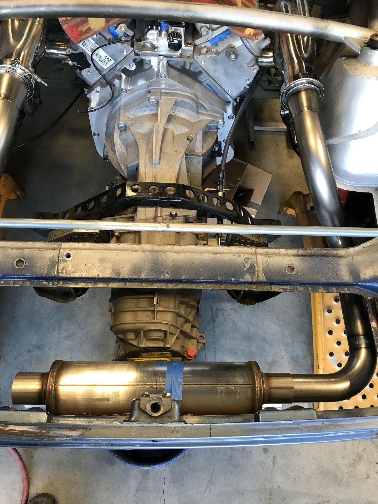 But on the off chance that turns out to be too loud, I got a Magnaflow internal cross over muffler. Each header feeds in the uppers on each side and the exhaust tips both come off the lower tubes. The muffler will mount like this here, except I'll use metal and not just blue tape and bondo spreaders...