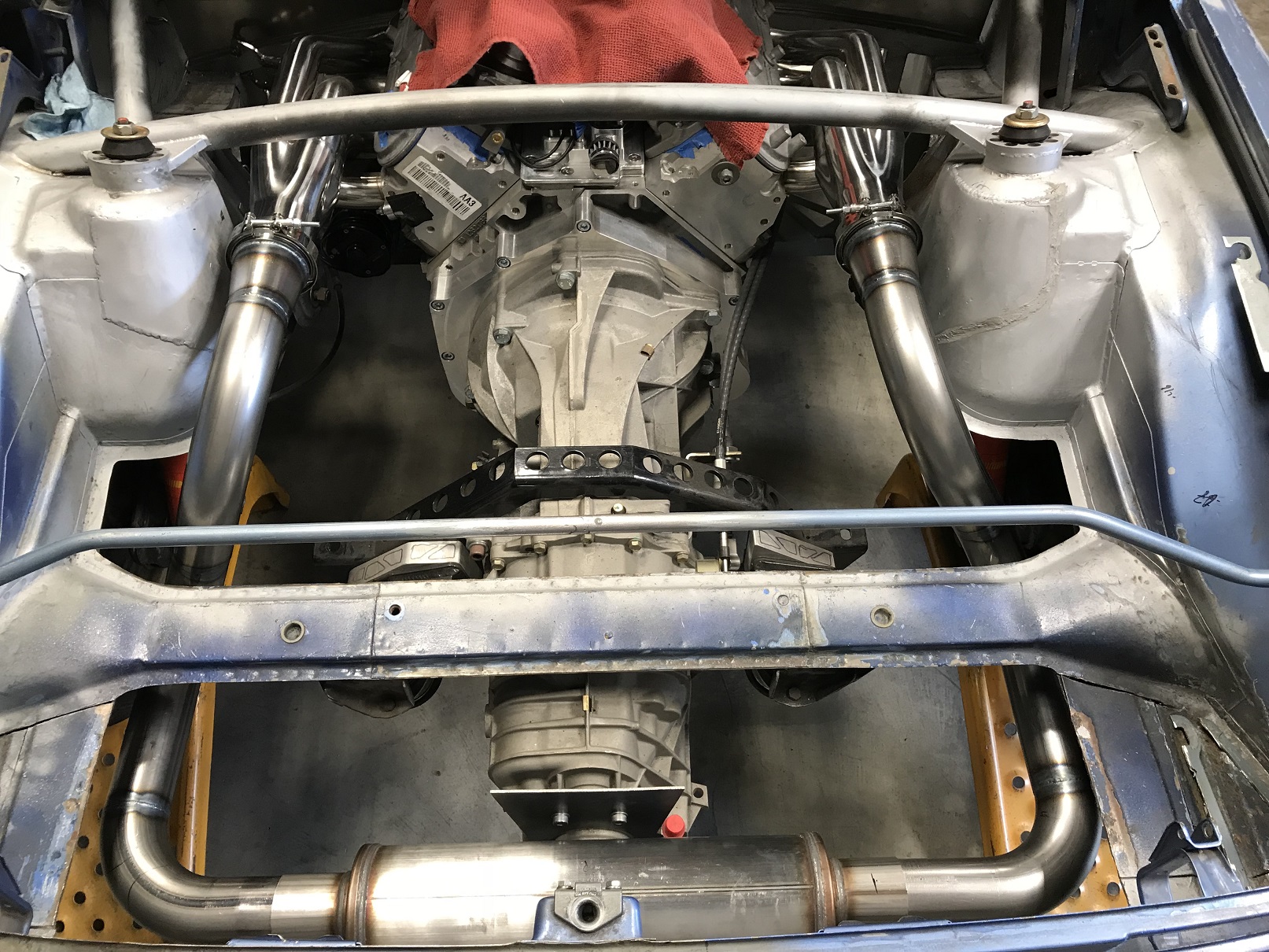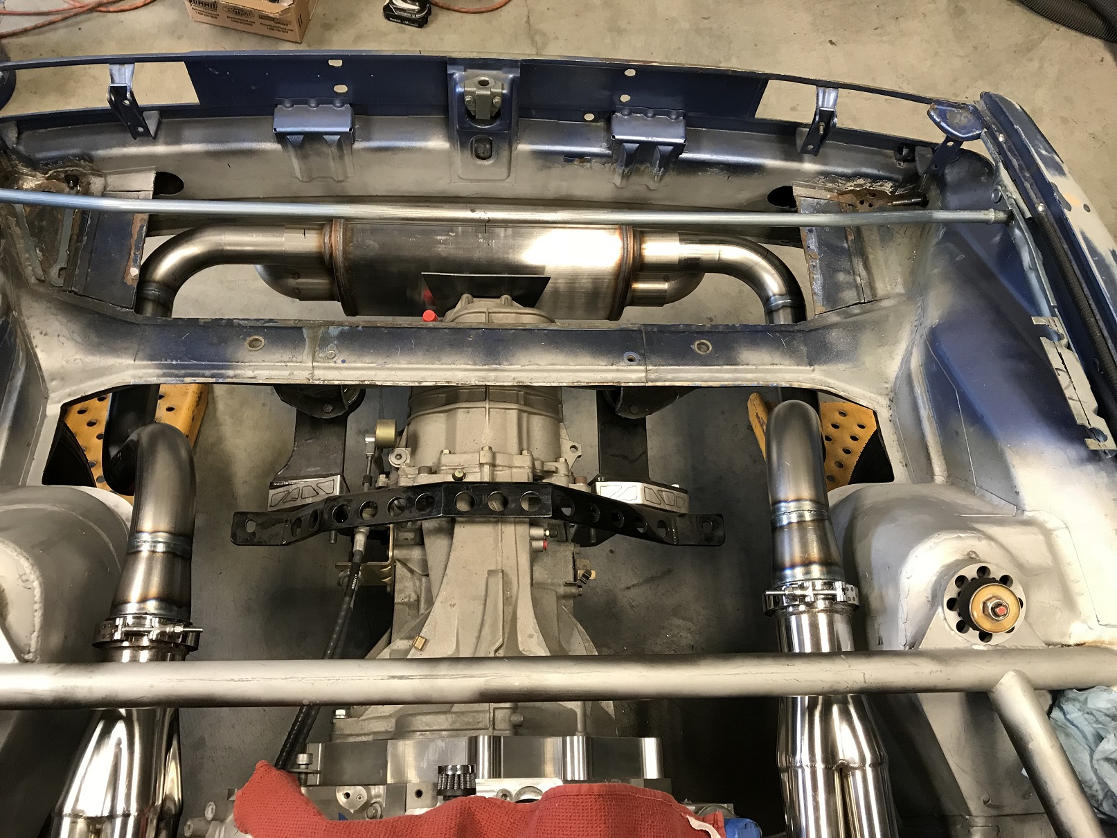 another. An no, it's not symmetrical side to side. I wanted the gaps between the outside edges of the floor and the exhaust to be the same, and that required slightly different angles where the tube drops 90 degrees coming out of the header. Plus, one collector sits farther back.