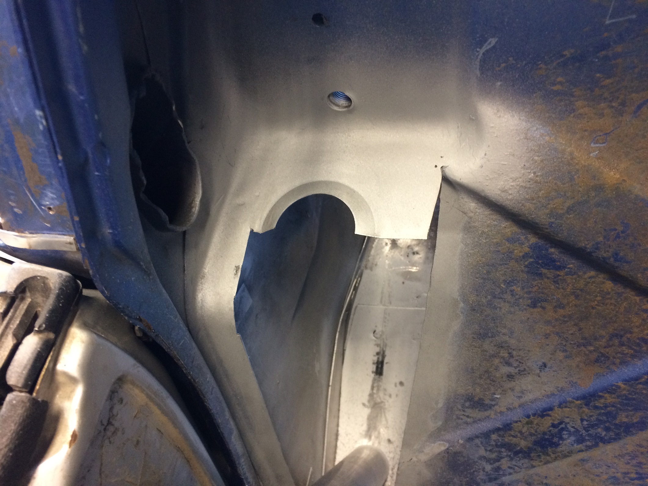 I can't get the hoop into place with the final interior sheet metal in place - the shape of the hoop and angle it has to be at to be fit into the car don't allow it. Before the hoop can be welded in, I have to fab a bunch of pieces of sheet metal that will be slipped onto the hoop, slid out of the way while it's set in place and welded in. Then all the sheet metal will slid into place to be welded. It's hard to explain but maybe this series of pics will help. This is the early fab and fitting of how I plan to close in the hoop. I punched and dimple died that top piece and started messing with rolling the other piece and using the bead roller to form the flange. I'll use a combination of fabricated pieces and some of the stock firewall from the parts car. So at this point, it's really at the "see how this fits/looks, try again if I don't like it" stage. By the way, I don't like this. It'll be MUCH tidier, the stamped elements in the fire wall will terminate in an attractive way, etc. But you get the idea. Attached thumbnail(s) |