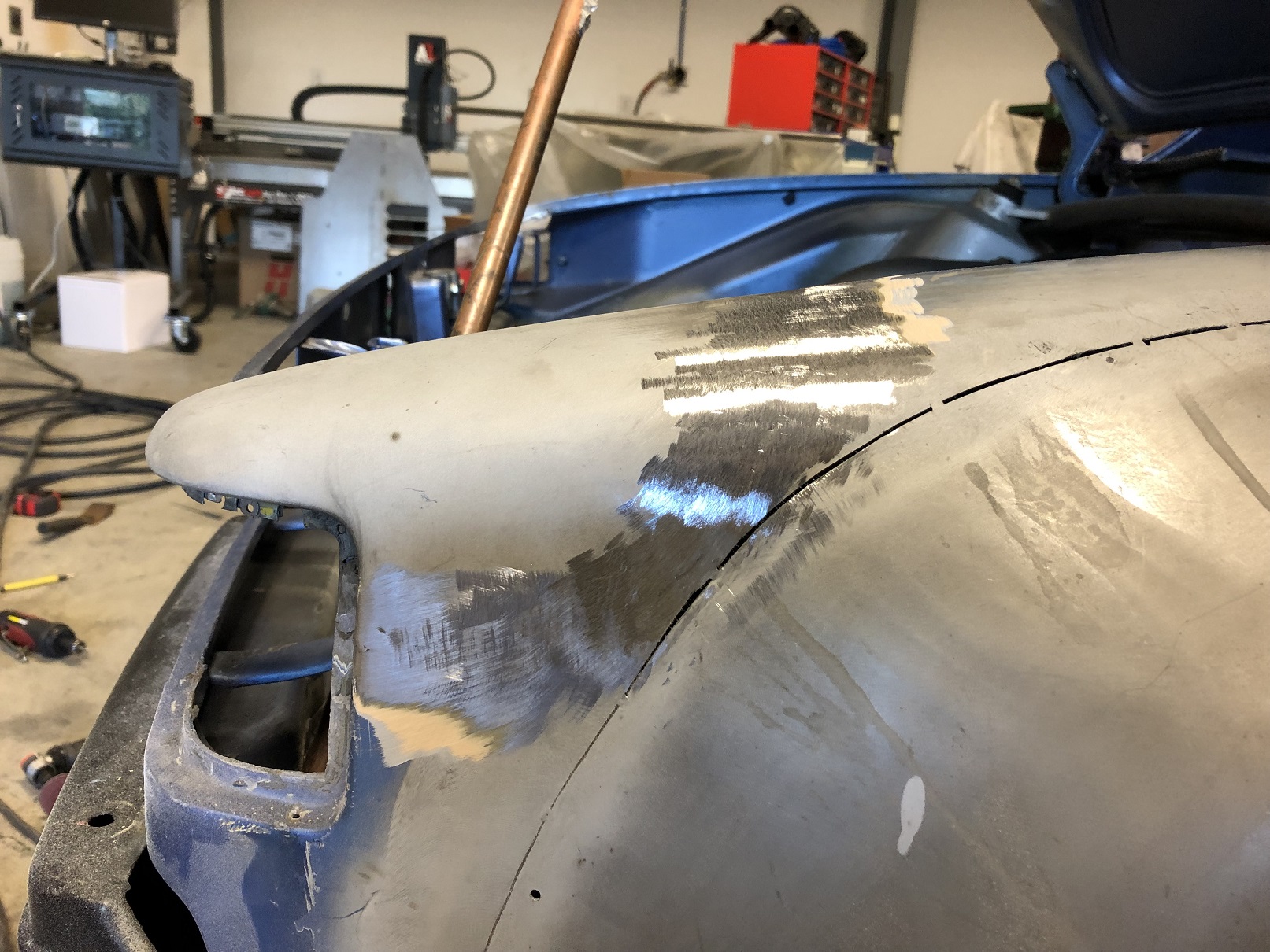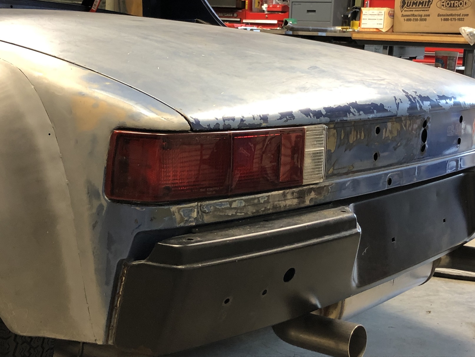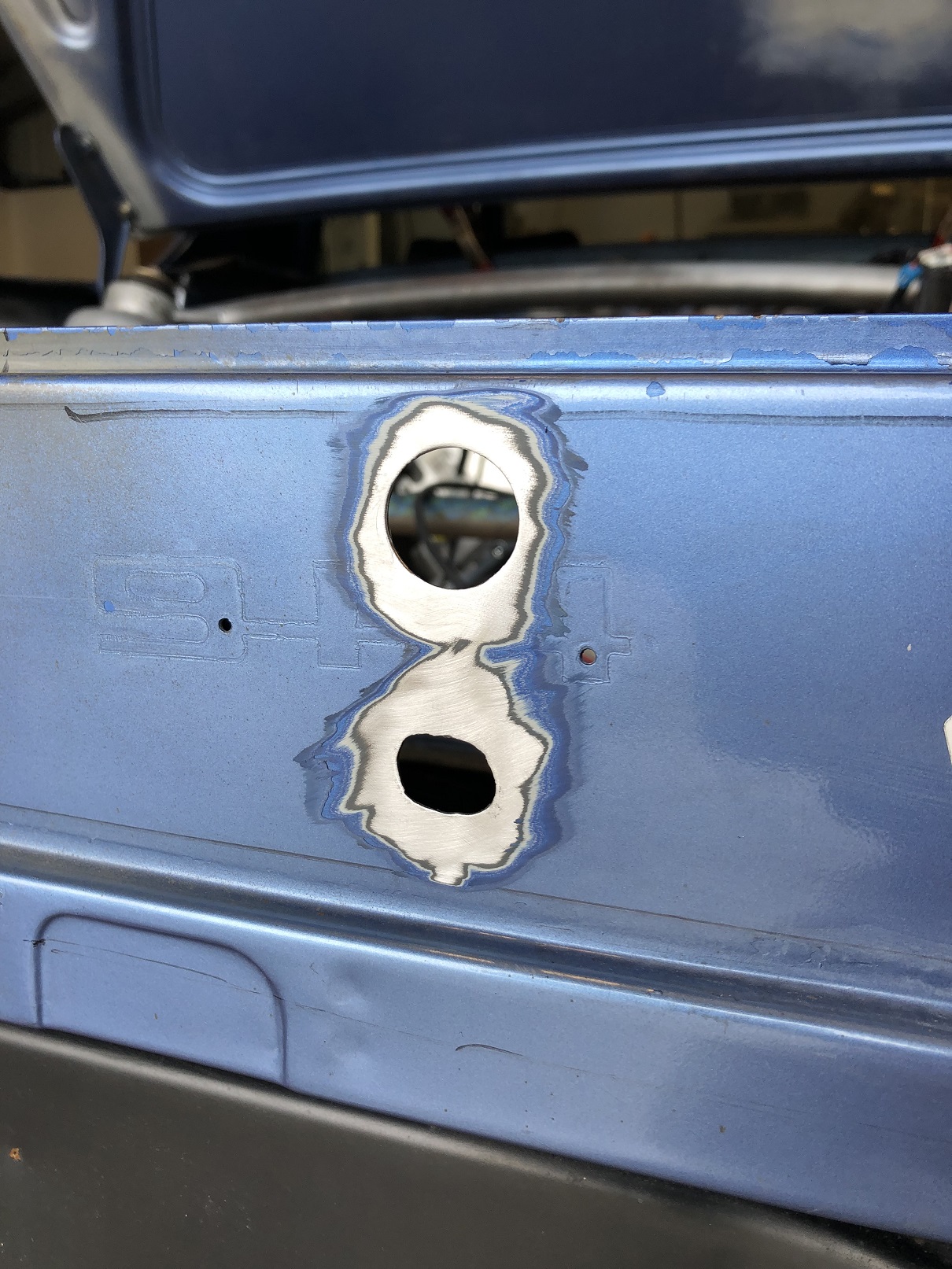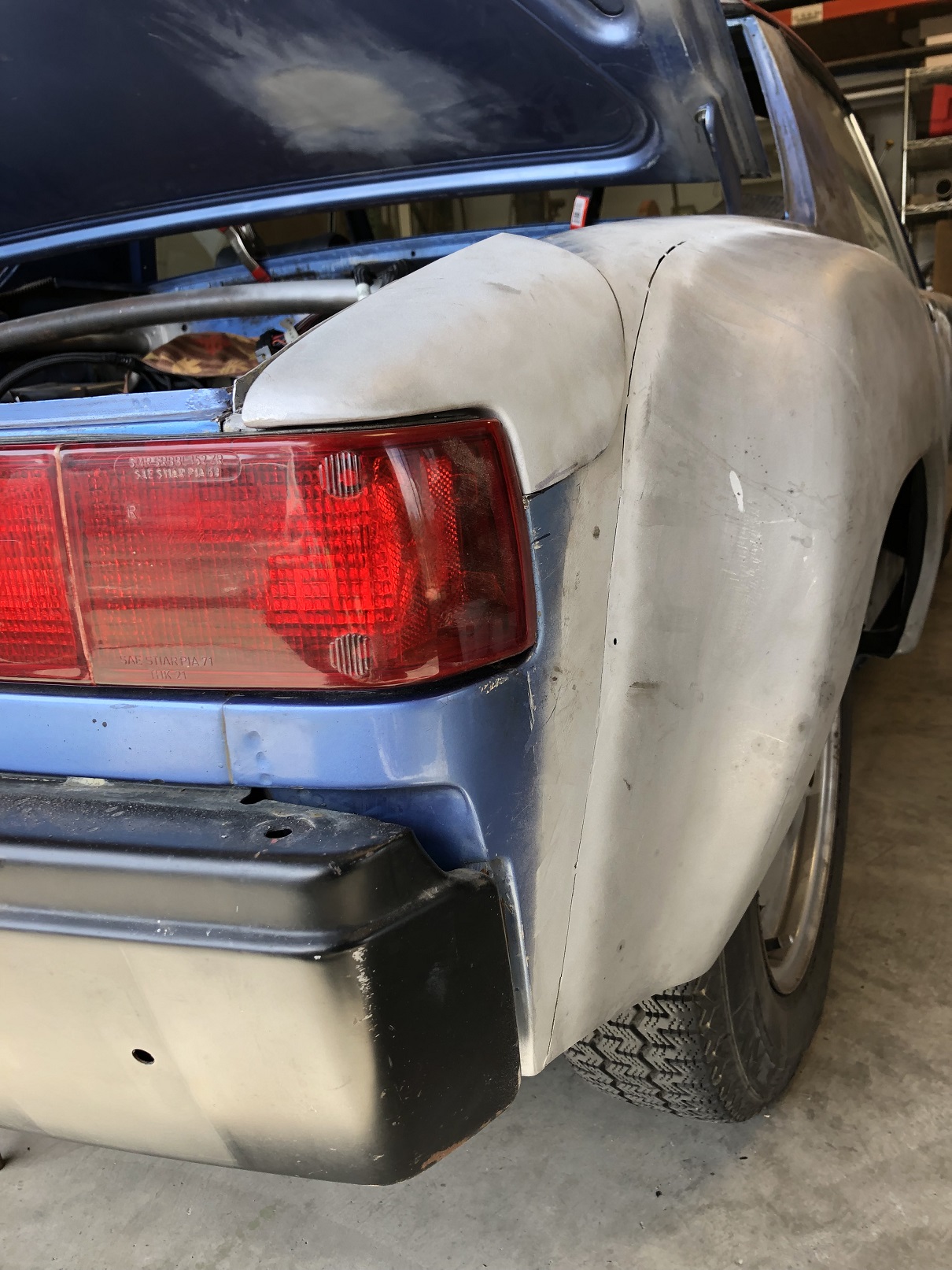 More repair work on the rear panel. This car had a 911 reflector added at some point and the installer "made openings" in the panel to affix the reflector. Notice I didn't say "drilled holes". Holes are round. These? Not so much.