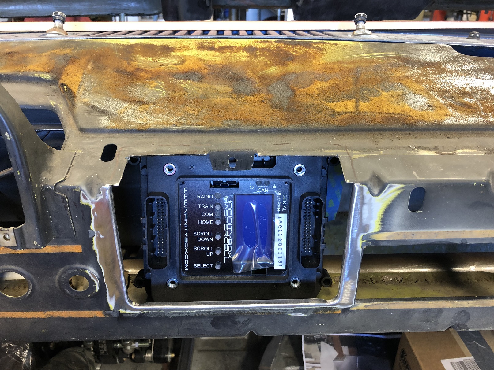 But today, as I'm sitting in the car making VroomVroom noises and fantasizing that I may one day actually drive it, I noticed the space behind the dash that's usually occupied by the air controls - that I won't be using. (IMG:style_emoticons/default/idea.gif) What are the chances the main brain will fit there? (IMG:style_emoticons/default/idea.gif) It does! However, that this unit needs to be accessible for programming and trouble shooting. So I figured I could create a larger opening and fab up a flip-up cover for it. So I cut the dash up from the factory air control opening, leaving a bit of extra material that I could hammer and dolly to tip in a return to match the factory opening. I've only started on the vertical edges but you get the idea. This looks like it'll work great. Attached thumbnail(s) |