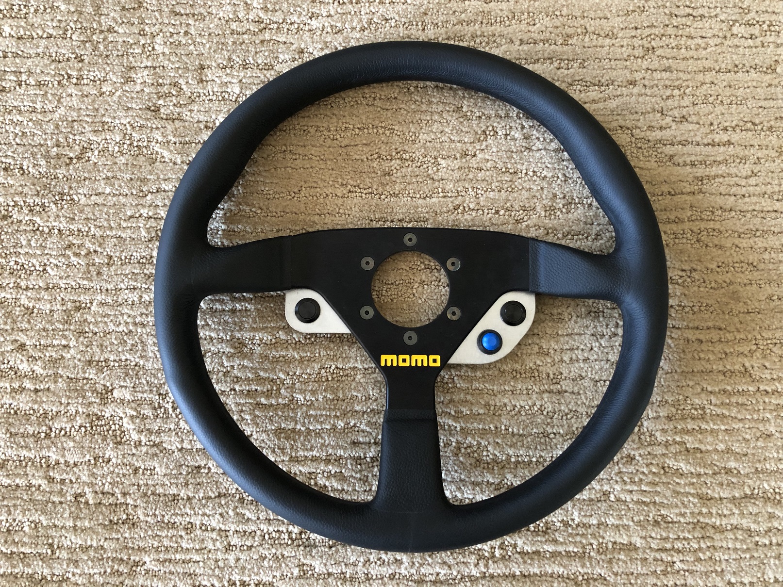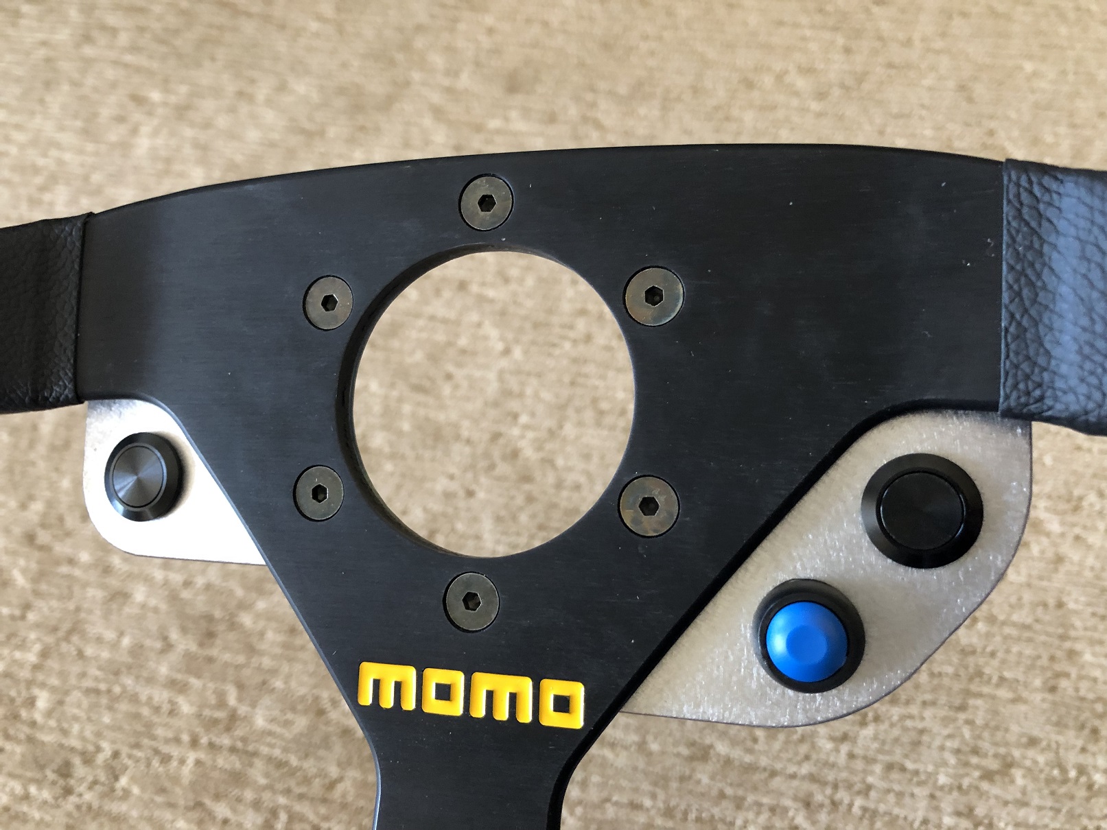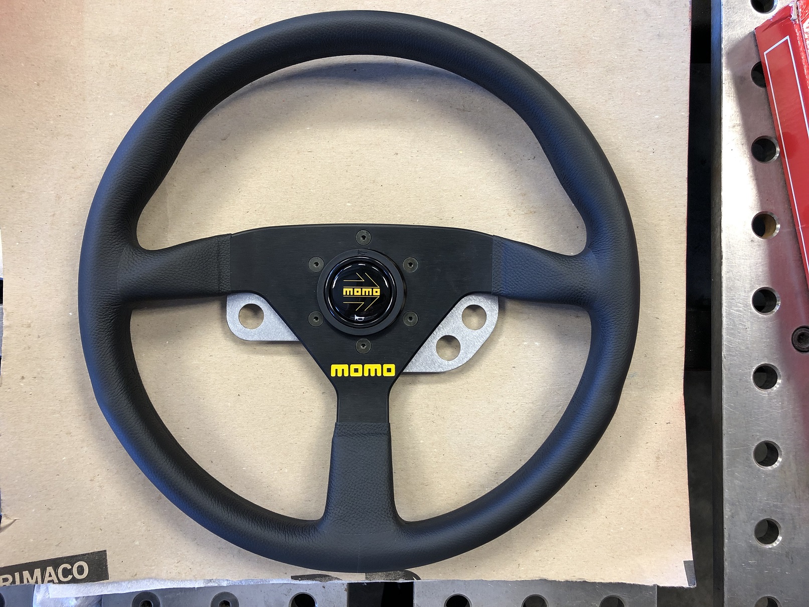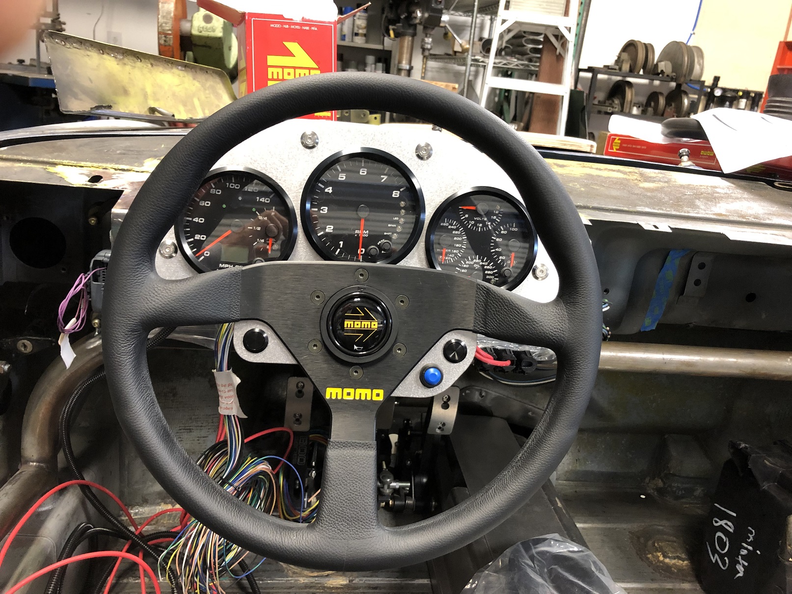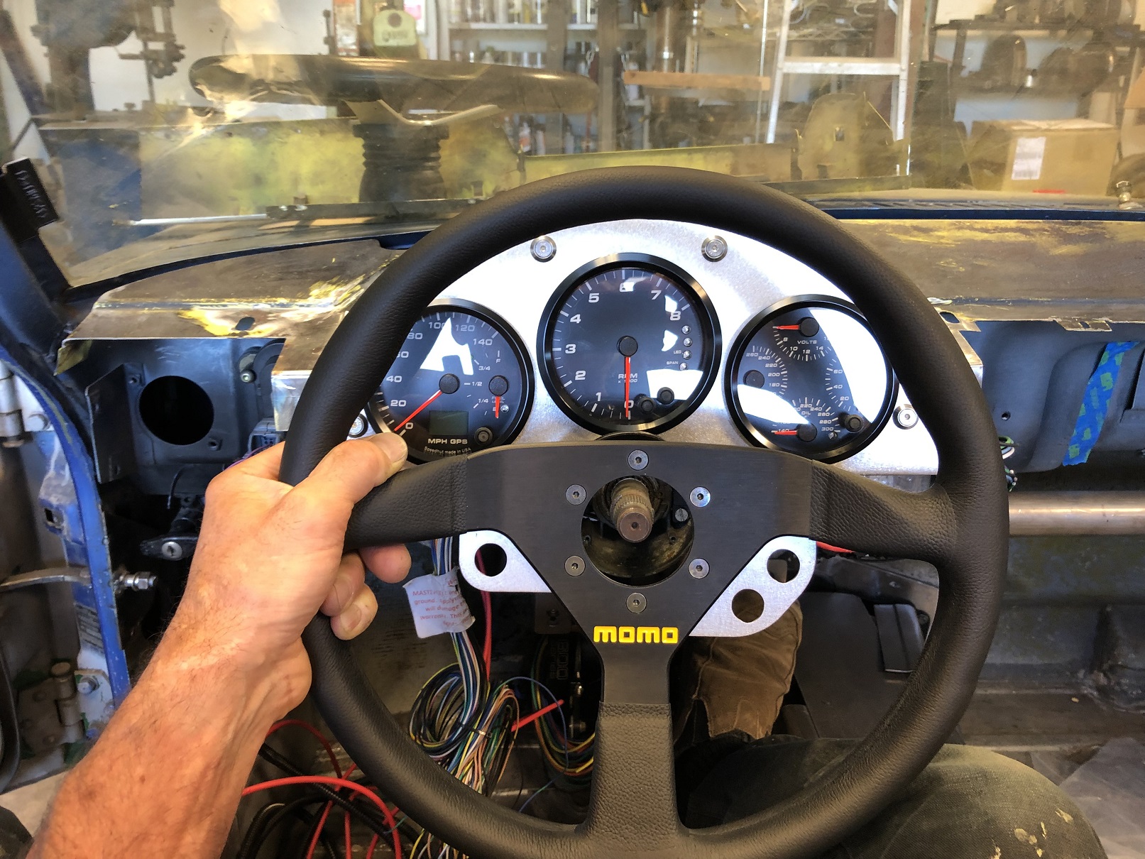 I decided to upgrade the steering wheel to something that allowed even better gauge visibility. This is a 350mm Momo Mod 78. The "straight across the top then drop", three spoke set up is a big improvement over the previous wheel - without moving my head at all, there's virtually no part of any of the gauges I can't see. The Momo hub is on the way so pardon my manual positioning in that last pic...