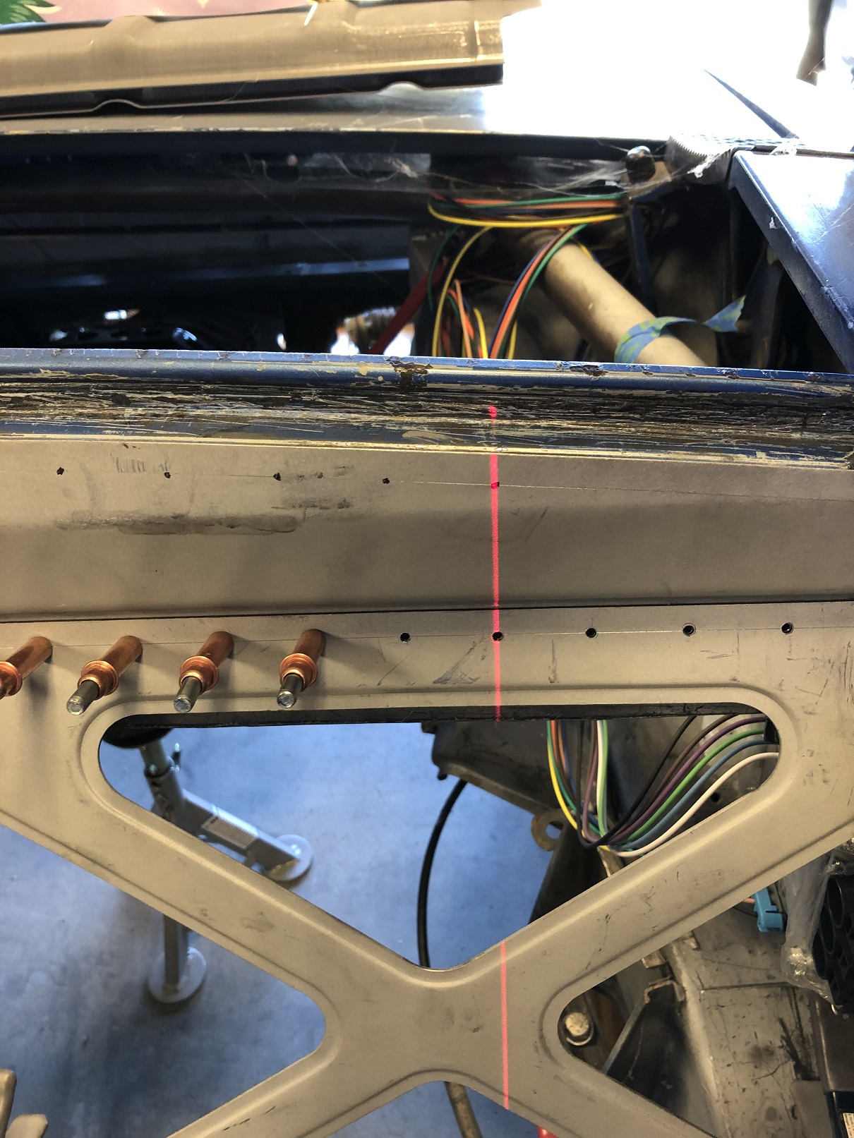 I want all the rivets to align vertically. The fun part is that the rivet line on the main panels is level but the line in the upper panel is slightly curved. This means I can't just set the rivet fan to the same distance since the rivet line on the curve is longer. So, I used the laser level, positioned it appropriately for each rivet and marked directly, vertically above each main panel rivet. It's always a bit more complicated than you think it'll be... Attached thumbnail(s) |