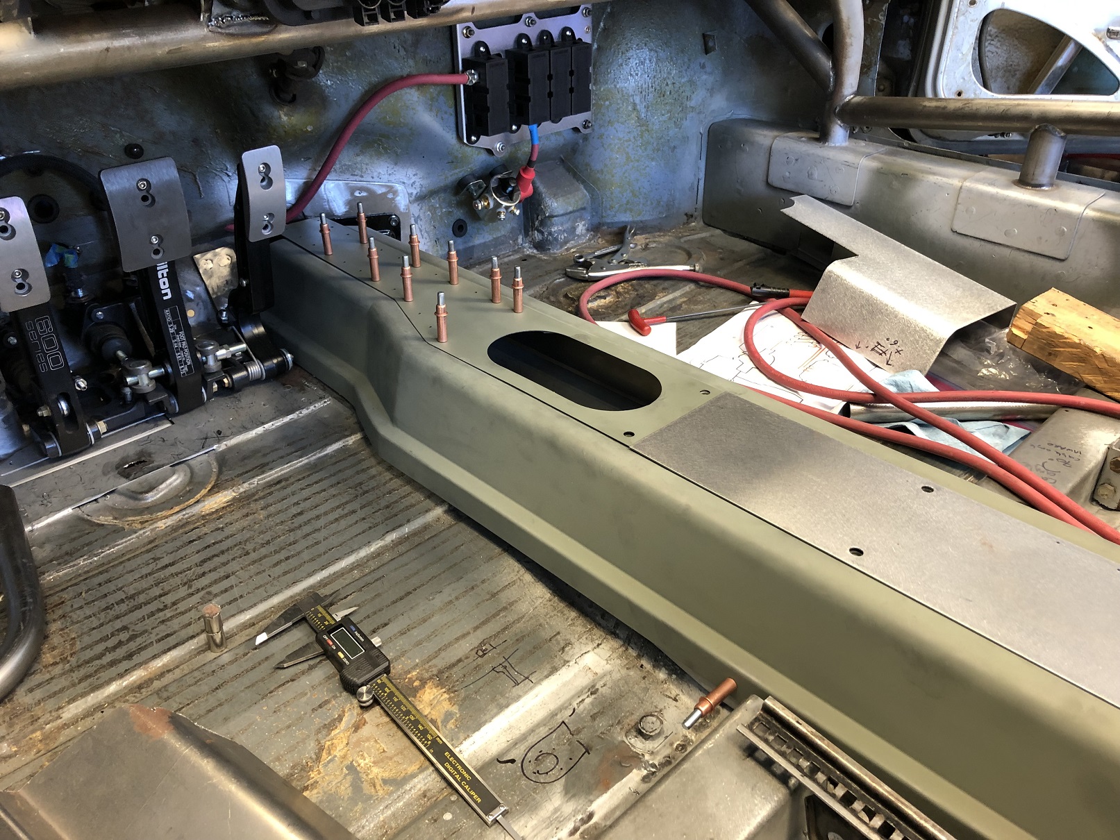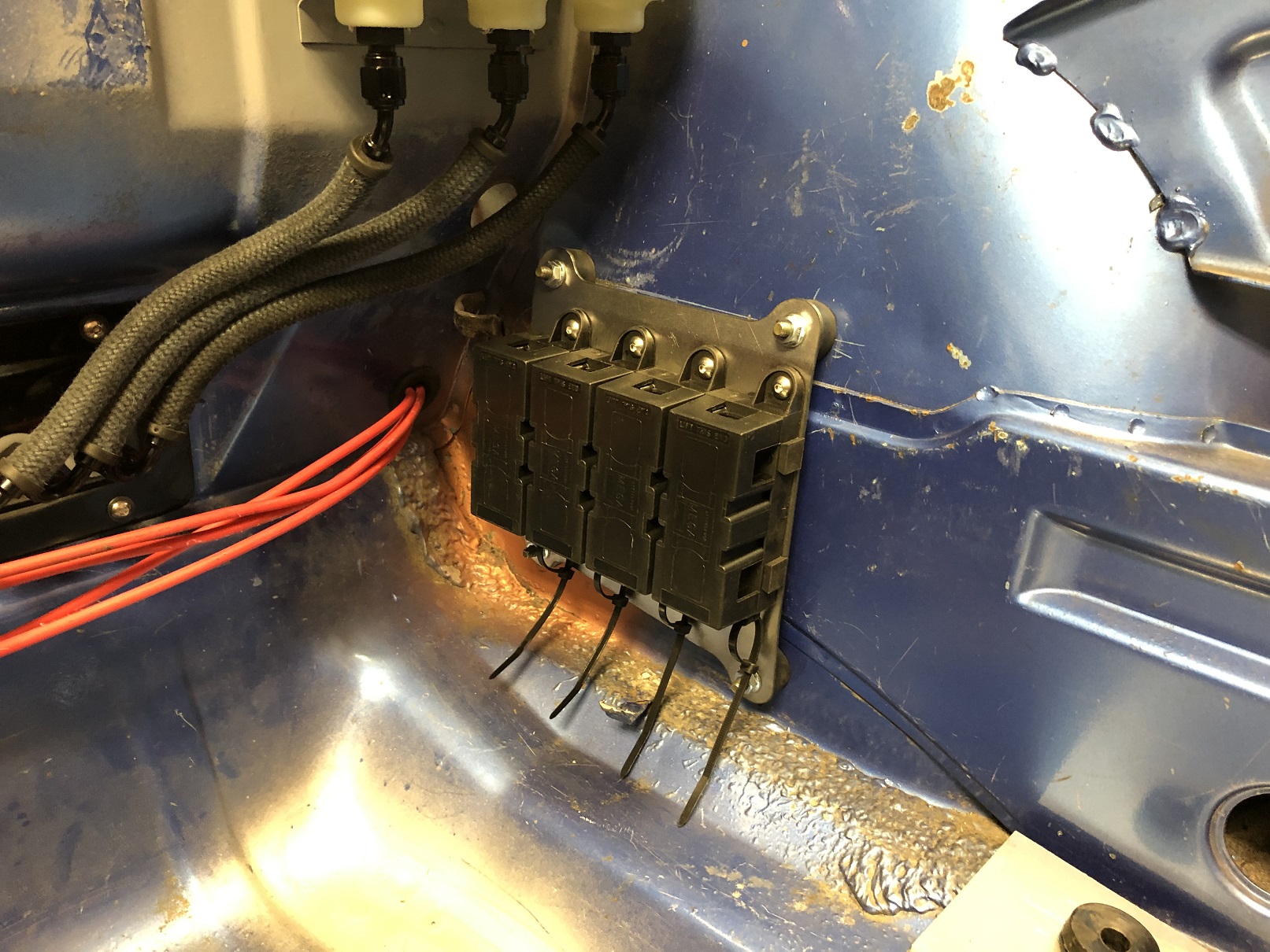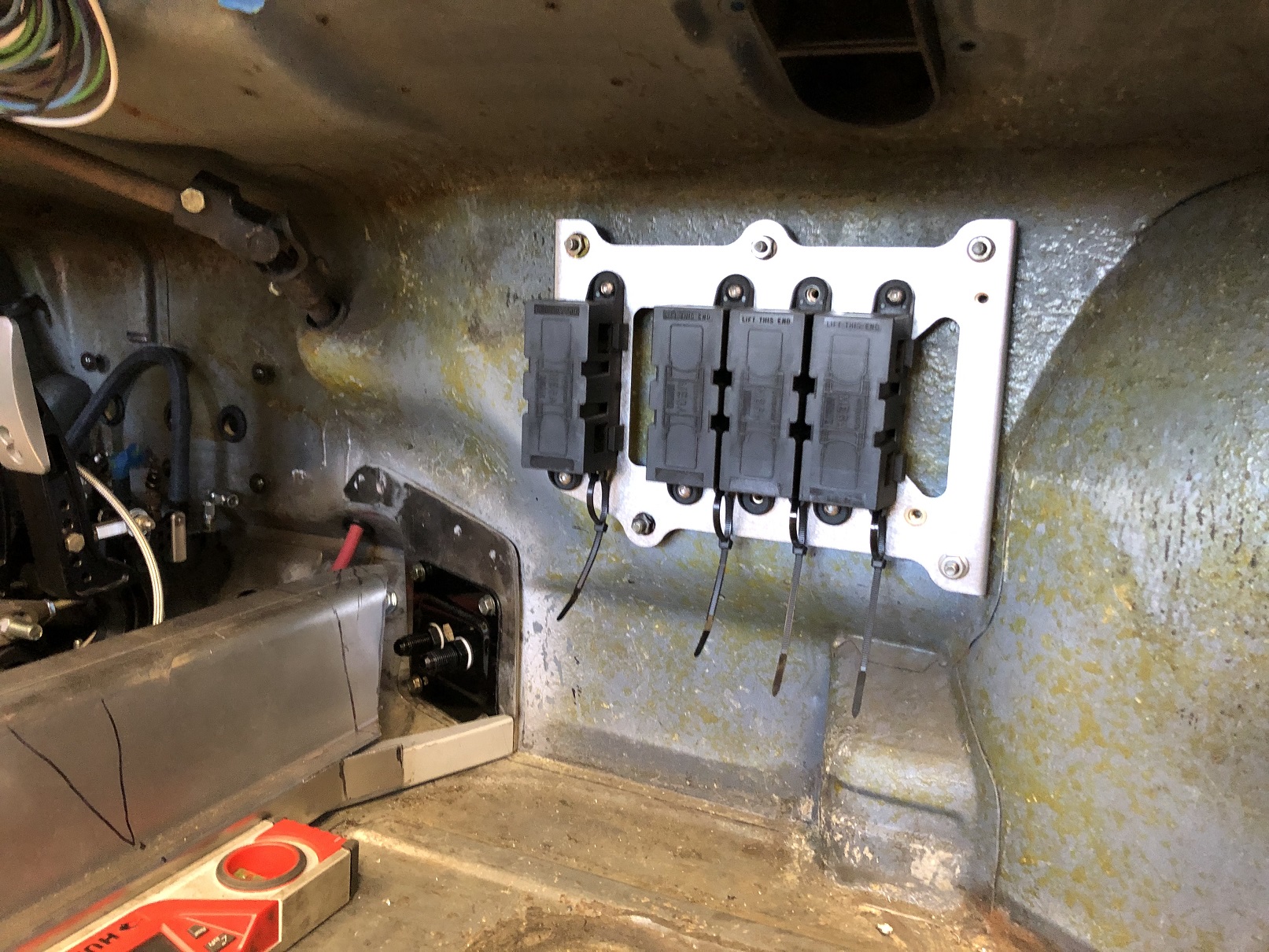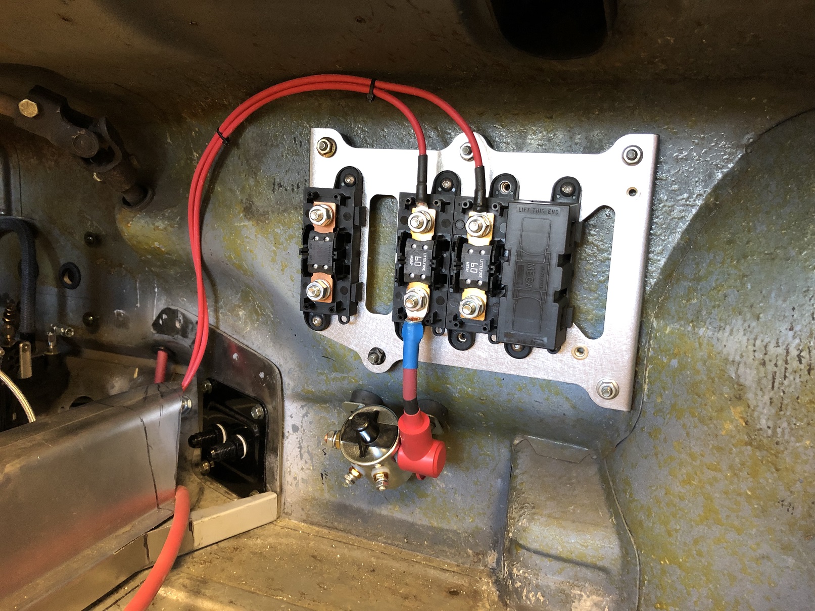 And to continue with my "redo it - again!" trajectory, I rethought the location of the power block and moved it out of the frunk to what will be behind a foot rest. @bbrock , you win again. This is V6 of this panel! Anyway, the move de-clutters the frunk, shortens the wiring runs (which no longer run through multiple body panels) and means I can service essentially all the key electronics from inside the car. Sharp eyes will notice this panel holds five power blocks. There's a fifth that supports an electrically (electronically?) controlled battery disconnect. Again, mounting it here, right near the other blocks simplifies the wiring. You'll see it as I get that gizmo mounted. Attached thumbnail(s) |