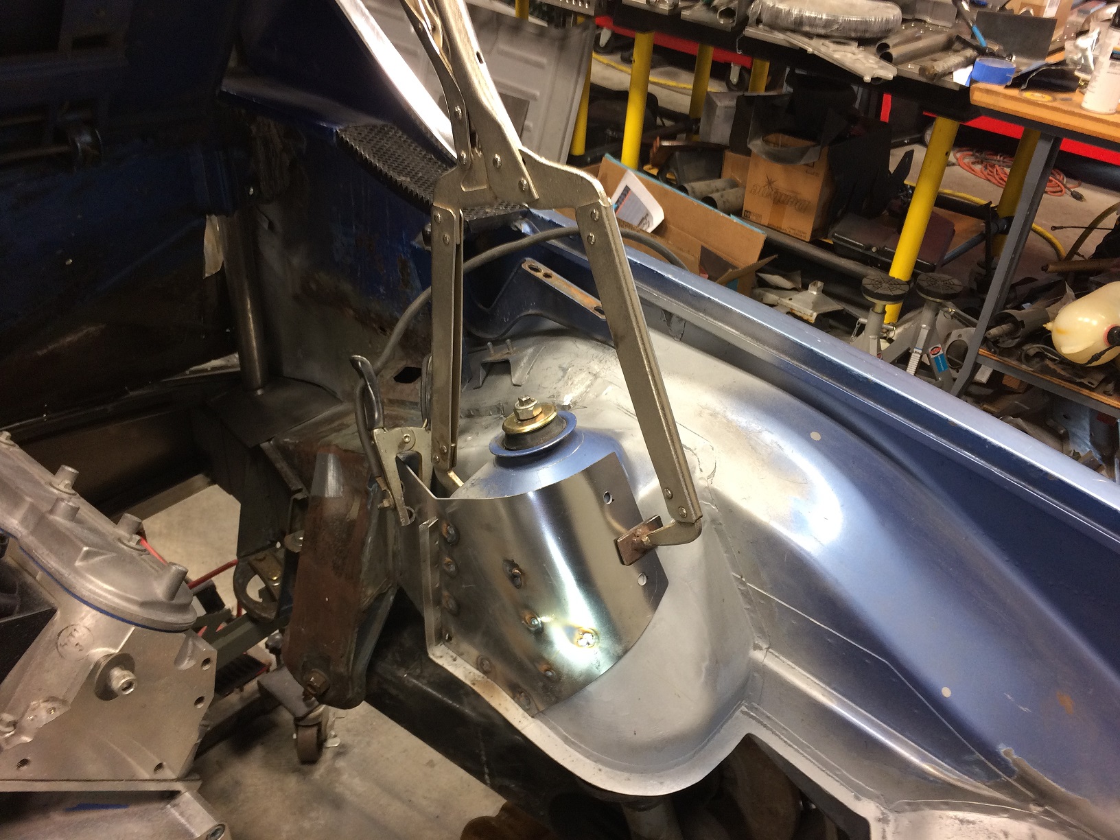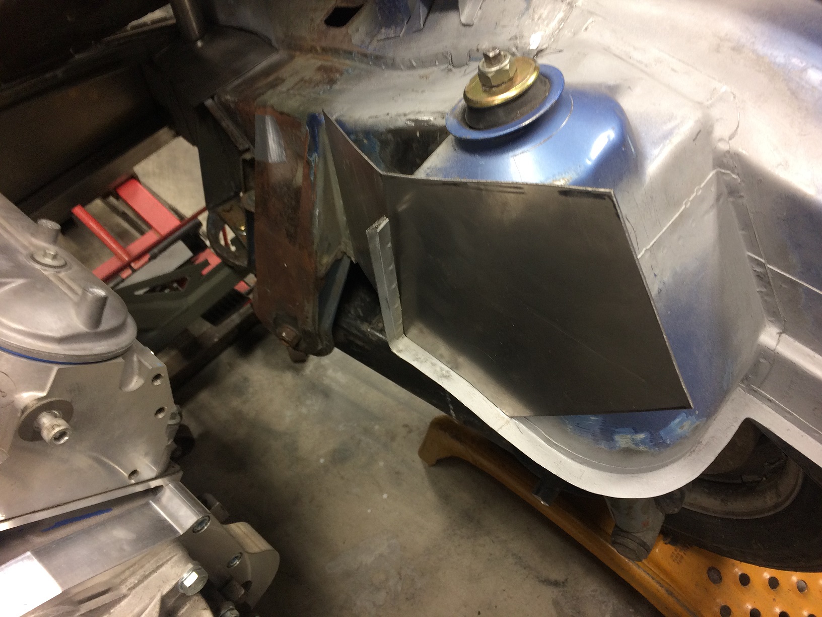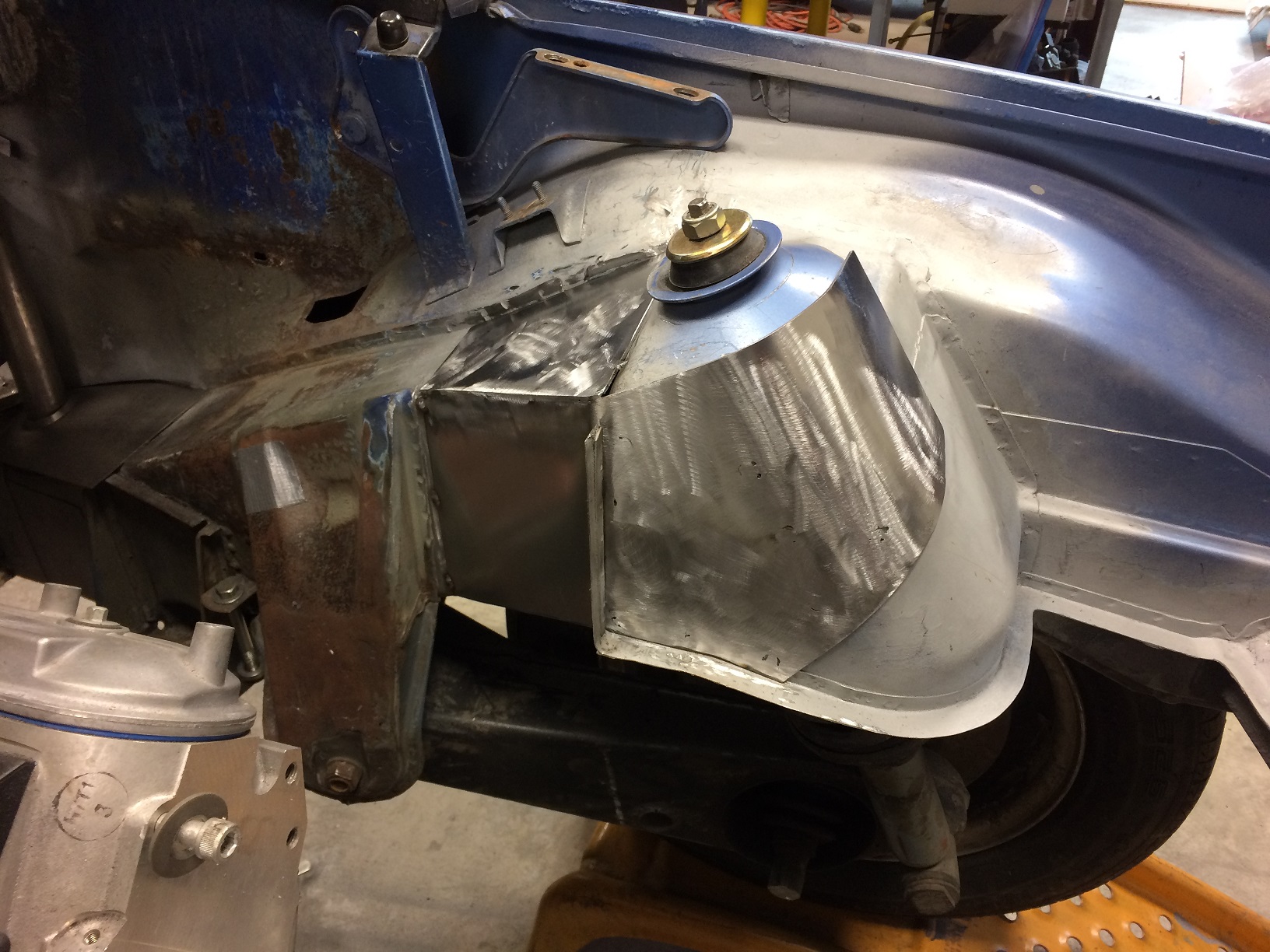 I tacked it in, "persuading" it to wrap the tower, plug welding as I went along. Then fit and tacked in the top part. It's plug welded, too. I still have to final trim the top part where it wraps the tower. I left it a bit tall for now as I may plate it to the Tangerine Racing raised rear shock towers, once those are installed. Then I need to add a bottom piece to close in the box and seam weld everything. Attached thumbnail(s) |