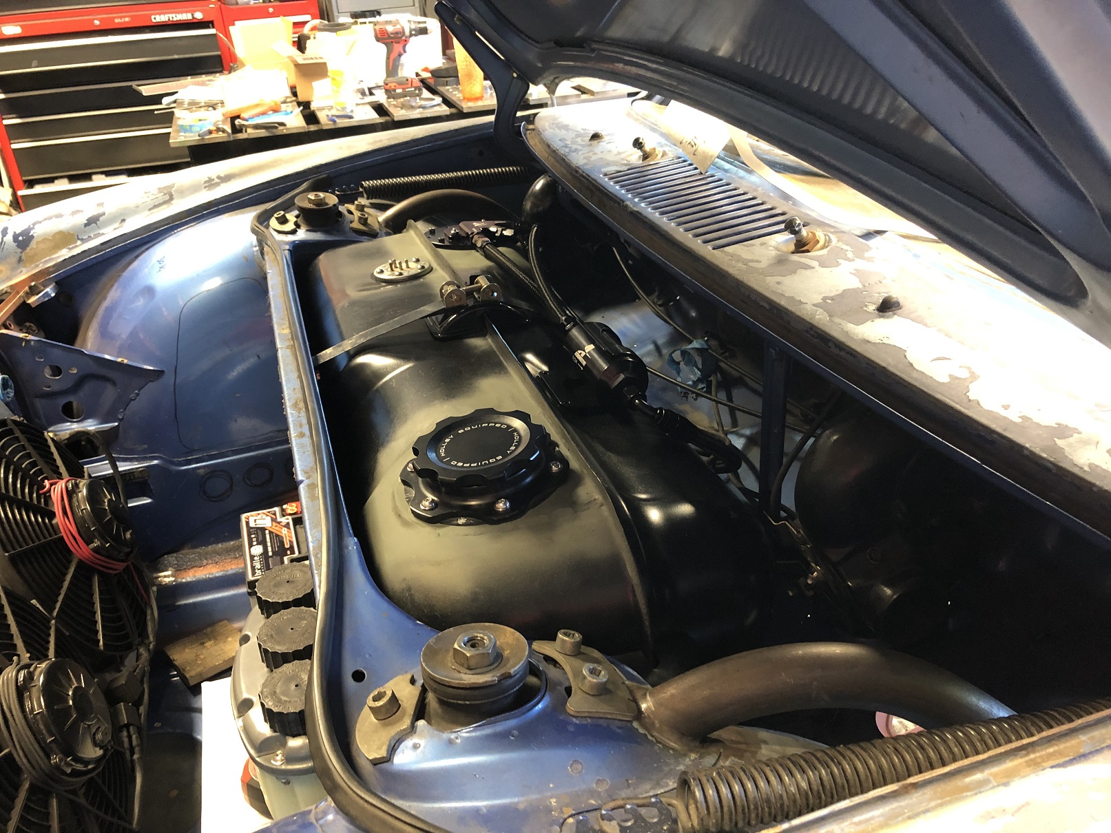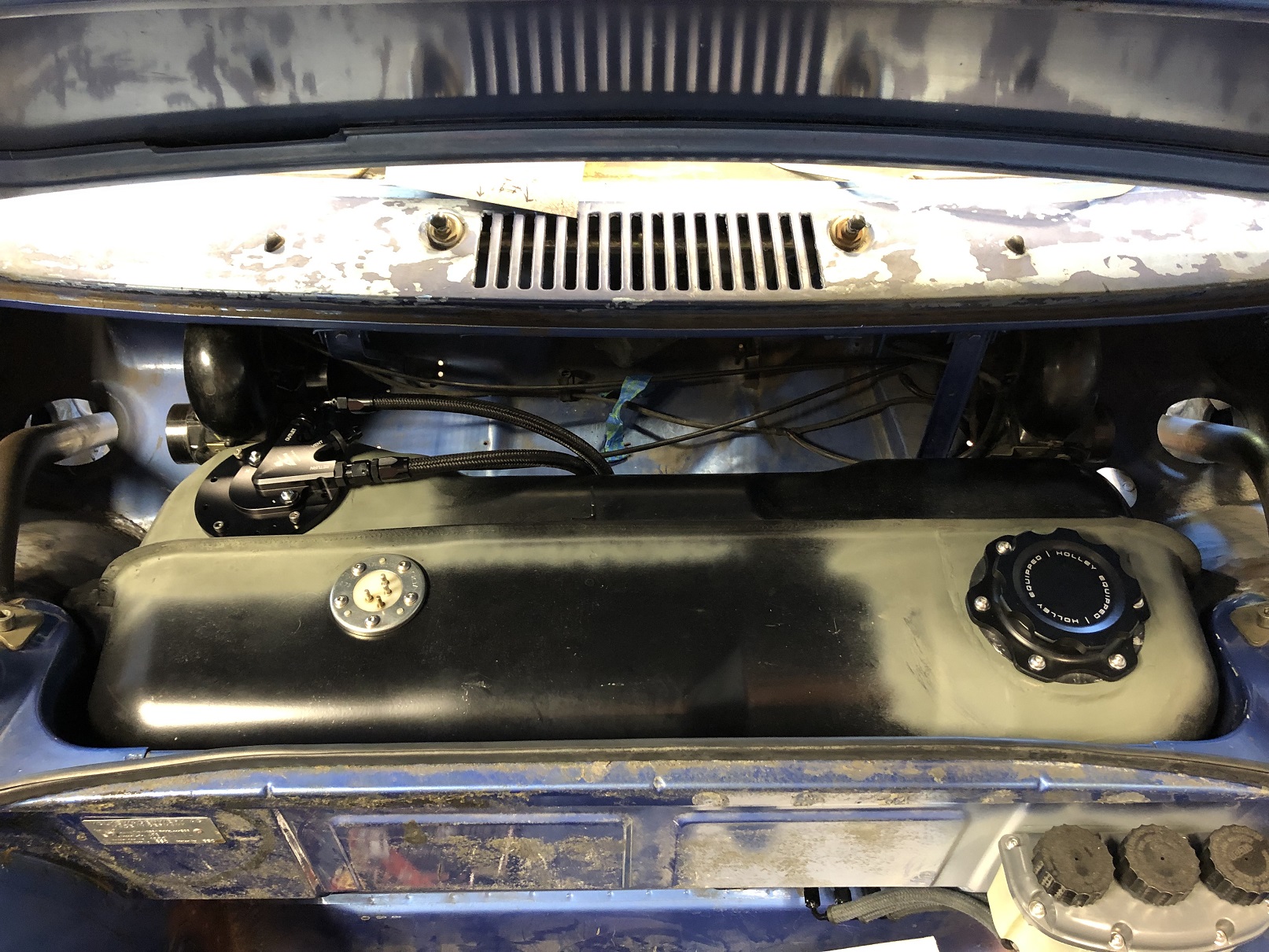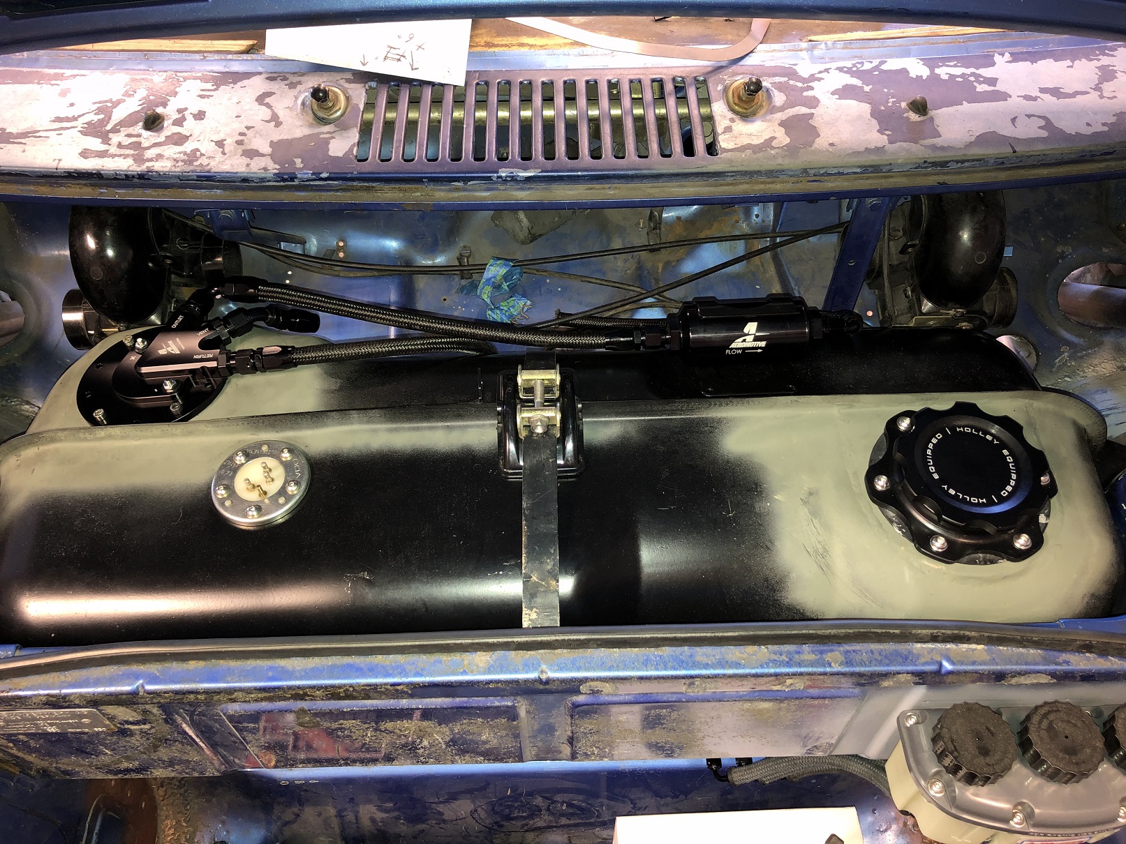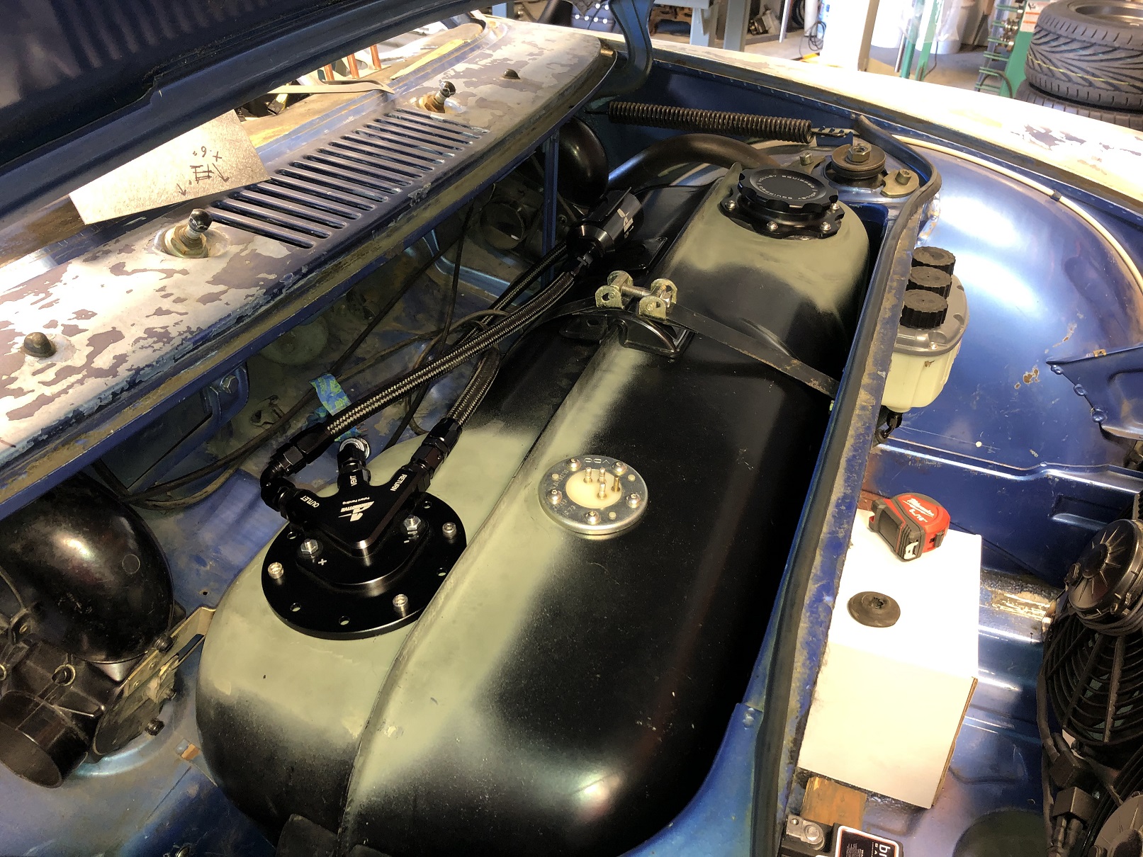 And in keeping with the "he's making it up as he goes along" method, I realized I hadn't fully accounted for where the fuel filter would mount. I played with somewhere in the engine bay but ended up going with right on top of the fuel tank.