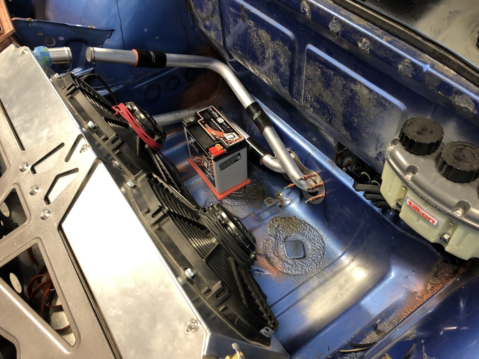 Planning and mock-up for radiator hard lines. The hoses are just to help size the lengths of the straight sections. The plan at this point is that both will be one piece from the hose connection at the radiator and through the bulkhead panel. It looks like I can fab a bracket to support things so the connection to the Gates hose happens just behind the steering rack.