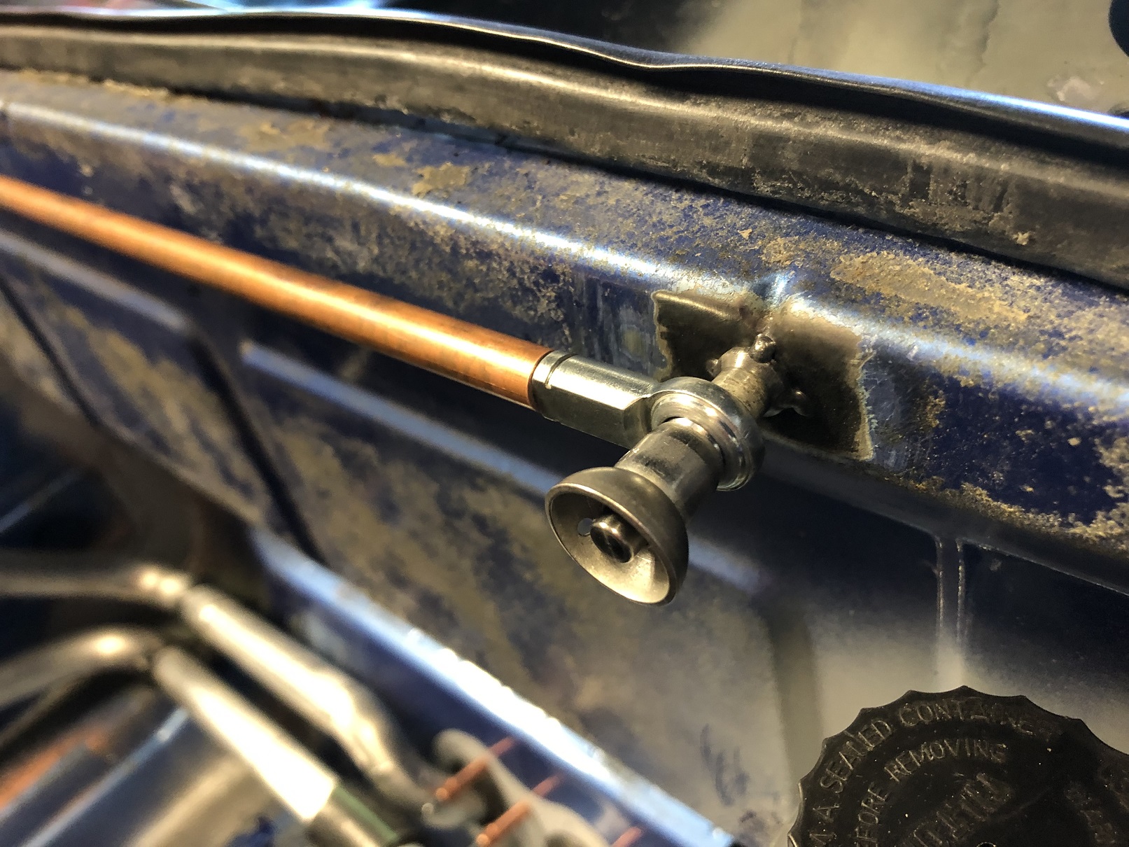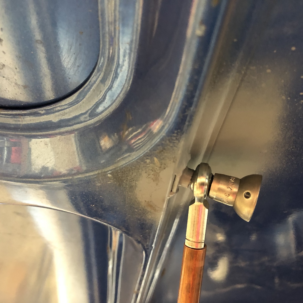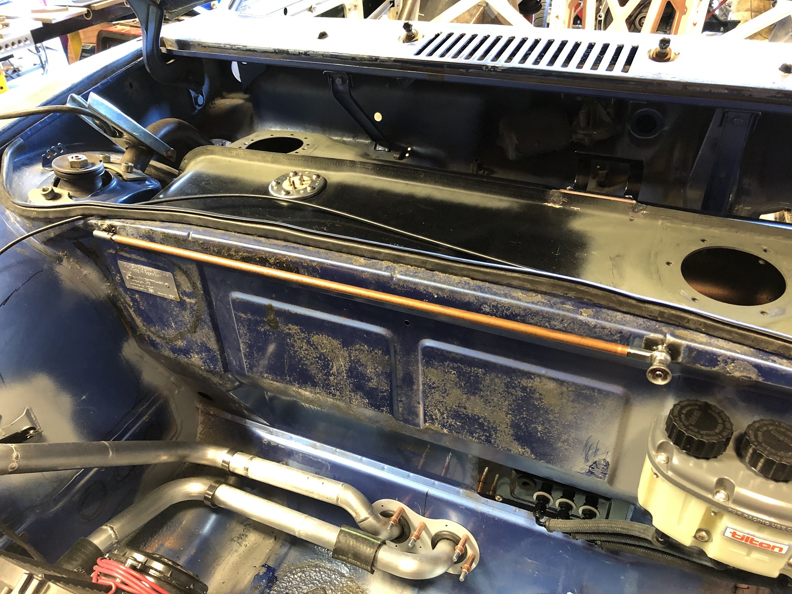 So I came up with what I think is a neat solution: I used a pit pin and welded an appropriately deep boss to the fire wall and one to the under hood bracing. A quick press on the button and the pin pulls out. Swing the rod up and use the same pin to attach the prop rod to the hood. Windy day at Cars and Coffee? Not a problem for me! And that's a copper tube over 1/4" aluminum hex. It supports the stock hood with no flex. If I get a composite hood, I can remove the copper and just run the aluminum. Attached thumbnail(s) |