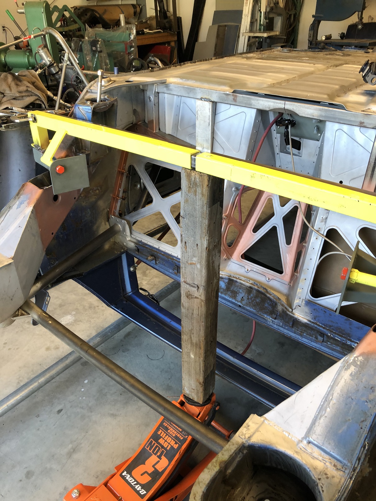 The sleeve that aligns the two sides of the fixture does have a bit of movement. Let's be fair: it's a tube slipped into a tube, not a precision milled clamping device. And it works just fine. That said: When the fixture is in the car and the car is right side up, any play in the sleeve sags the inside of the two parts downward, "adding" negative camber. If your car is on a rotisserie, and you work on it upside down, any play "removes" negative camber. I need to combat that on all fronts! (IMG:style_emoticons/default/ar15.gif) Jeff measured 1.375 and 1.5 negative camber ahead of final welding. I have 1.6 and 1.7. My chassis will never be a race car so this seems well in range for me. That said (and save your "Dude, that's a bit hillbilly!" comments. I know it is), based on the static measurements I had ahead of final welding, I wanted to "encourage" any welding-induced distortion to add negative camber and toe in. So, to encourage the toe, I used a small spacer between the fixture and that bar clamped to it. For camber, the 4x4/floor jack removes the play at the sleeve and helps camber stay where it is, maybe add a bit more as it's being welded. And it's not like the car is supported by it! It's just pushing out any sleeve play, plus a bit of force. Finally, as mentioned, the weld sequence is outside/top, inside lower to further encourage negative camber. Attached thumbnail(s) |