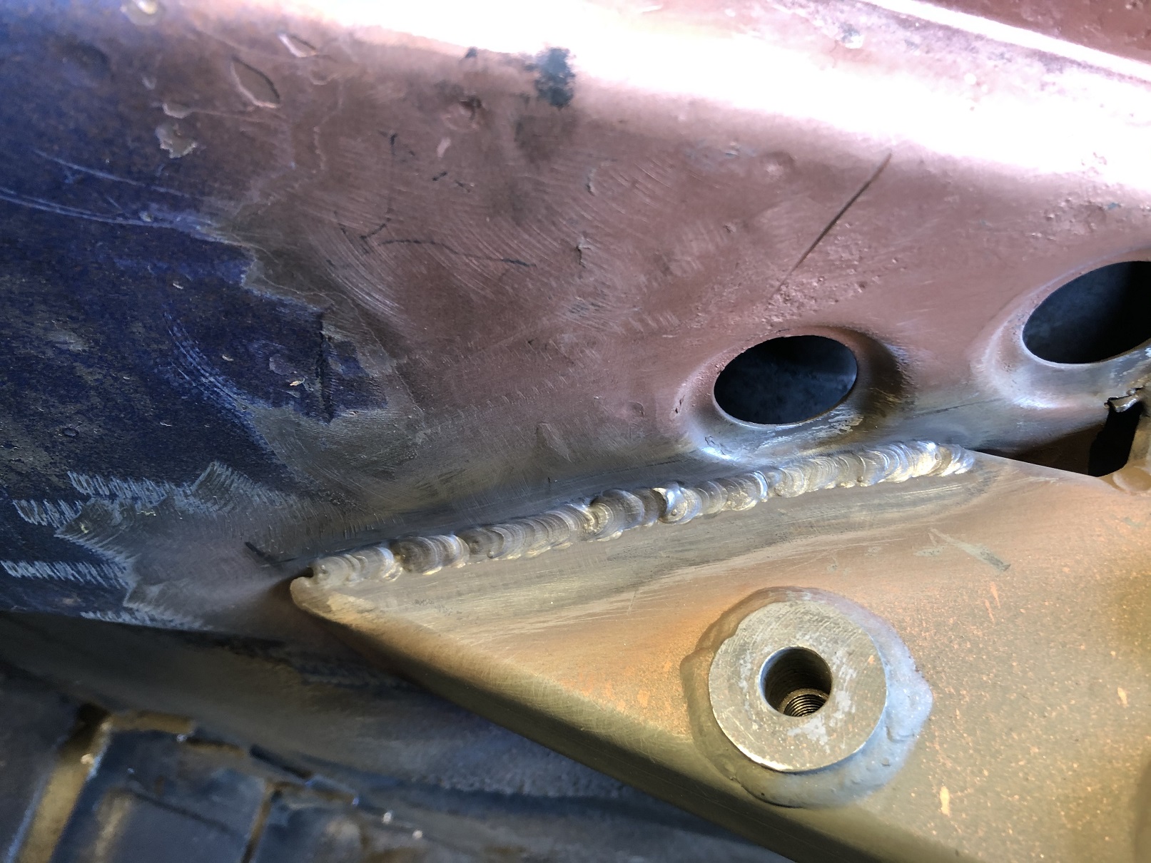 great documentation..welder up Well, OK then! My TIG skills seem to be improving every day. It's always fun welding .125 wall tubing to .050 sheet metal. The long is double layer in this area but there are random, small gaps between the walls so things will be going well and all of a sudden "BOOM"! Hole blown. But this section went well. But you'll see no pics of the couple of minor spots that didn't! (IMG:style_emoticons/default/shades.gif) Most all of these areas get covered up with the sheet metal support structure so no biggie on how they look, so long as they are strong. Best of all is that after welding all the seams, I installed the trailing arms and the camber checks the same as before final welding. HOO f-ing RAY! Attached thumbnail(s) |