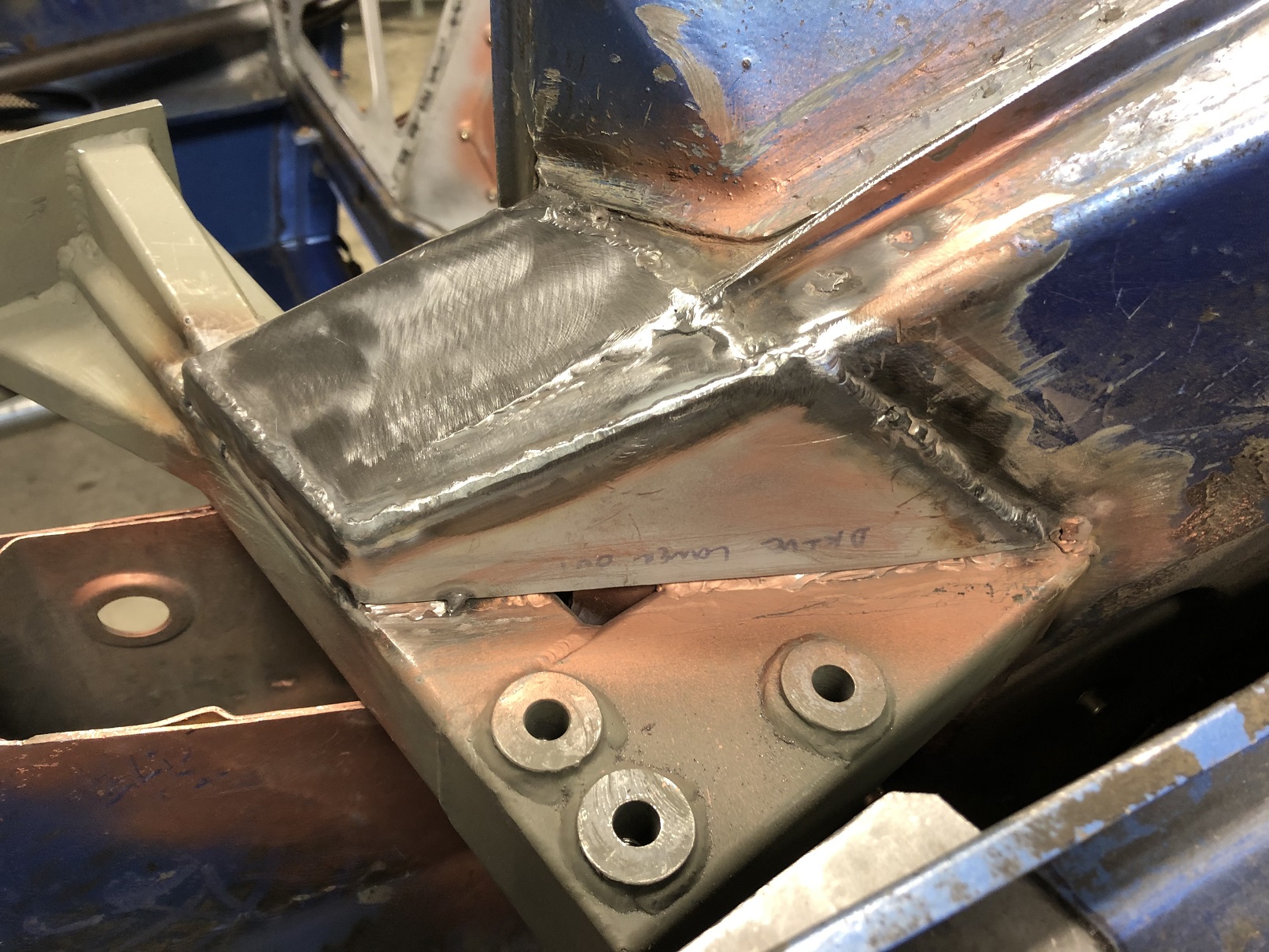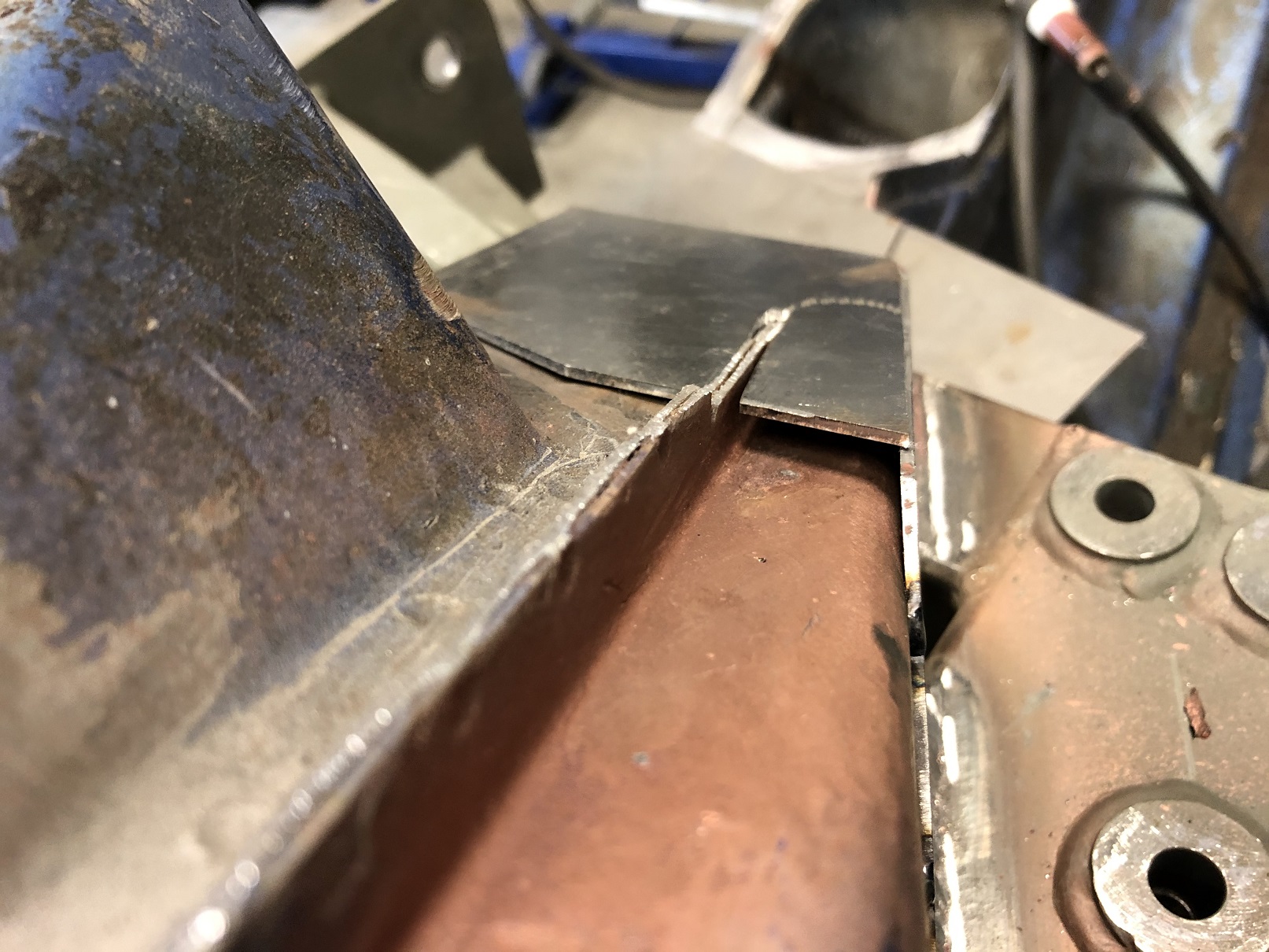 There are a number of options for how these two pieces can be fit. I opted to slice a slot down the length so the plate would sit down around the long's pinch weld flange and fit flush against the long at that forward edge. I then welded along the slot, fusing the plate to the pinch welded flange of the long. Attached thumbnail(s) |