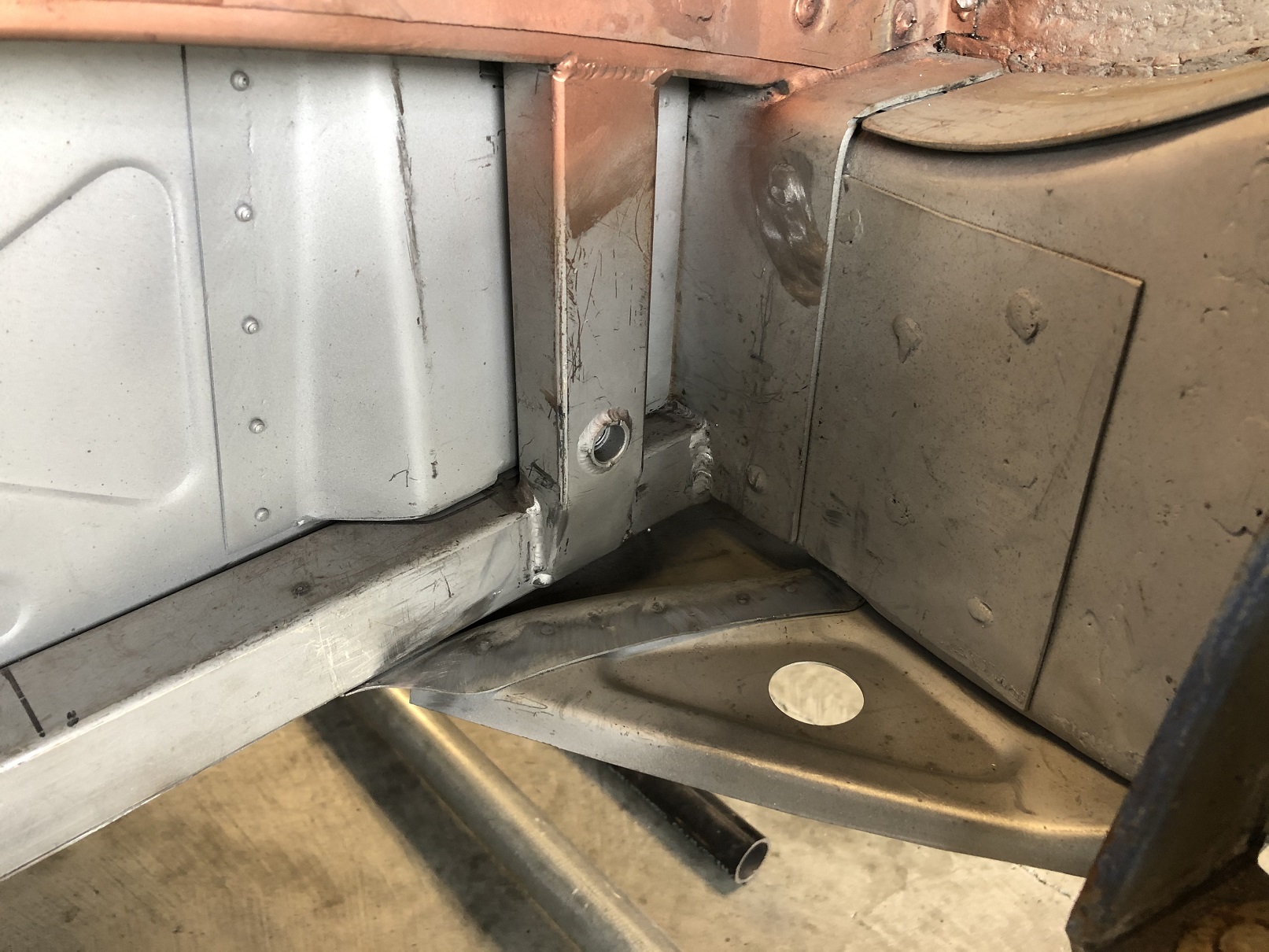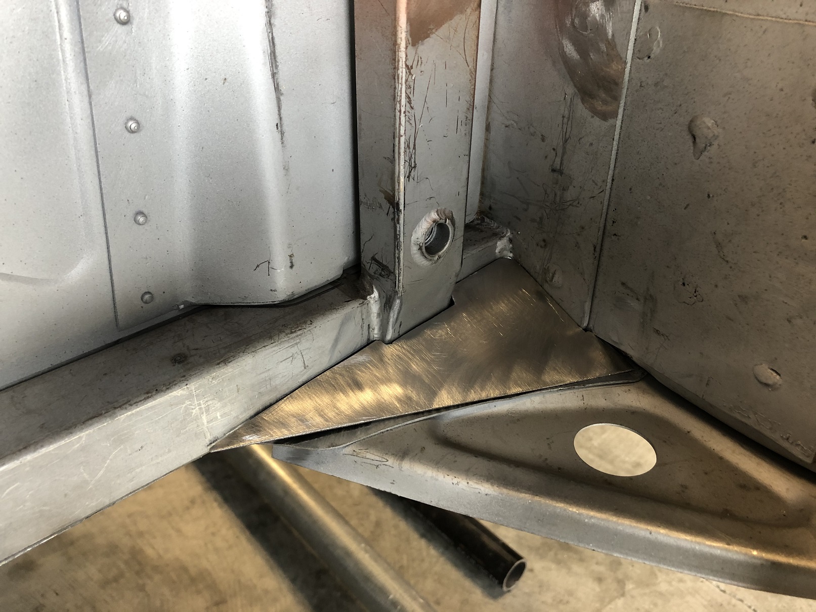 You can see the shape of the factory floor panel means there's a gap between it and the lower cross member, which leaves a nice little passageway into the interior. That won't do! A quick cardboard template transferred to sheet metal, some trimming/fitting and it's ready to weld in. Repeat on the other side. Attached thumbnail(s) |
