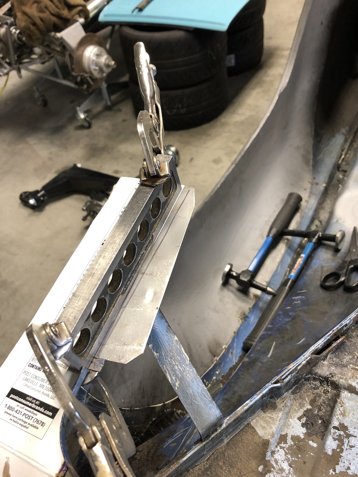 Yes, I swapped the position of the dolly and clamps. I did this to allow the hammering angle I needed and to get to the entire flange. Really though, once you get the flange started, it's no big deal to move the dolly around. Just be sure it's clamped fast and firm into the corner you started before you continue tipping the flange. Attached thumbnail(s) |