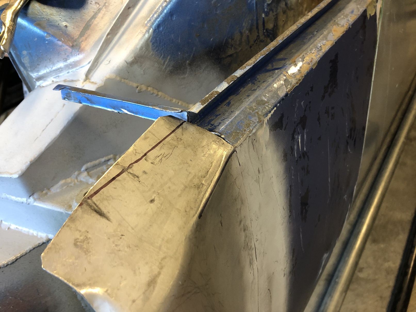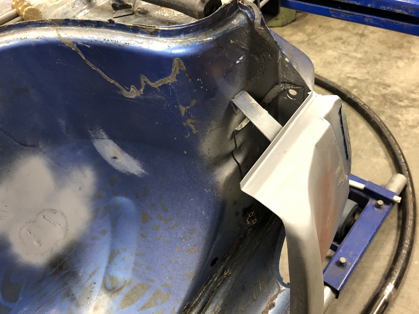 Today it was another of the flare corners. I must be out of practice - I neglected to take any pics of what I did. All I can do is show the other side to give an idea of the before/after. Here's another example of what the corners look like: wrinkly and folded over on itself. Wait...that sounds like what's happening to me! (IMG:style_emoticons/default/lol-2.gif) You can see it's the same story with the flare corner not being crisp or being anywhere close to the shape of the chassis, no flange, etc, etc. Attached thumbnail(s) |