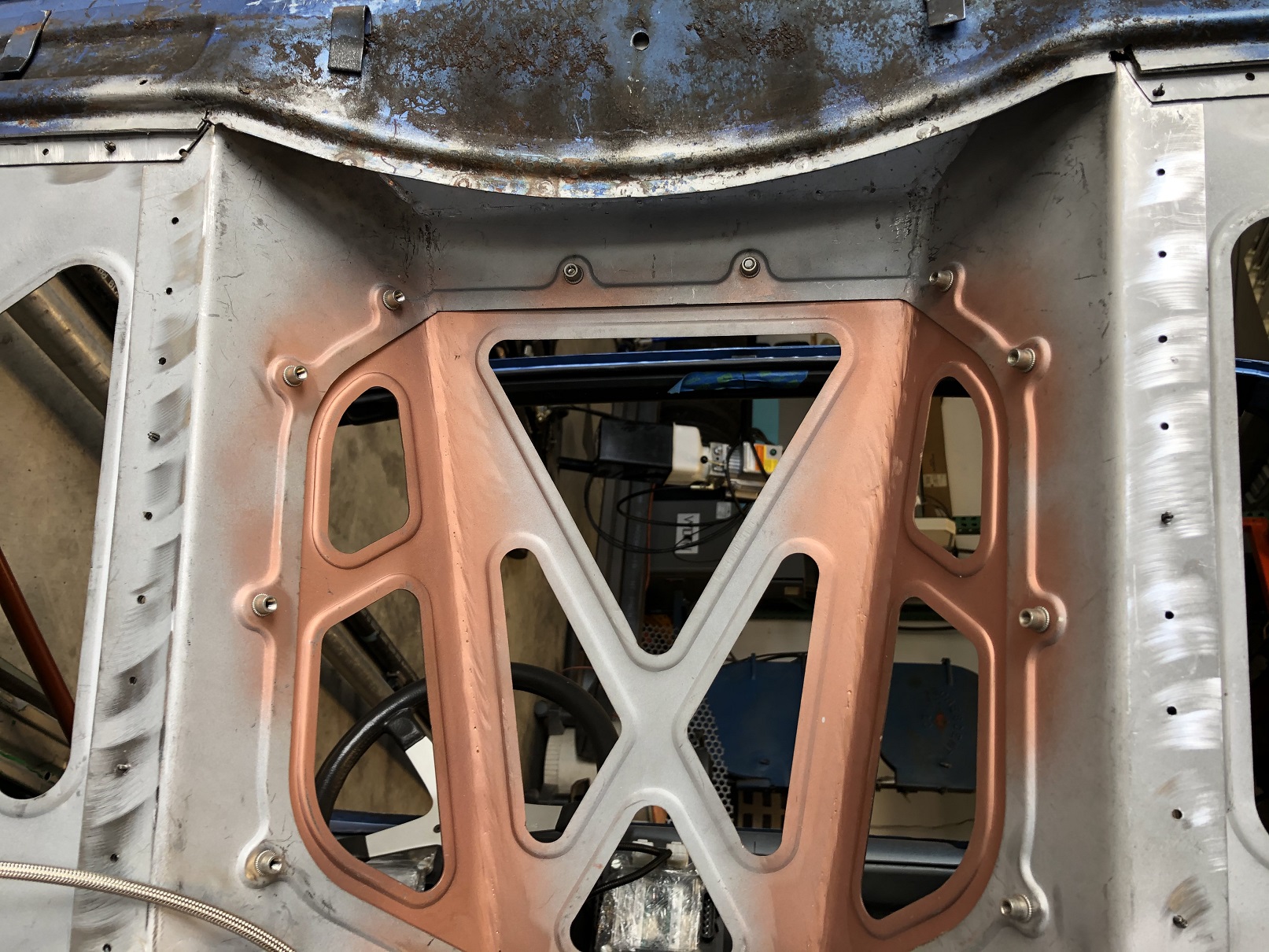 Today was fabbing a piece to close off between the engine compartment and interior. This opening was created when I removed the stock firewall and added the removable access panel. I need to seal off between that curved top area of the firewall and the upper portion of the access panel's frame, just above the upper attachment points. Attached thumbnail(s) |