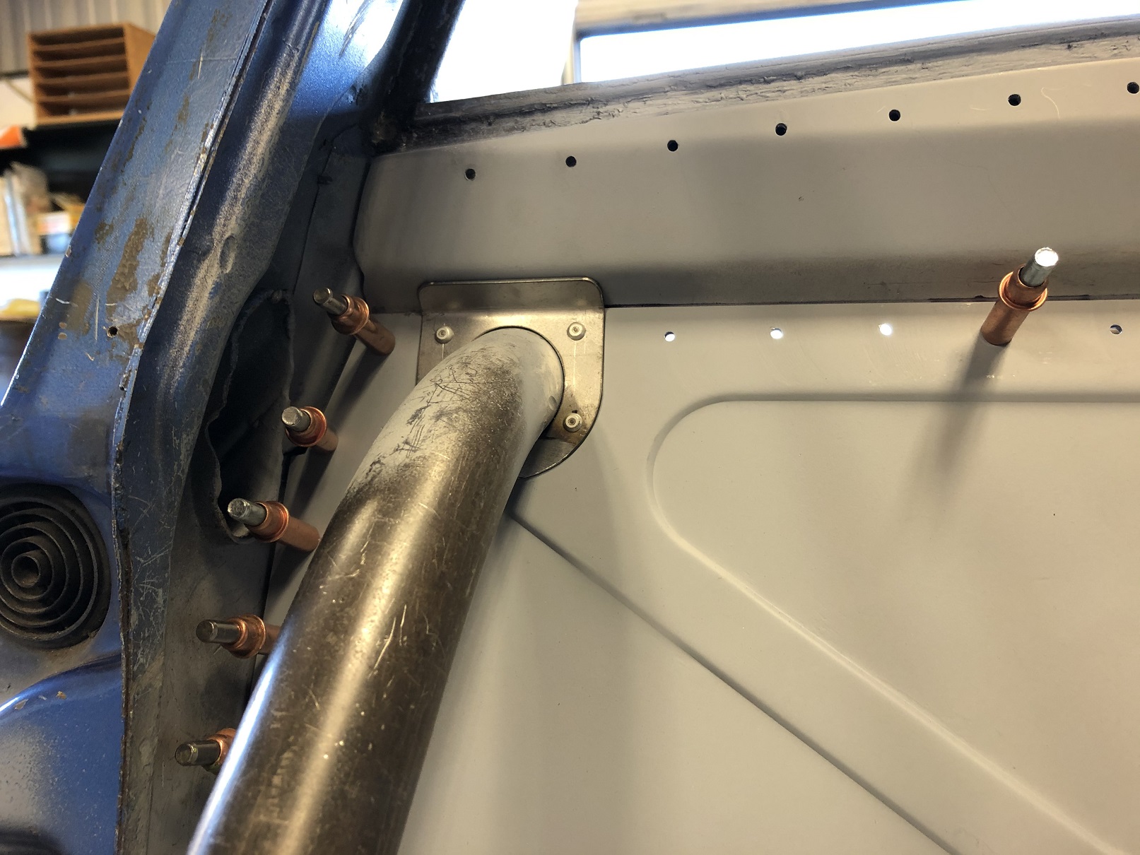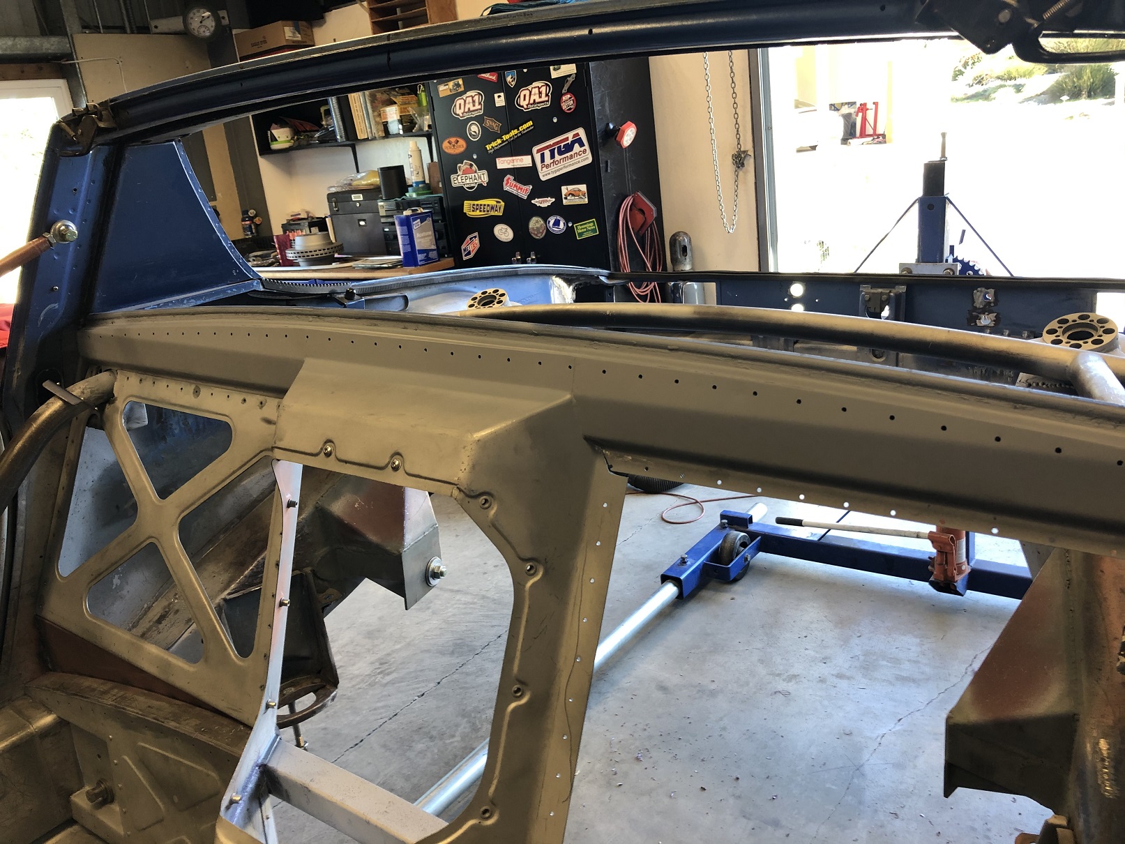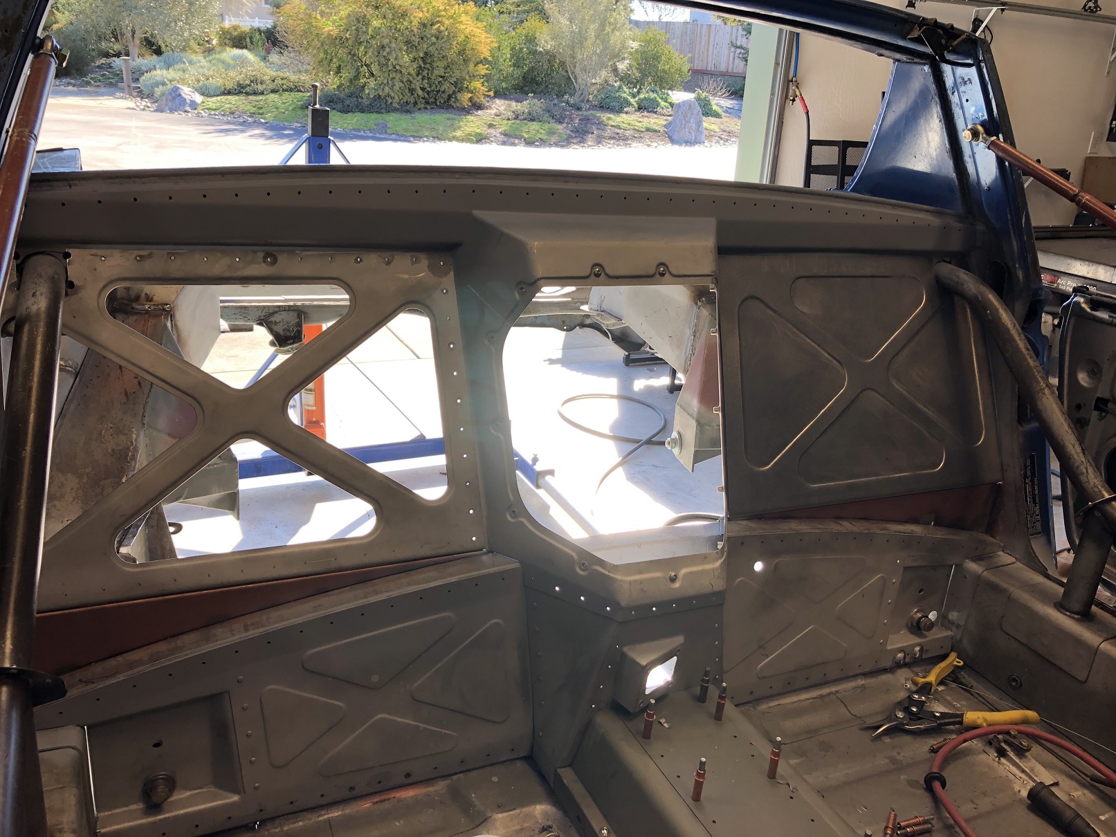 Amazing work as always. How did you avoid bonding in the Cleco's? Never mind...went back and read the previous posts. Not bonding where the cleco's are. Is this going to be possible for the new back panels? Actually, there's adhesive EVERYWHERE! Once the panels are in place and all the Clecos are in, I go back, pull them one at a time, run a bit of welding rod through the hole to remove as much adhesive as I can, rinse the Cleco in acetone and wipe it down to be sure it's as clean as possible, then reinstall it. Then, once everything is cured, I redrill the holes to remove any excess. The holes are currently 1/8". The structural rivets need a bit larger hole so once the chassis is blasted and primer/sealed, I'll drill the holes to the final size, then install the rivets. |