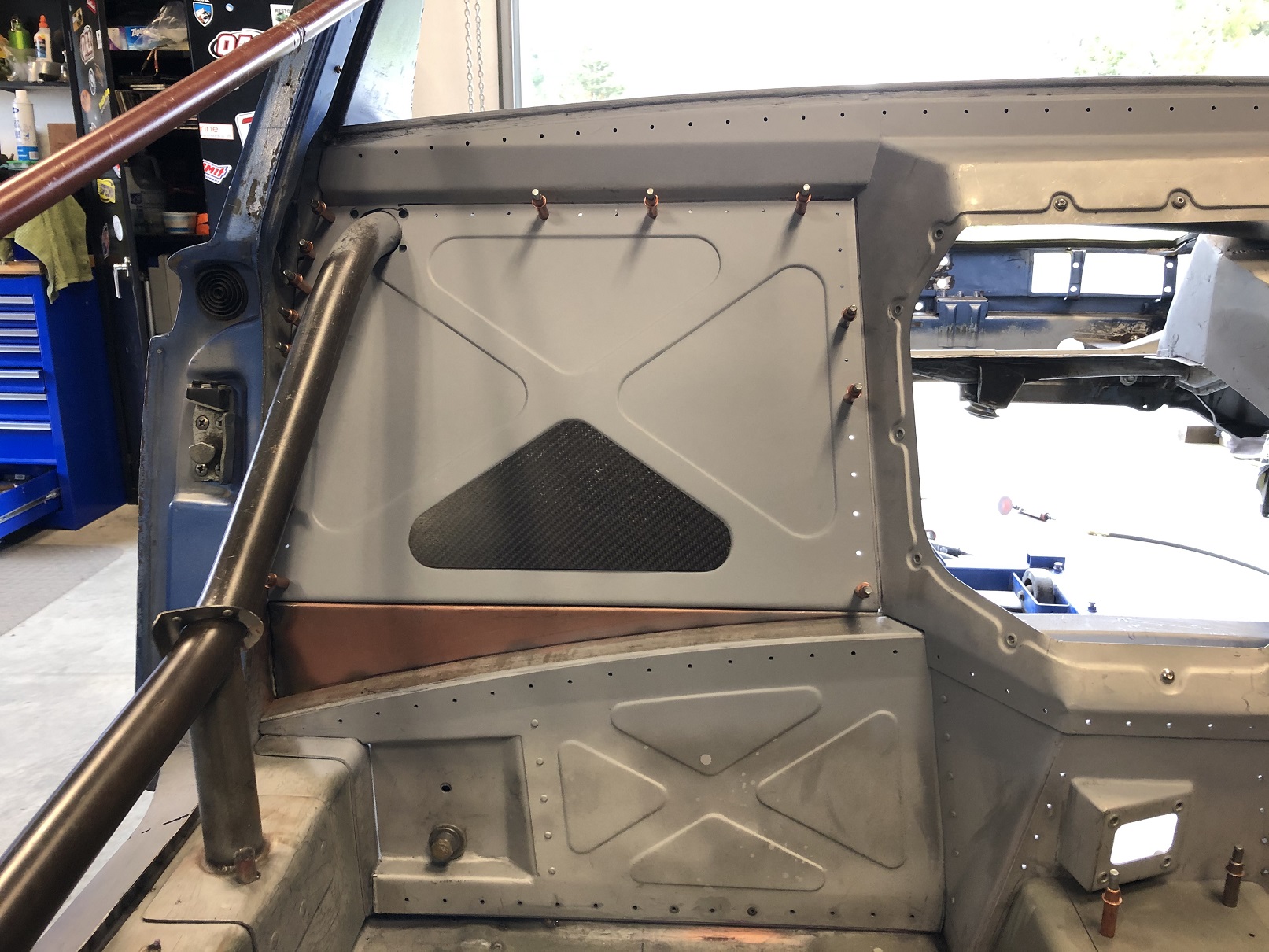 After thinking about the fire wall for EVER, I caved in to what will be safer and went all steel vs steel w/the carbon fiber inserts. I cut new main panels, updated the stamping dies as needed and ended up with what you see on the driver side. Passenger side still in progress.