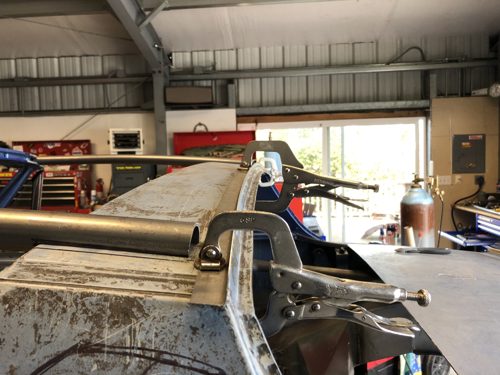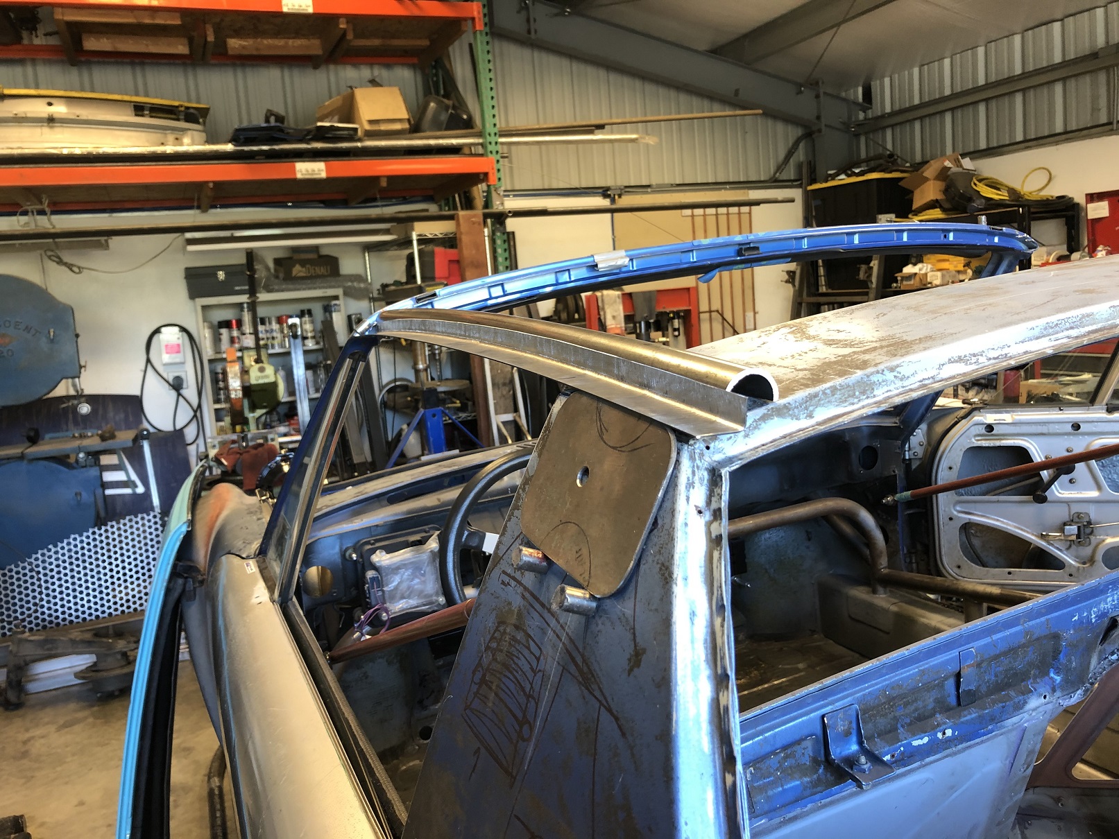 Initial fitting of the outer rail-to-windshield plates. Both sides are tacked in, ready for final trimming and welding.