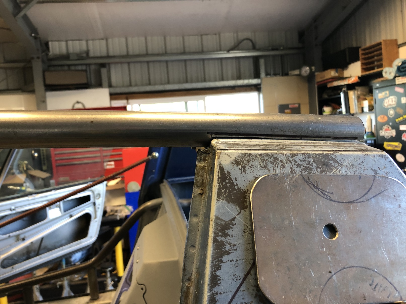Rough fitting the first side rail bar. At the front, I'll make two small plates - one for each side of the tube that welds to the upper and lower lips of the windshield frame and then to the tube. I still have some trimming/fitting of the notch at the rear to be sure the tube fits under the roof skin. that is crazy cool. |