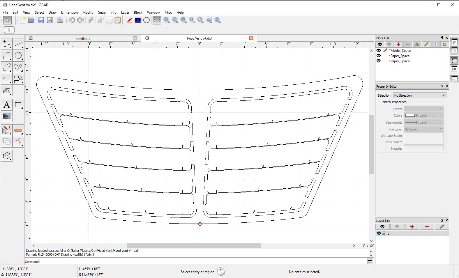 No offense to the approach of "cut the front and sides then bend down the flap to create the vent". I just wanted something different from that so it was back to CAD to see what I could come up with. The first pic is a piece I made just to get a REALLY rough idea of what things might look like. The CAD drawing is what I'm going to cut later today. Note the vents remain attached to the frame via those small-ish connections on each side. The vents will be twisted at those points and set to the proper angle. The small notches at the front edge of the vents is where a piece will fit in that locks them to the desired angle and adds stability. The whole contraption will attach to the underside of the hood. Let's see how this works out. Attached thumbnail(s) |