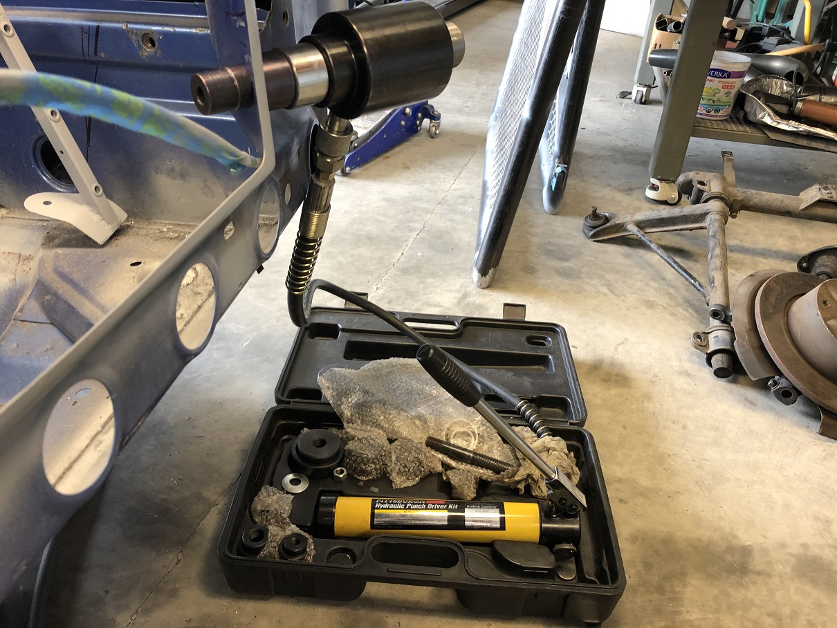 Then I use a knock-out punch to cut the appropriate hole needed for the dimple die. I use a Harbor Freight hydraulic pump set up. It works wonderfully. The knock-out punch set as well as the dimple dies are from SWAG Off Road in Oregon. Great stuff!