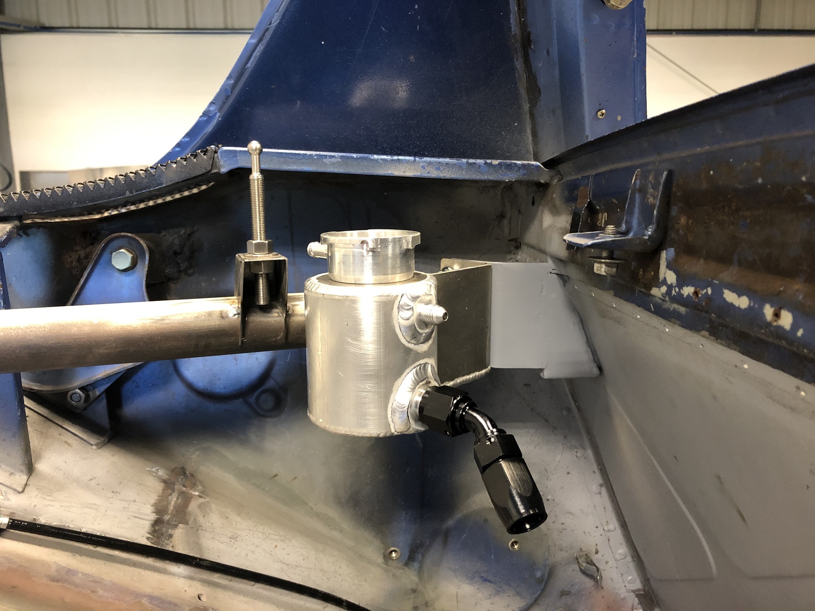 Where possible (and reasonably practical), I want to eliminate traditional hose clamp connections in favor of AN fittings. So on the expansion tank, the hose barb fittings were lopped off and AN bungs welded in. Martin's TIG work is just incredible...