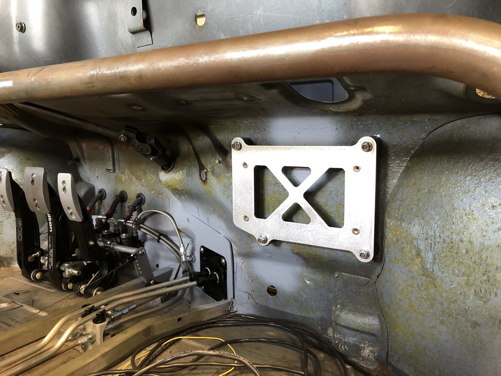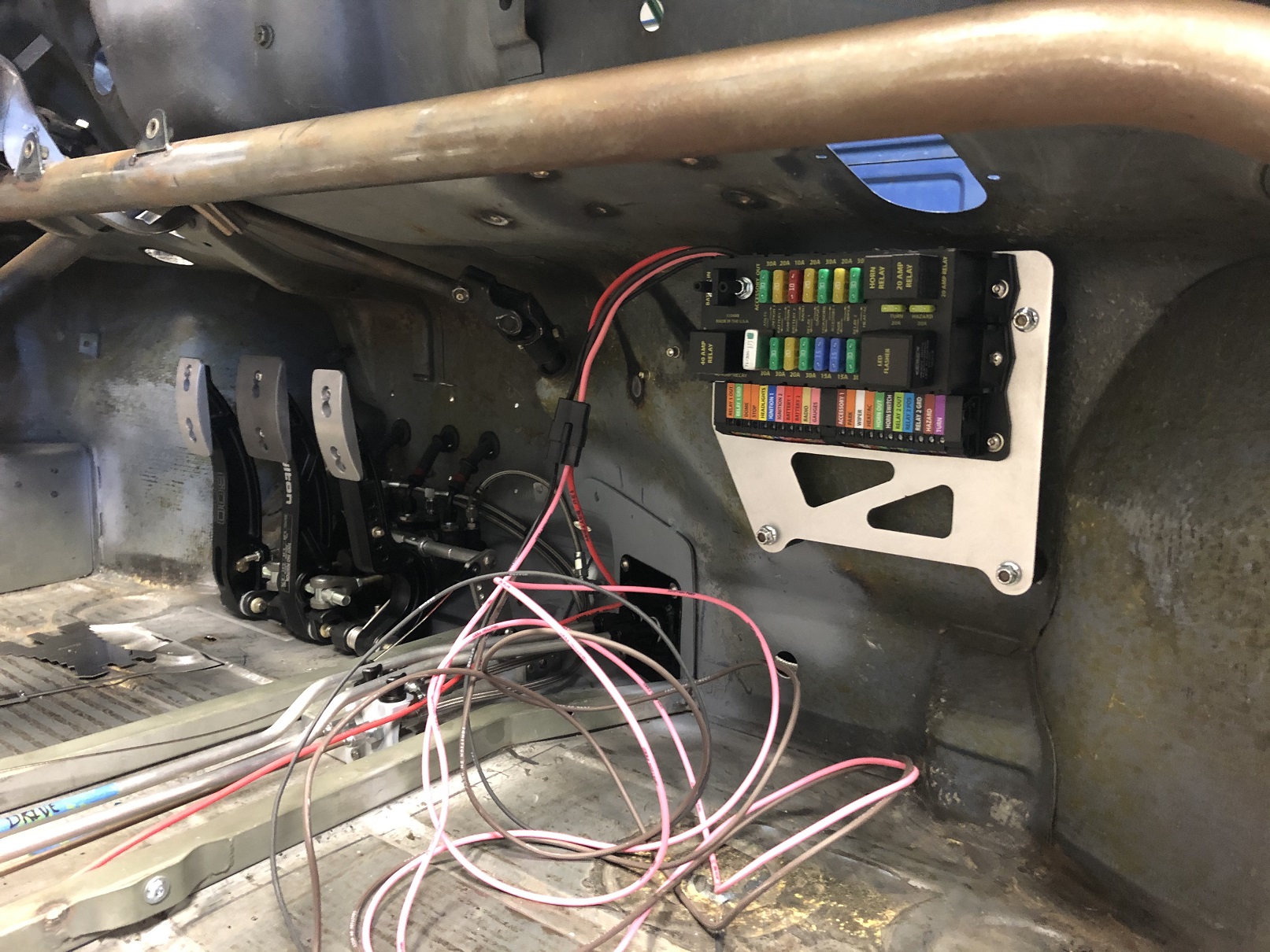 The chassis harness arrived earlier this week. The first order of business is mounting the fuse panel. I figured since I'd already created a panel mount location in the passenger foot well for the V1 electronics, I'd fab a quick mount and see if this location might work.
