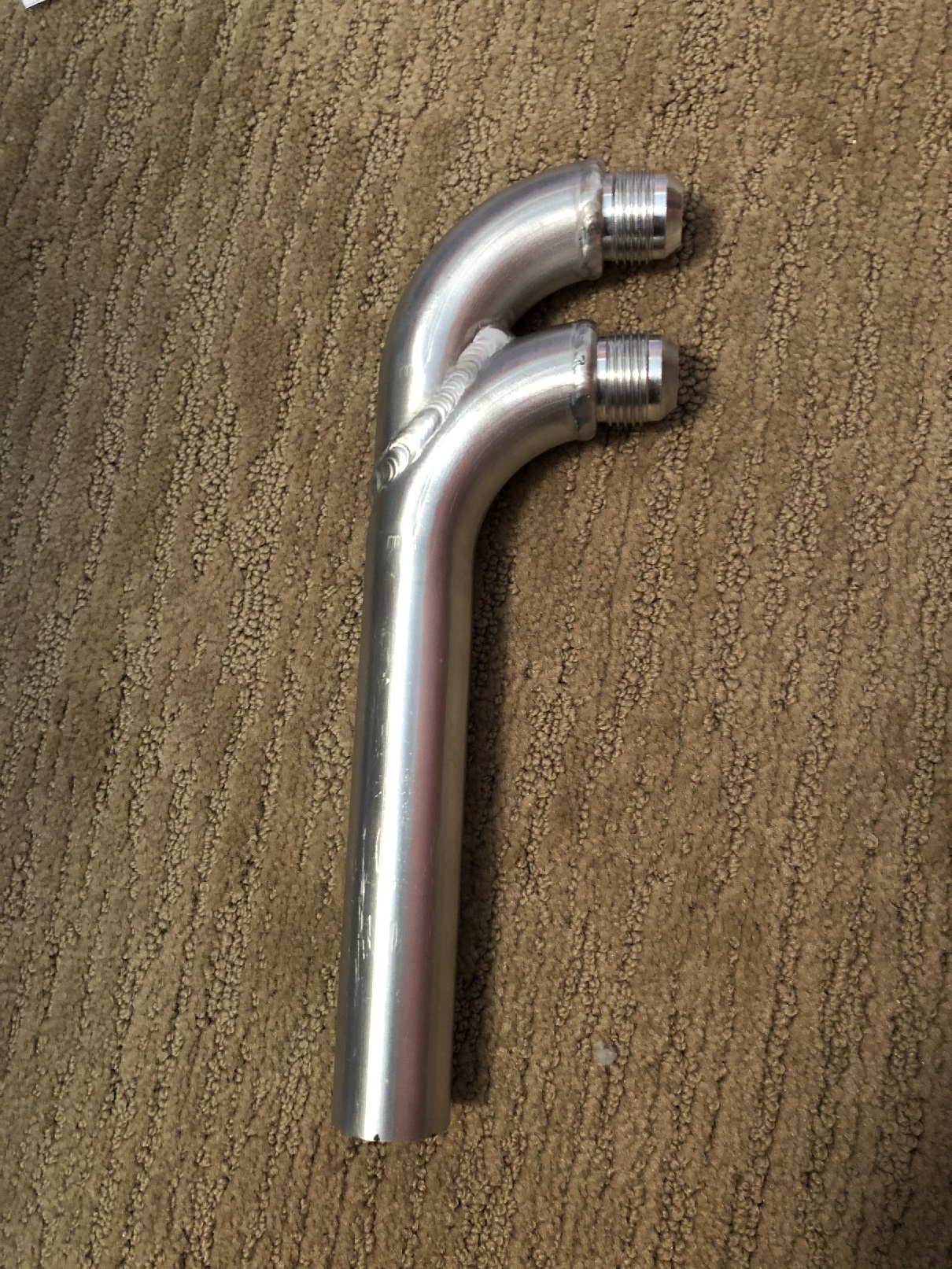 Take two 90 degree, 1.25" .065 wall aluminum tubes, same stuff I used for the hard lines in the frunk, do a bit of slicing and dicing, weld on the AN bungs and BOOM: a custom water line collector! I'm no fluid dynamicist but I have to believe this is better for flow than inlets that are 45 or 90 degrees to each other. Plus, it looks pretty cool. Attached thumbnail(s) Attached image(s)