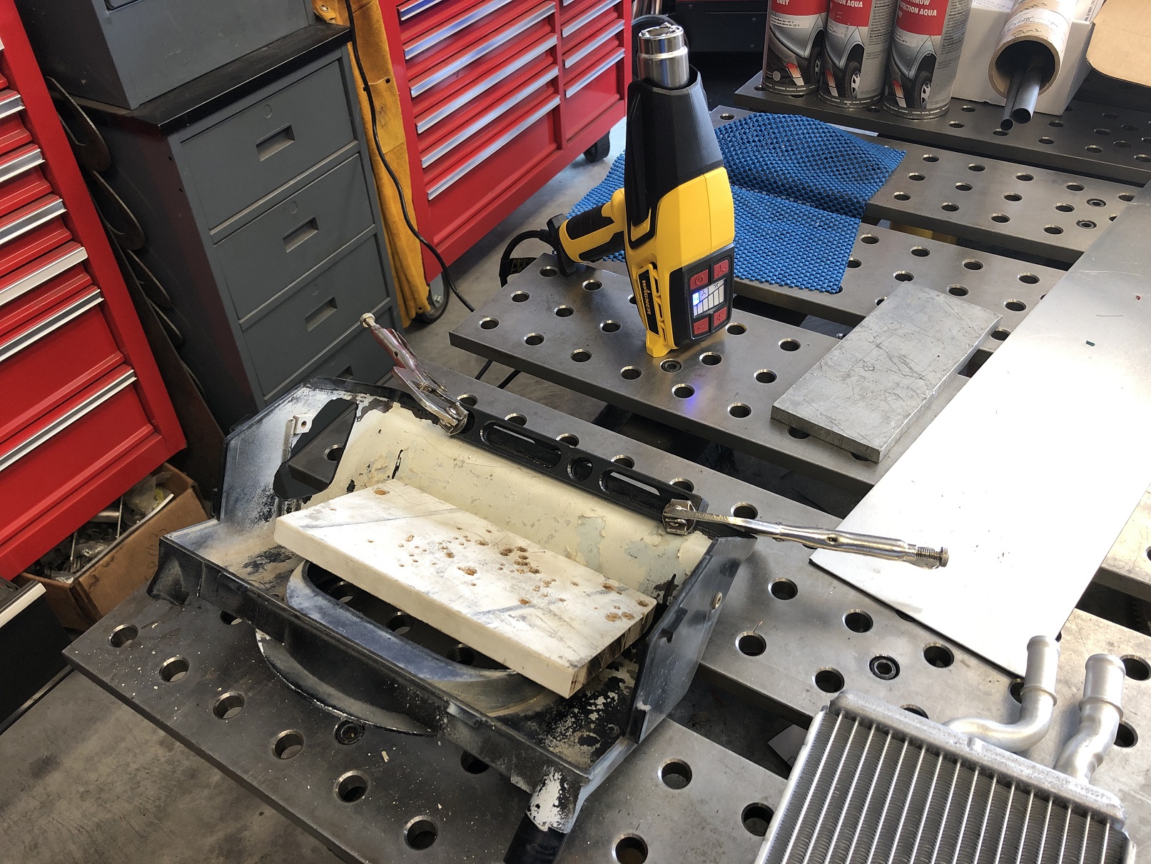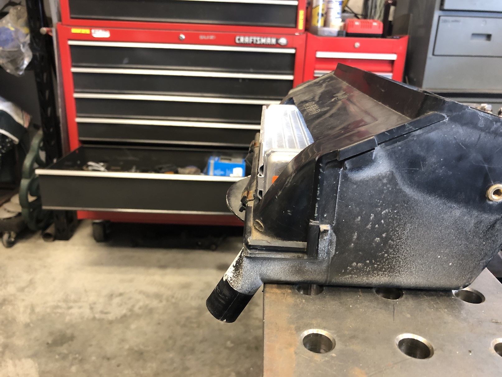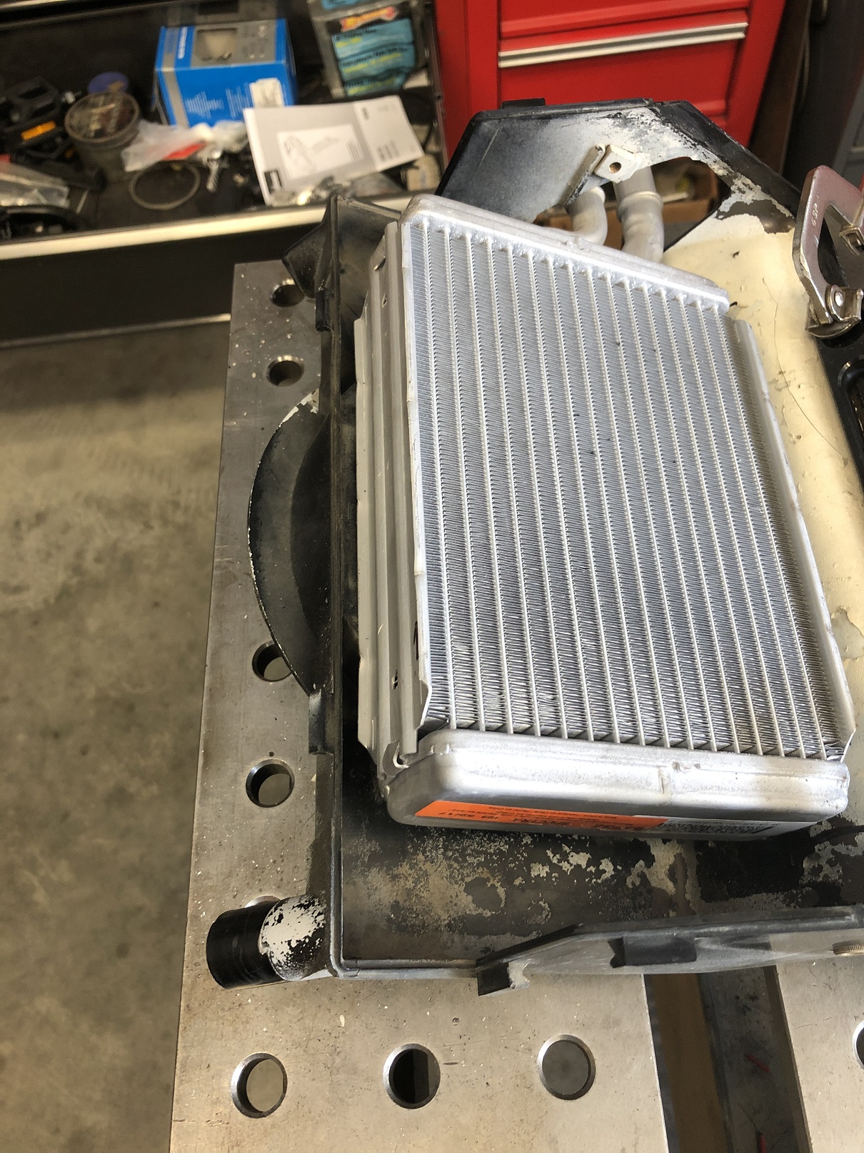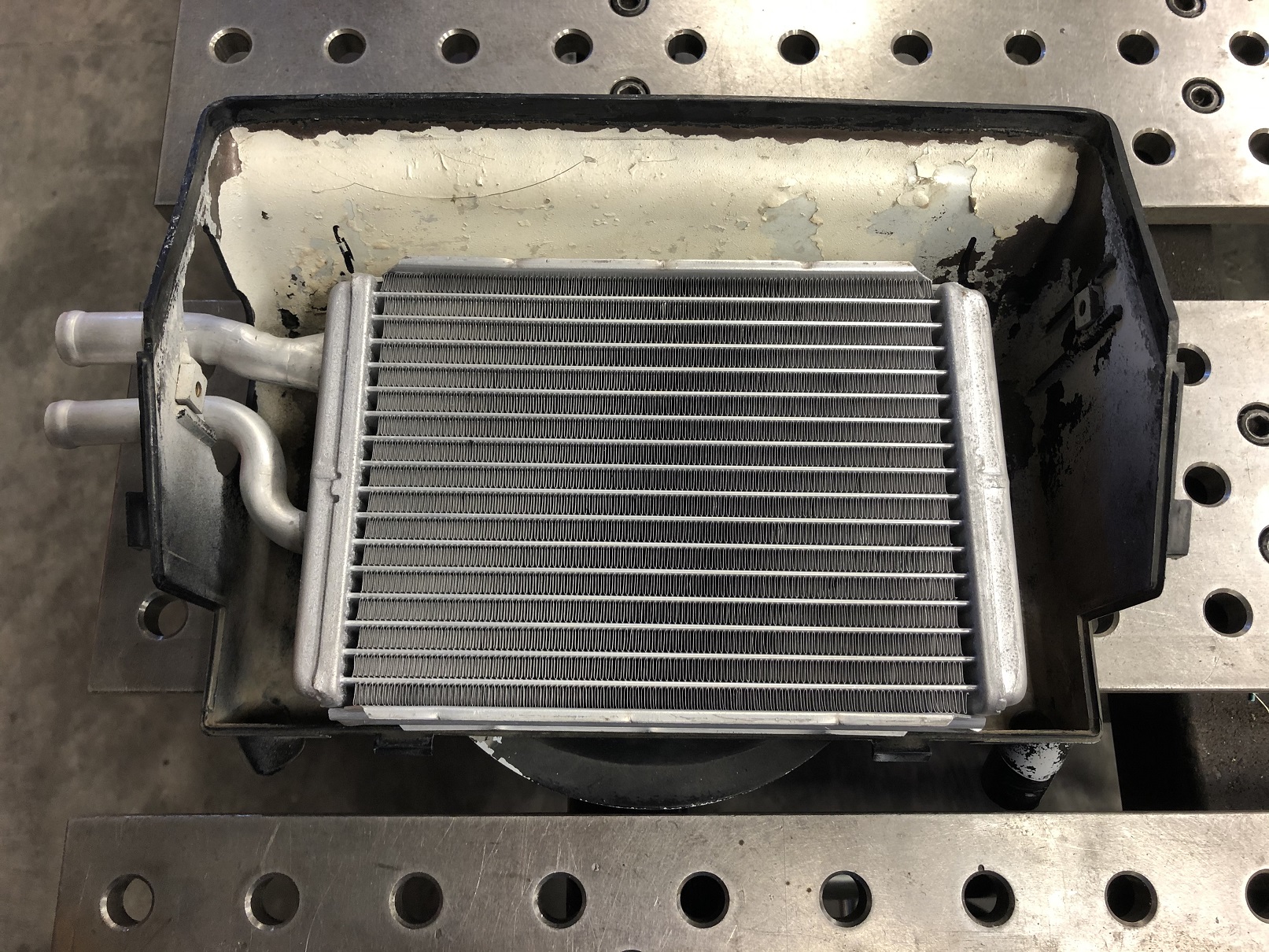 I saw the old thread about this and liked the set up that uses a '94 Mustang heater core as they "fit" inside the fresh air box. Well, OK, after some minor surgery, they fit... I have a couple fresh air boxes so I figured if I screw this one up, I'll call it V1, claim it was practice, etc. Here's what I did: First, chop off the raised area around the opening on bottom. Then clearance for the in/out water lines. Yes, I went way overboard on the clearance. I'll do better next time... Once that's done, it turns out the heater core is a bit too deep - with the core pushed as far back as it can go, the front sticks out just enough that it doesn't allow the top to fit back on. Attached thumbnail(s) |